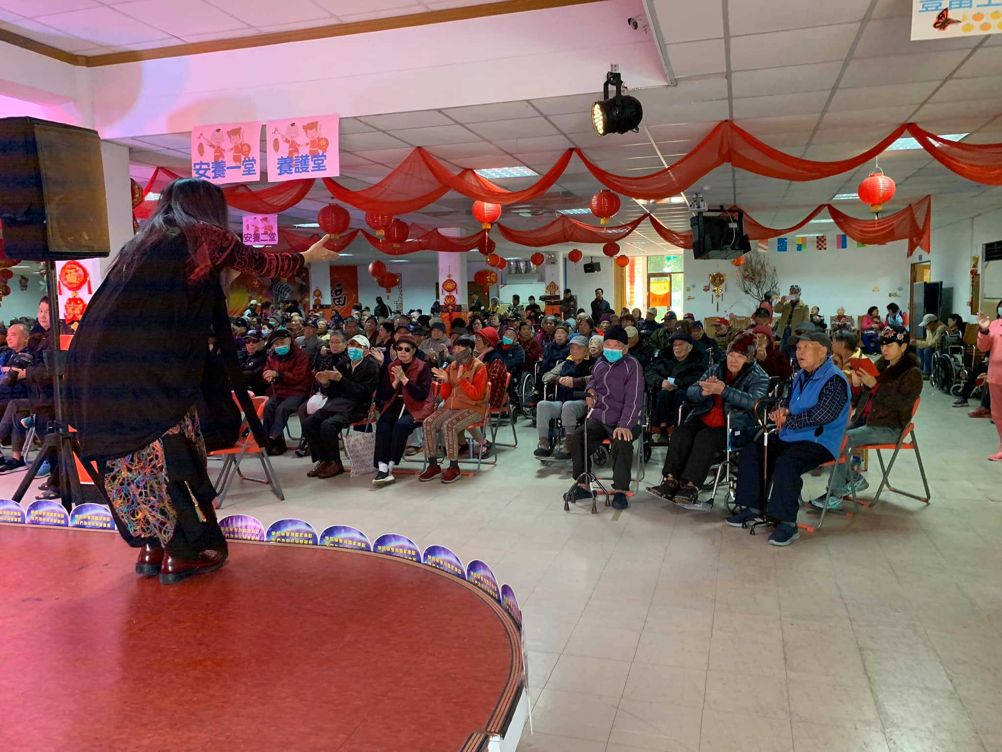 「鼠歲喜臨門,榮家迎新春」,八德榮家於今(20)日辦理春節聯歡活動,明星藝人向娃、曾淑勤、桃園巿政府及多位民意代表與榮民長輩一同互道吉祥如意年年好,精彩的表演節目,還有摸彩活動,讓榮家長者笑聲連連,溫馨氣氛增添許多年節味。 八德榮家長輩今日400多人齊聚一堂,桃園巿政府贈送每位長輩新年賀禮,藝人曾淑勤演唱招牌歌曲「魯冰花」,向娃以「熱情的沙漠」、「我的心裡只有你沒有他」等動感歌舞表演及幽默言語將長輩逗得笑呵呵,現場掌聲及笑聲不絕於耳。古道中主任在現場感謝桃園市政府補助活動經費、藝人朋友賣力演出,也感謝立委、議員、里長們加碼摸彩品項,為榮民榮眷帶來豐富精彩的年節活動。 八德榮家古道中主任平日巡視榮家,時常逗樂榮民長輩,笑聲滿溢。古主任表示希望住民要笑口常開忘記煩惱,更要經常維持神清氣爽身體好。八德榮家在春節期間安排辦理「榮民樂揮毫,春聯贈里民」、「樂不思鼠玩翻天」、「鼠來富,賓果福」、「鼠歲笑聲甜,猜謎生活俏」等一系列活動,目的就是要長輩們樂開懷、展開笑顏,身健康、 心不老。 相關照片