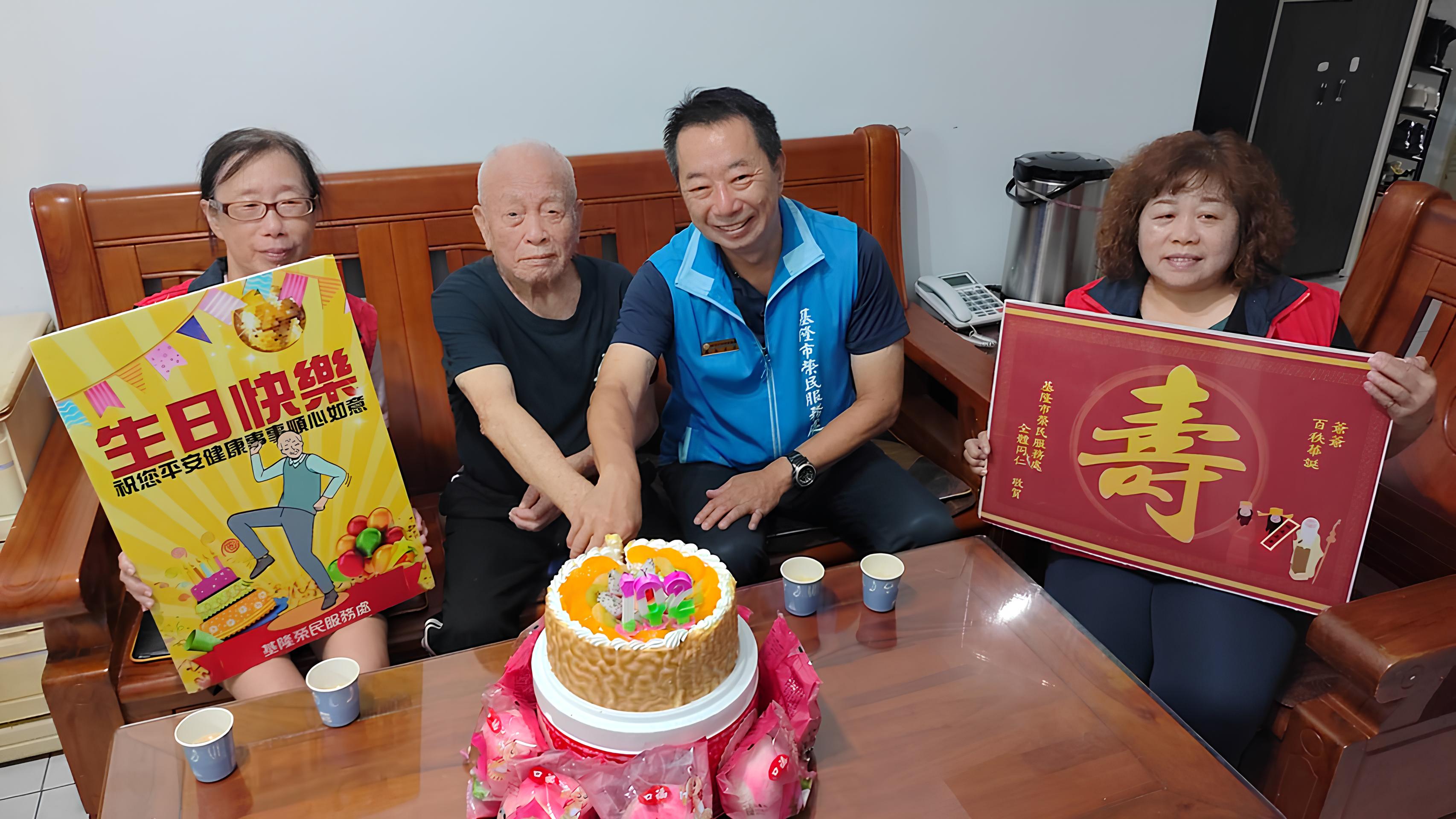 基隆市榮民服務處方正處長今(22)日率服務幹部及榮欣志工齊赴安樂服務區,共同為榮民吳威融爺爺歡度102歲嵩壽;方處長為吳爺爺準備了壽糕及壽桃,表達誠摯祝賀之意,場面溫馨喜氣,充滿幸福。 吳威融爺爺生於民國13年(1924年),江西省東鄉縣人,18歲入伍,歷經對日抗戰、剿共戰爭,隨後跟著部隊轉進到金門;吳爺爺思路清晰,非常健談,講話鏗鏘有力,他清楚地記得38年10月25日下午6點古寧頭戰役開打,隨即投身戰火,也打過42年東山島戰役,據他描述,戰時軍中生活極為刻苦,期間有時整月未進米飯,衣衫襤褸,由汕頭轉進金門時,看盡骨肉分離,生離死別慘況,不勝唏噓。吳爺爺多才多藝,48年在大膽島因傷退役後,曾在高雄與台北知名的白玫瑰、紅玫瑰理髮廳工作,手藝精湛,他也喜歡畫畫,家中牆上掛了二幅親筆畫的風景與動物油畫,至今已50多年,仍色彩明豔,畫面動人,與吳奶奶二人生活規律,鶼鰈情深,互相扶持照顧迄今。 歡樂慶生中,吳爺爺與大家分享蛋糕,場面溫馨。他體態健康、行走輕健,飲食起居一切正常,與處長閒聊時,仍不忘關切國家現況。方正處長除感謝吳爺爺過去為國家與社會的奉獻,也代表全體同仁獻上祝福,祝願吳爺爺伉儷身體健康,平安吉祥。