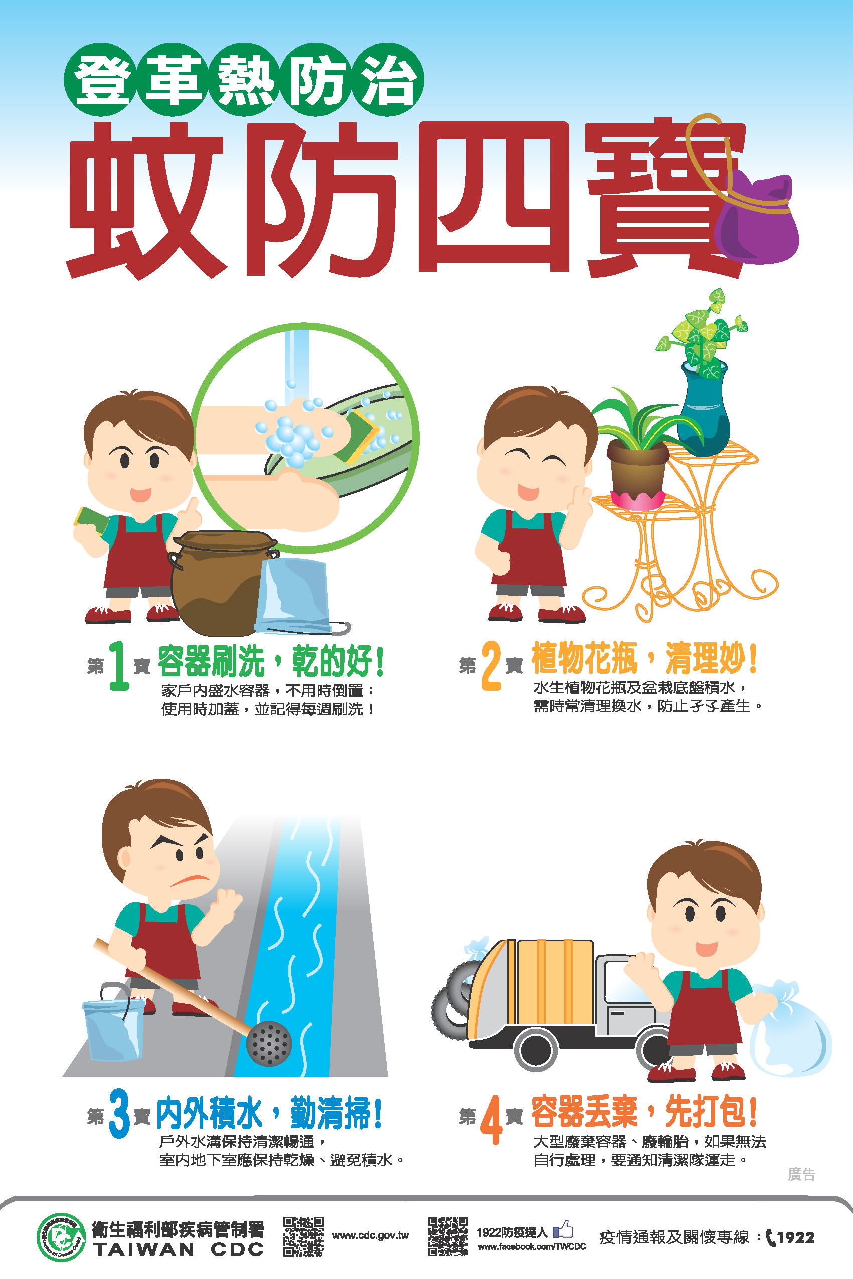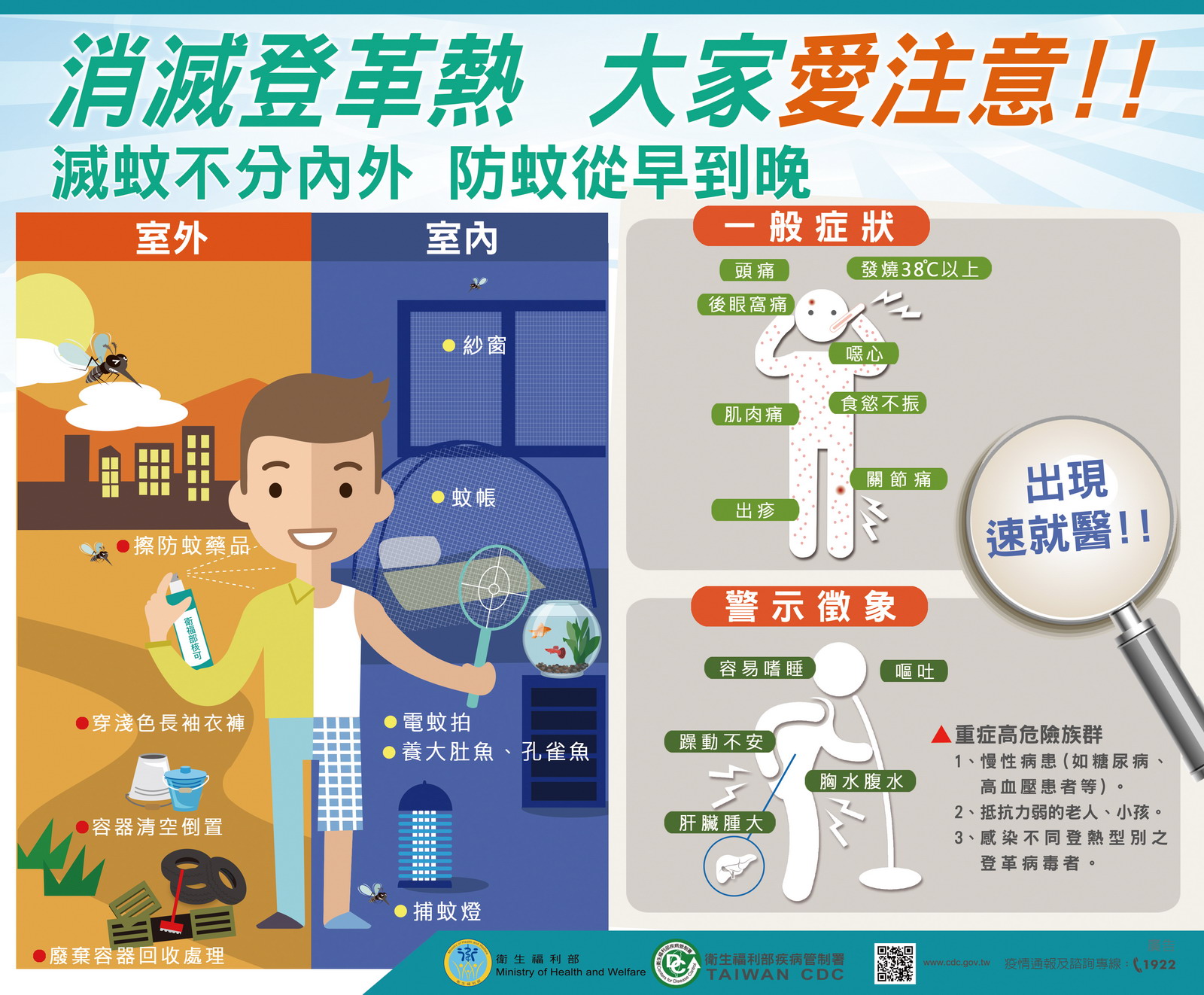 【登革熱來襲不可不慎】 依據國際疫情資料顯示,東南亞地區登革熱整體疫情仍處相對高點或呈上升趨勢。目前適逢旅遊旺季,榮民伯伯如前往流行地區應做好防蚊措施,穿著淺色長袖衣褲、於皮膚裸露處塗抹防蚊藥劑、居住在有紗窗、紗門或空調設備的房舍。返國後如有發燒、頭痛、後眼窩痛、肌肉關節痛、出疹等疑似症狀,應儘速就醫,並告知旅遊活動史;另請醫師提高警覺,如遇有疑似症狀患者或曾有流行地區旅遊史者,請立即通報,以利防疫人員進行相關防治措施。相關資訊可至疾管署全球資訊網(http://www.cdc.gov.tw)或撥打國內免費防疫專線1922(或0800-001922)洽詢。