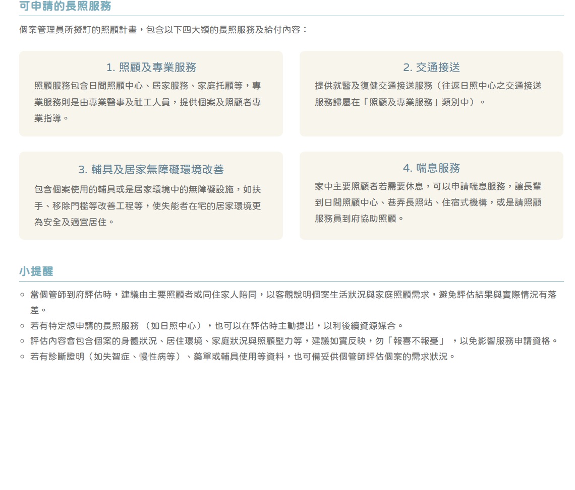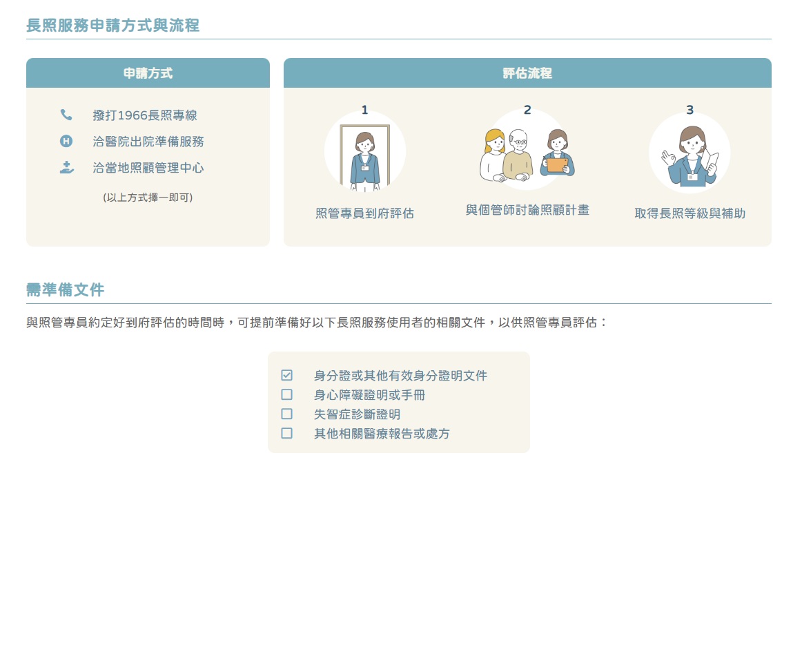 什麼是長照3.0?「長照2.0」自民國106年推動至今,已將近十年。隨著人口老化與需求快速增加,長照基金編列的經費也逐年成長,在114年度更達到879億元,持續推動著以社區為基礎的社區整合照顧模式,例如日間照顧服務等,提供更切合使用者需求且更周延的服務,也透過長照給付制度,讓使用者可以依據長照等級、家庭經濟狀況及需求服務等,申請到普及且平價的照顧資源。 隨著台灣社會快速邁向超高齡化,「長照2.0」的升級版「長照3.0」也預計將提前於115年正式上路,以因應更多元、龐大的長照需求,部分新措施也已經於114年9月1日起陸續分階段實施,不僅讓照顧服務更具彈性,也更貼近使用者的生活需求。有需求的家庭或長輩,都可以參考本文內容,進一步了解申請方式與可運用的服務資源。 長照服務申請資格過去的長照2.0,主要服務65歲以上的失能長者,而長照3.0則再放寬申請資格限制,納入「全年齡失智且失能者」及「急性後期整合照護對象」,許多以往無法獲得足夠長期照顧資源的年輕型失智症者、年輕型中風者、癌症患者等,將可因此受惠。 自115年1月1日起,符合以下任一條件者,將可1966申請長照等級評估,並透過補助使用各項長照資源。 什麼是長照等級(CMS)?透過政府補助使用長照服務之前,將需由照管專員到府評估個案的年齡、健康狀況、生理與心智功能、日常生活(如穿衣脫襪、進食、洗澡、平地移動等)需他人協助的程度及照顧者壓力等,以判定個案的長照等級,並核定其所需的長期照顧服務及給付補助,且依家庭收入狀況,採不同的自費金額比例。 長照服務申請方式與流程