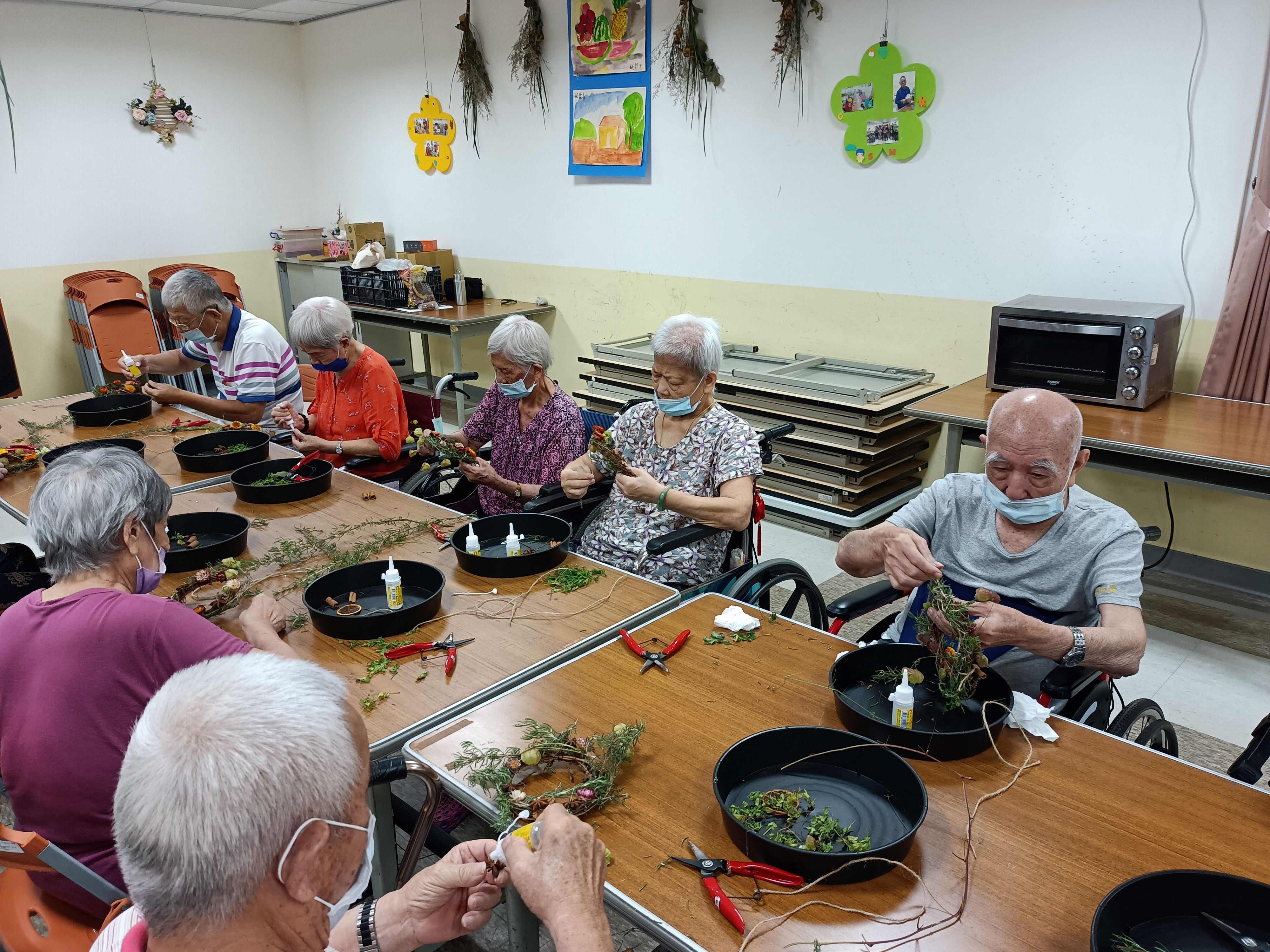本家與農業試驗所花卉試驗分所合作推動園藝輔療計畫,這次活動主題為香料甜甜圈。 由綠森微風工作室-石軒豪老師帶領住民利用常見的香料,如八角、肉桂、迷迭香等並搭配裝飾用的花草(如麥桿菊)製成一個甜甜圈造型的作品;同時讓長者在製作過程中嗅吸不同香料,並回憶過去生活中用到的香料。課程最後讓住民回憶今天使用到的香料增強記憶訓練。 活動同時充分刺激住民手指小肌肉耐力,促進住民感官刺激,不僅有助於提升長者的身體健康,也為他們的心理帶來正面影響。 透過手工藝活動增進住民與大自然的連結,讓住民們度過愉快時光。
