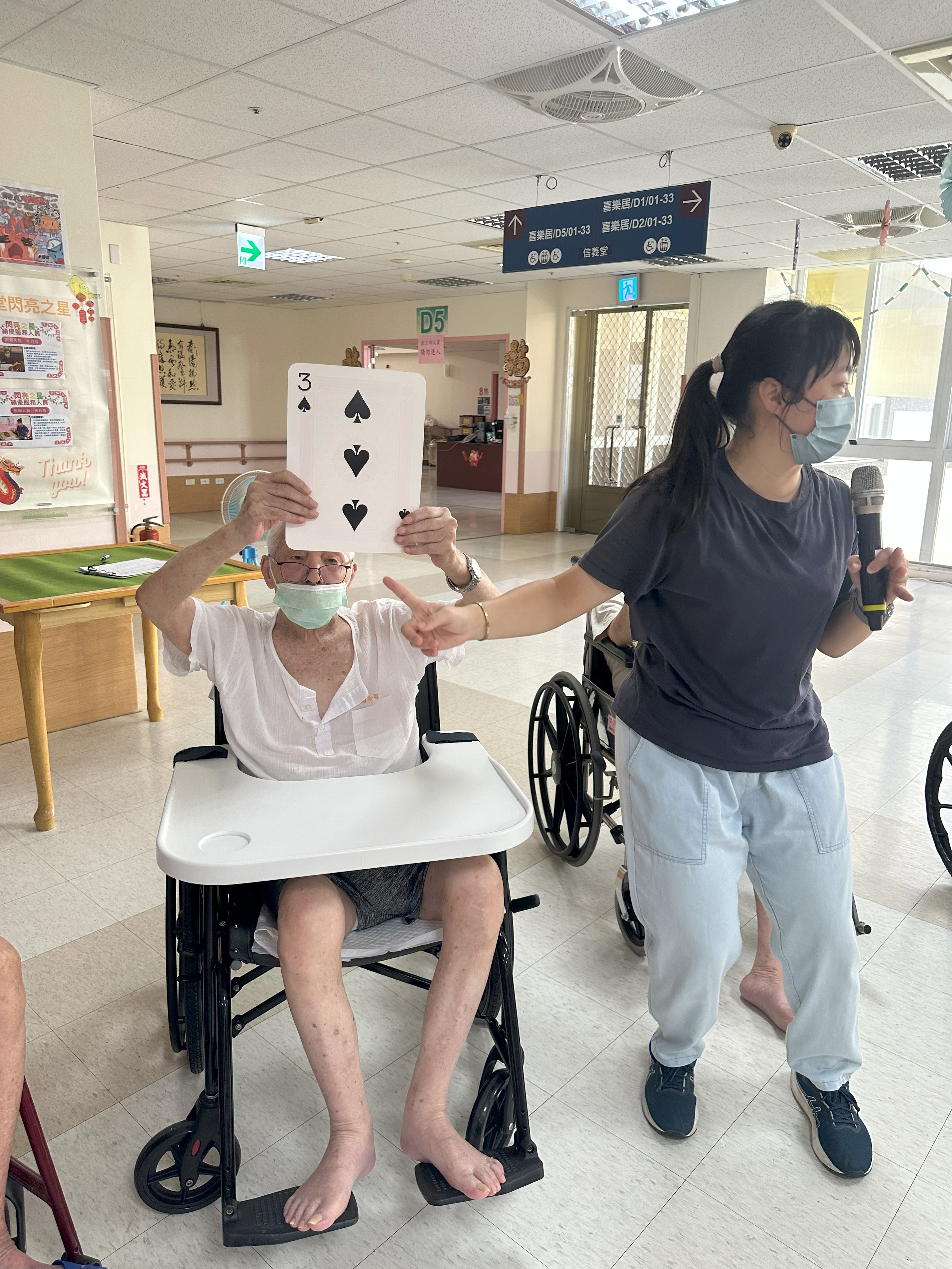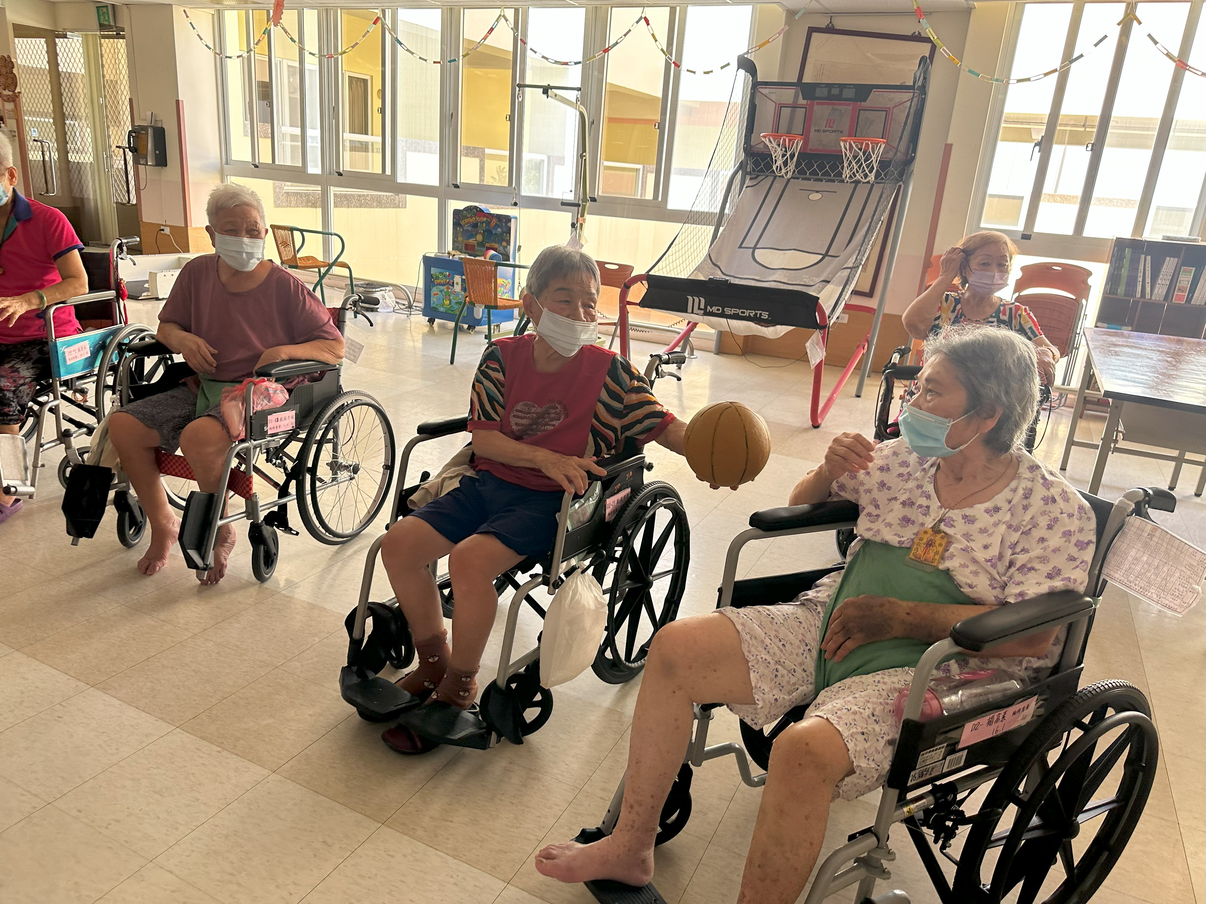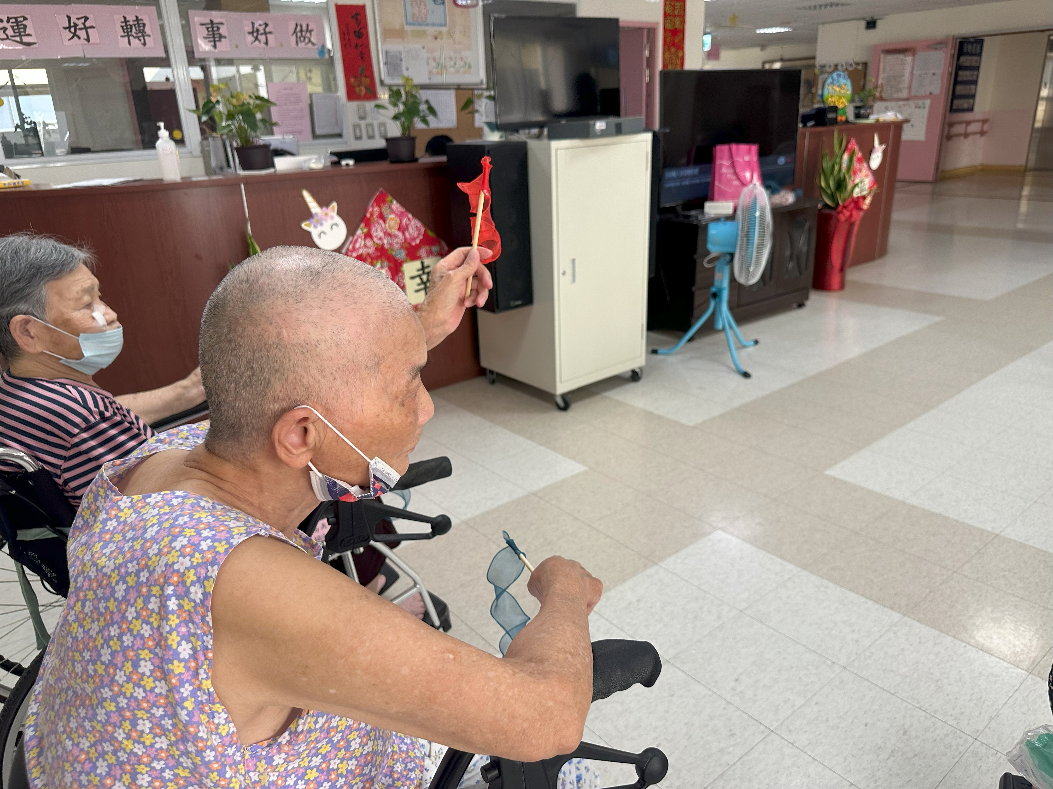 在失智症照護中,**非藥物治療**被廣泛視為安全且有效的輔助方式,能改善患者的生活品質,延緩功能退化,本家與台中榮總嘉義分院合作辦理失智症住民非藥物之整合性照護講座,今天講師至忠孝堂及信義堂帶住民玩傳球活動、彩帶辨色力及數字大考驗(動動腦)有助於延緩失能及失智,並配合音樂帶住民運動。