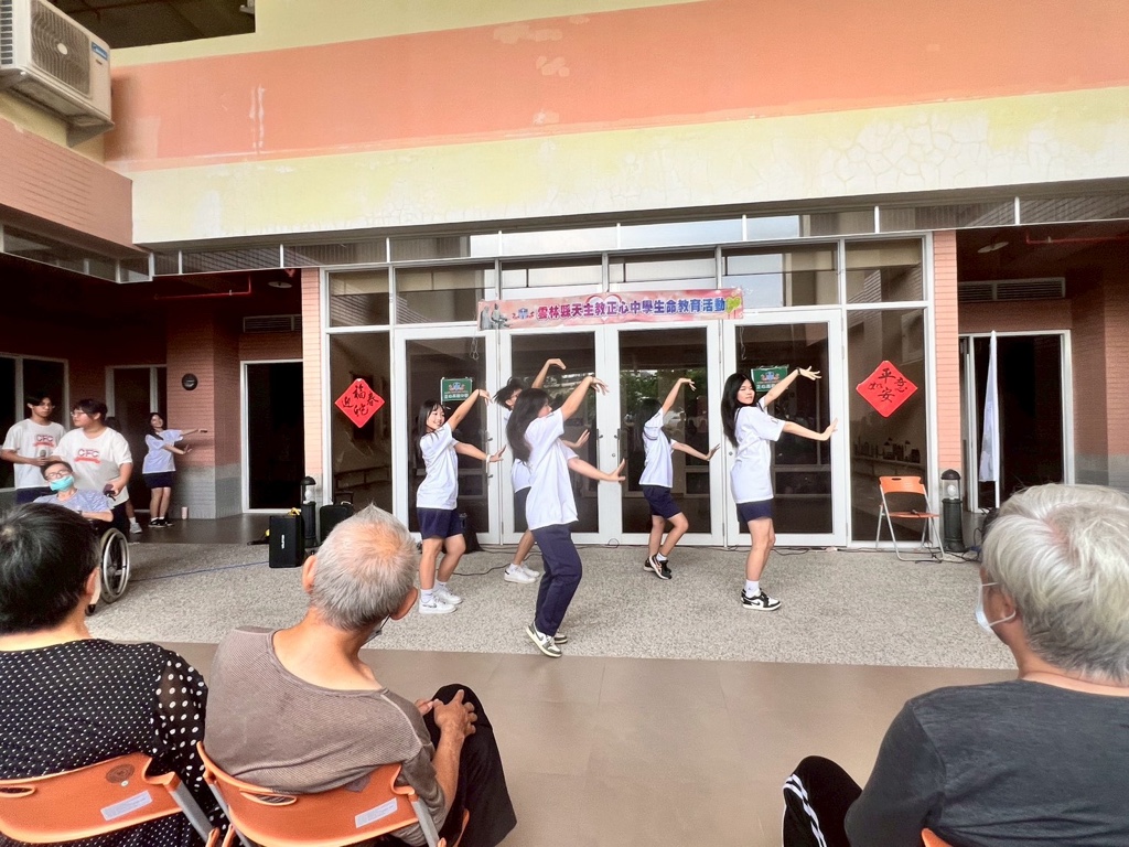 本次活動由正心中學學生團隊籌備,抵達院區後先進行場地動線確認、音響測試及節目彩排,展現良好團隊協作。活動表演內容包含舞蹈、合唱、吉他演奏及情境式歌唱等,節目安排多元,兼具節奏感與文化情意。在表演過程中,學生以穩定台風及真摯情感呈現節目,長者也以掌聲與微笑回應,現場互動氣氛和諧熱絡。 活動最後,由學生代表協助分送布丁,並與長者進行簡短交流,表達對長輩的關心與祝福。透過面對面的互動過程,使學生更加理解世代陪伴的重要性,也讓長者感受到青年世代的支持與敬意。