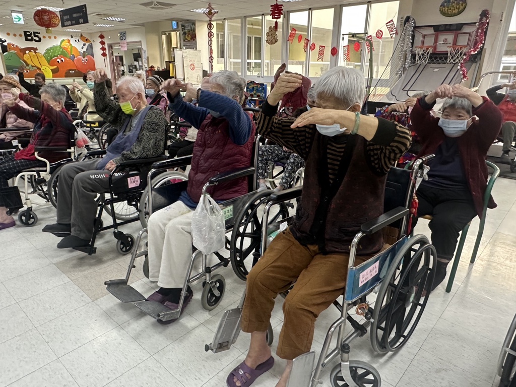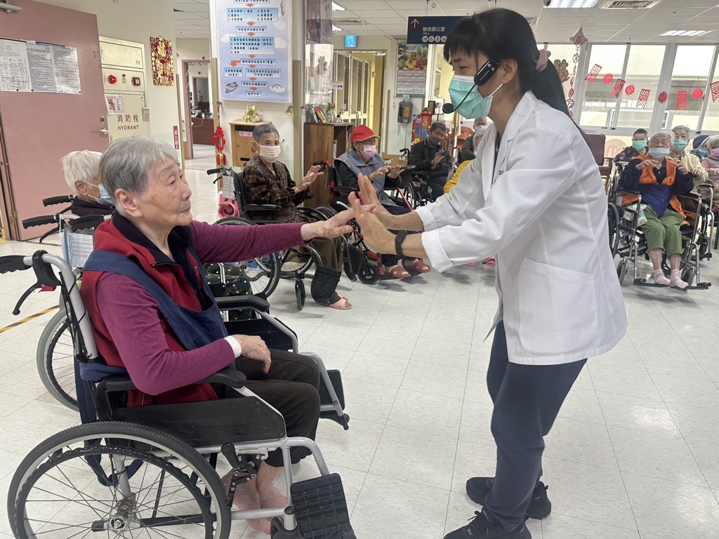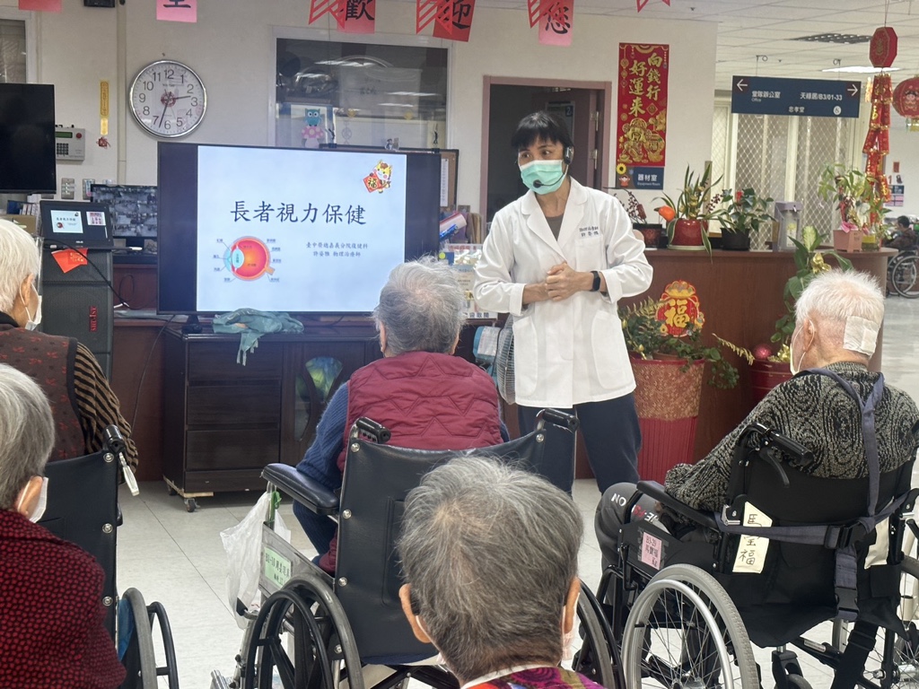 今由嘉義分院許姿雅物理治療師到本家忠孝堂,為住民進行長者視力簡易評估介紹,讓長輩了解視力老化的現象及日常保健方式,並分享如何有效減緩視力退化的方法。同時,許治療師也帶領住民進行體適能運動,透過規律活動預防及延緩失能與身體功能退化,活動過程中,長輩們認真投入,隨著音樂節奏與老師一同律動,現場氣氛溫馨活絡。