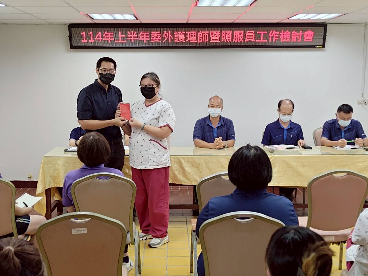 佳里榮家為提升住民照護品質、強化與承商間履約管理,共同營造健康友善的職場環境,於114年6月12日召開「114年上半年委外護理師及照服員工作檢討會」,由家主任白永成主持,副主任、秘書室、輔導組、保健組等一級單位主管及慈惠公司董事長、督導長、護理師及照服員代表出席與會。 本次會議針對住民醫療護理及生活照顧、人力調派、工作規範履約狀況等事項由各業管單位提報並進行意見交流,希望透過會議研討取得共識,期能改善工作缺失、提升工作效能進而精進照顧服務品質。 家主任白永成表示照顧工作極為辛勞,尤其在榮家服務的護理師或照服員夥伴,需具備專業職能外,更需有愛心、耐心及同理心,除提供護理照護及生活協助外亦要注意住民身、心、靈方面得需求,才能在照顧過程中讓住民感受到除專業照顧外有著如家人般的溫馨關懷與陪伴,家主任並勉勵委外夥伴要努力耕耘、落實照顧服務,為住民長輩注入生命希望,同時也對榮家委外夥伴的工作表現,表達出高度肯定,感謝他們的辛勞付出。 家主任白永成進一步表示榮家責任是提供優質的工作場域及照顧好每位同仁,才能有效降低人員的異動率,使得住民長輩獲得更高品質的照顧服務。近年來護理人力感謝惠馨實業積極招募成績斐然,惟照服員人力尚需積極努力,盼廠商持續招募人力,才能滿足住民照護量能。最後更特別感謝公司董事長提撥個別及團體工作獎金,激勵夥伴提升工作士氣,榮家與廠商維持好的良好的合作關係,共同為高品質的照顧服務而努力。