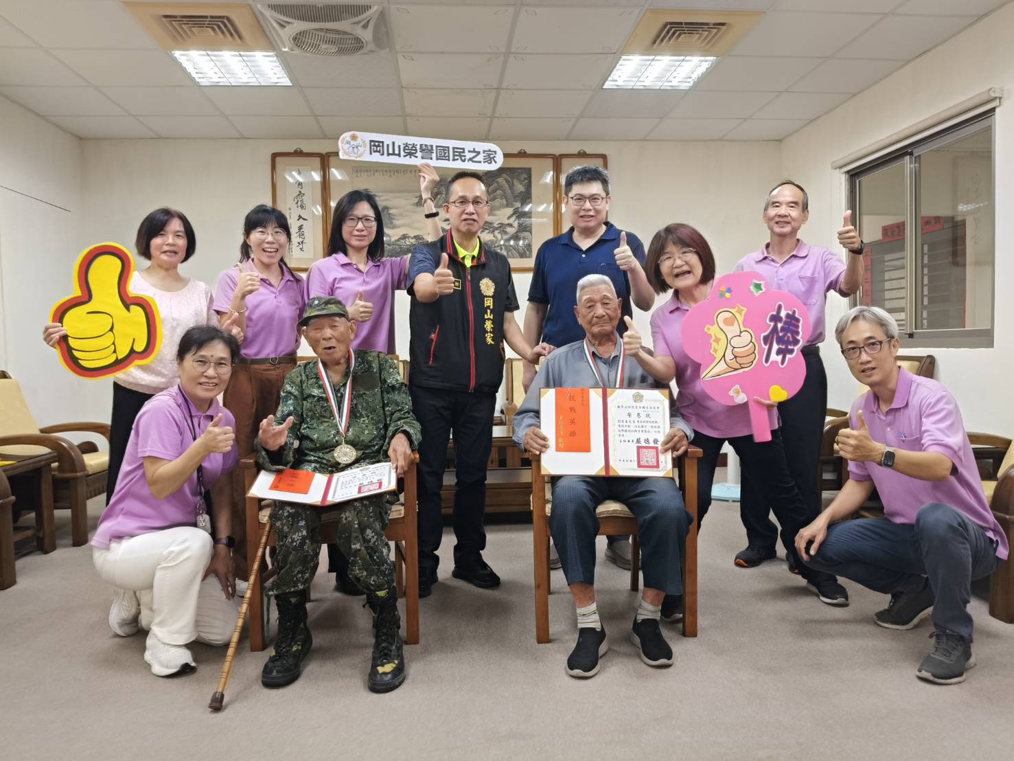 九三軍人節這一天在岡山榮家也舉辦了特別的紀念活動。岡榮輔導組特別於活動前蒐整了有關九三軍人節的相關影片精華,利用軍人節當天邀集長輩至松柏廳共同欣賞;活動當天一早長輩們就相互吆喝著一塊來到松柏廳,活動由劉凡融副主任主持,影片欣賞前副主任先向這群老英雄們問安,並強調雖然每年九三軍人節榮家都會有不同的紀念活動,但是對於老前輩們的「崇功報勳」心情卻始終不變。 岡榮輔導組蒐輯的紀錄影片對曾經參戰過的老英雄們可謂是歷歷在目,育豐堂雷永祥長輩(雷公)即便是106歲人瑞之齡,只要一挑開話匣子就可以將抗戰的故事又是笑又是淚的鮮明記起;育樂堂劉堂春長輩也是位百歲人瑞,抗戰期間他服役兩棲部隊,在出任務的時候砲彈、機槍在小艇兩旁紛沓落水,他熬過了槍林彈雨能否保下小命都不敢確定的日子裡,兩位曾經親身歷經過戰爭歲月的長輩最能體會和平的珍貴及戰爭的殘酷,並於影片欣賞後由李文國家主任代表輔導會嚴德發主任委員轉發慶祝抗戰勝利八十周年紀念榮譽章、榮譽狀及慰勉金予雷永祥伯伯及劉堂春伯伯。 岡榮李文國家主任強調,隨著時空的轉移許多過往的歲月或已盡逝,但是長輩們曾經對於國家民族的付出卻不容或忘;是老英雄們犧牲了自己原有美滿的家庭拋家棄子、離鄉背井,遂能成就現在我們後一代所能擁有的富庶生活,將他們的晚年生活給照護好是我們的責任,因為我們的付出是遠遠比不上他們所做的犧牲,永遠無法比擬。