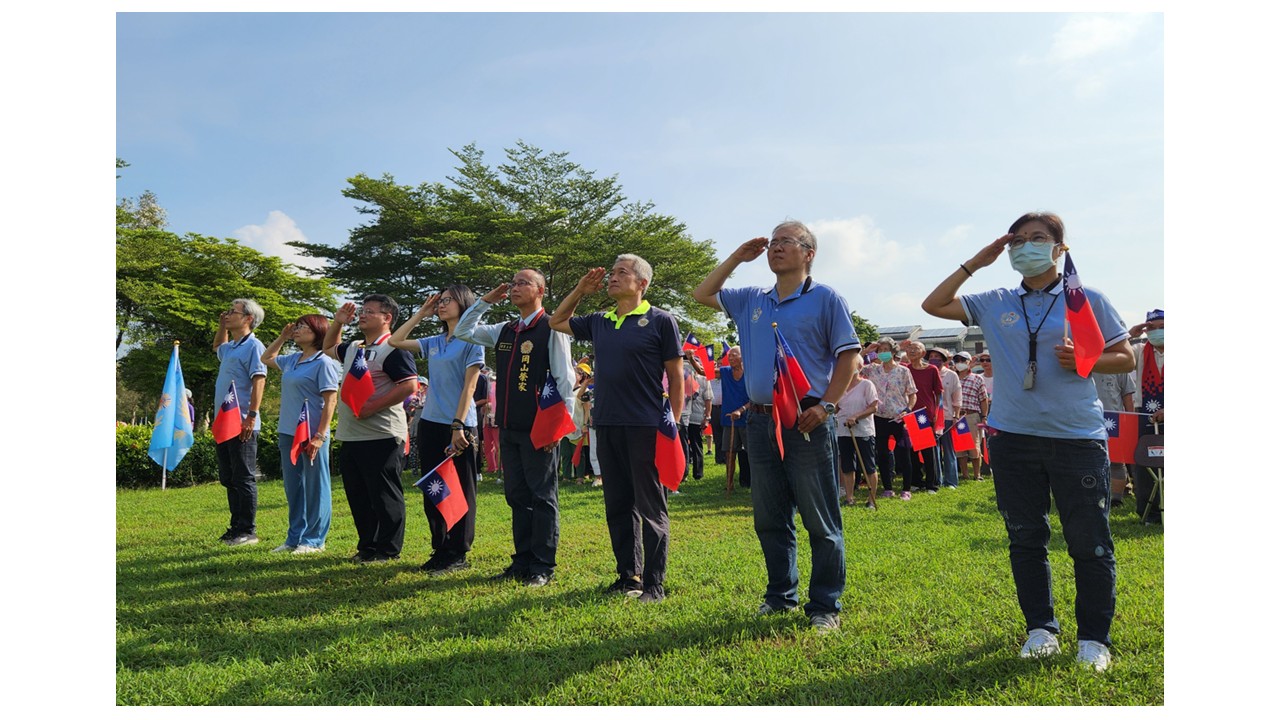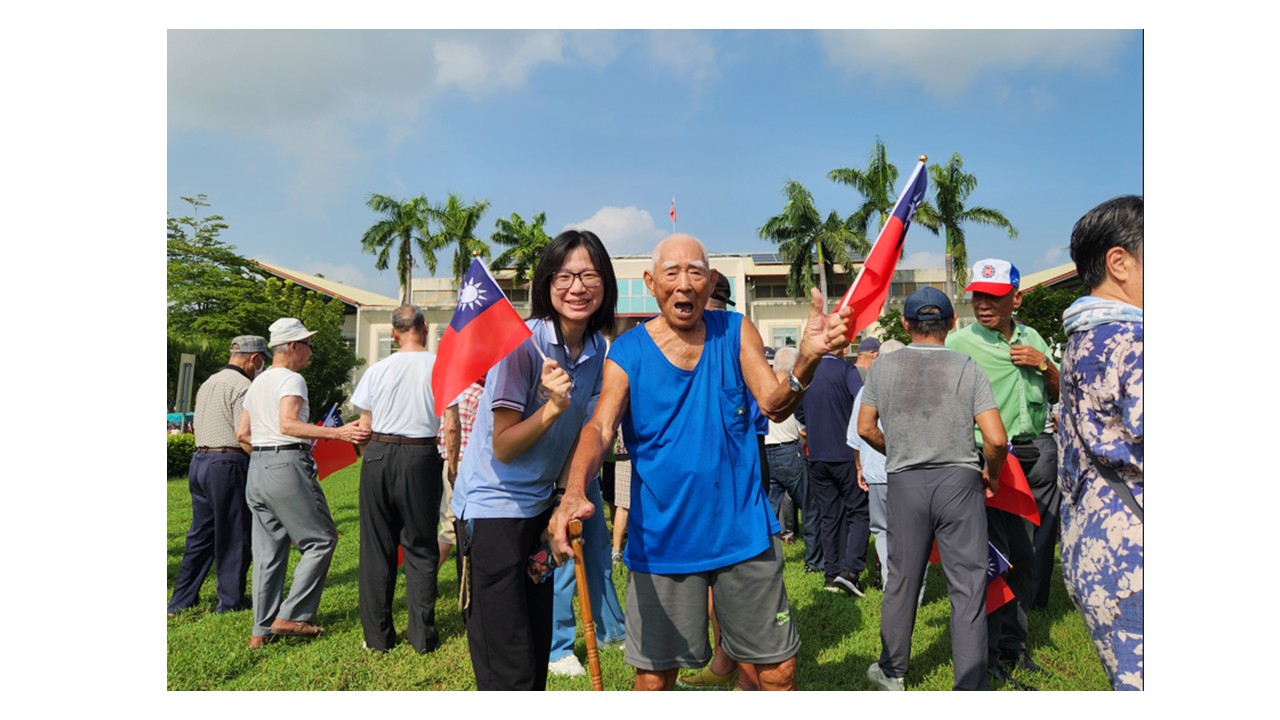 岡山榮家為迎接光輝十月的到來,自十月初起即在家區插滿國旗以為慶祝,十月的南臺灣天候依舊艷陽普照,家區裡的國旗在陽光及徐風的護持下飄揚的令人熱血澎湃,為迎接雙十國慶岡榮特別於十月十日當天舉辦升旗典禮及小型園遊會,並邀請薩庫拉薩克斯風公益團體蒞家演出。 岡榮國慶日升旗典禮於當天上午九時於行政大樓前草皮展開,當天上午九點不到各堂隊長輩們或是由照服員引導或是自發性來到活動場地早早就位完畢,沿著行政大樓前兩側的馬路上則是堂隊的園遊會攤會也已經設攤就位;岡榮家主任也早已在會場招呼長輩與住民寒暄問好,隨著升旗典禮的時間迫近各堂隊也陸續靠攏成形,九點整一到在司儀的引導下全體人員跟隨著播音系統播放出來的國歌大聲高唱:「三民主義,吾黨所宗,以建民國,以進大同,……,一心一德,貫徹始終。」齊唱國歌結束後接著就是國旗歌,大夥目視國旗冉冉升起並以舉收禮向升起的國旗行最敬禮。既隆重且肅穆的升旗典禮在短短幾分鐘內透過全體參與人員虔誠敬穆的心情共同迎接114年雙十國慶這一天。 升旗典禮結束後小型園遊會為今(114)年國慶日升旗活動帶來另一波的小高潮,現場6個攤位各有各的特色,長輩們一邊拿著特色小點一邊坐在行政大樓前廣場聆聽薩酷啦樂團薩克斯風的精采演出;這一天晴朗的天候、可口的小吃美食、專業的樂器演出加上熱情的住民長輩,大夥一起迎接114年光輝十月及雙十國慶這個值得紀念及珍惜的國定假日。