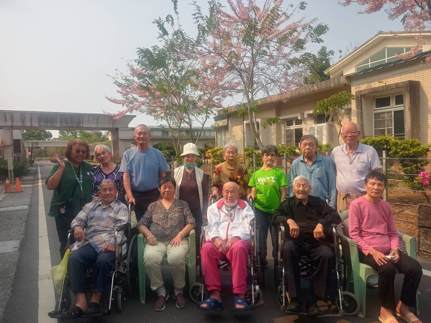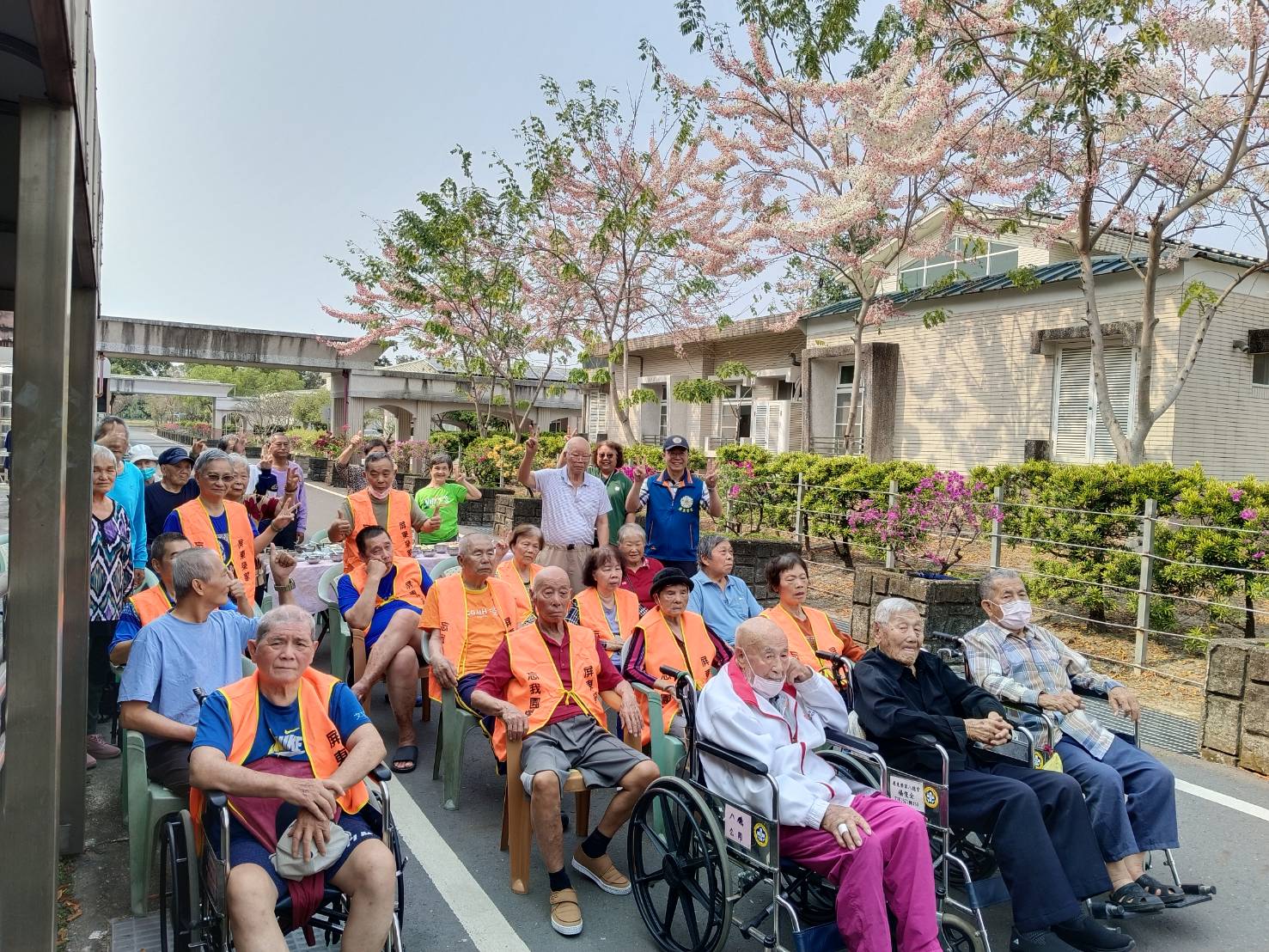 微風吹拂,花瓣輕落。副家主任與長輩們欣賞花朵盛開的美景及共享下午茶。彷彿置身詩畫之中,文學造詣深的鄒伯現場吟詩祝興;「志航道傍花競開,土植盆栽比春魁。可惜時光如流水,轉眼炎炎逸興催。」榮家員工及長輩們溫馨開懷話家常,長輩們紛紛露出燦爛笑容,增添榮家歡樂氛圍。