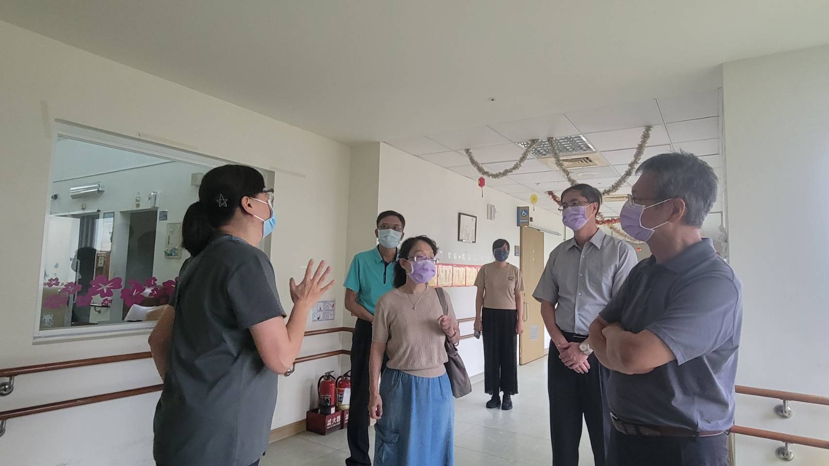 隨後,在李主任陪同下,施副校長與賴教授實地參訪失智專區等榮家設施,深入瞭解長輩生活起居與環境設備。過程中不時與榮家同仁交流照護細節及相關問題,對榮家團隊專業且溫馨的人性化服務表示高度肯定。