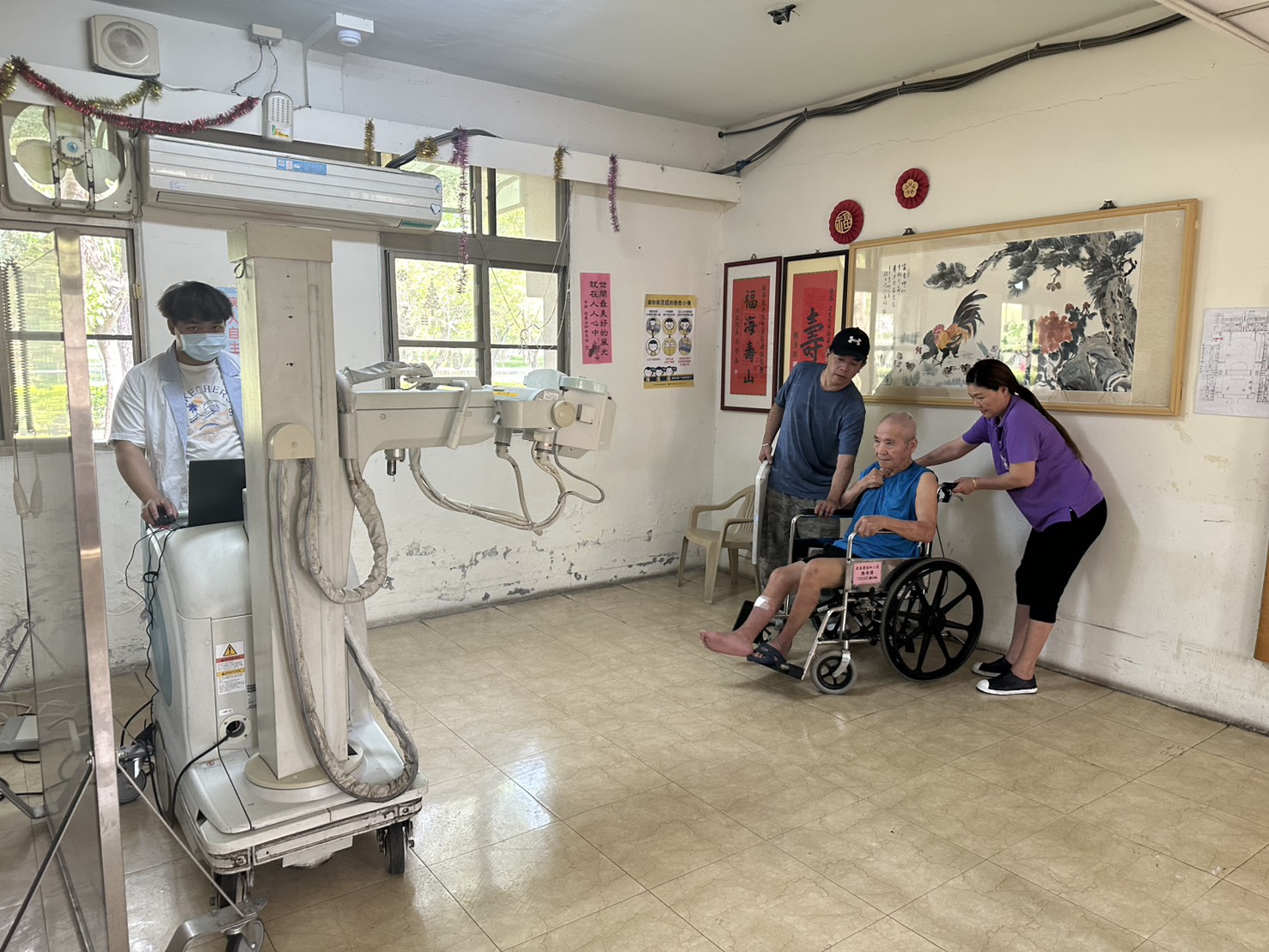 為維護住民長輩健康,落實預防醫學精神,屏東榮家與屏東榮總合作,辦理全體住民胸部X光巡迴檢查。期能早期發現住民肺部潛在異常,強化呼吸道疾病防治工作,全面提升照護品質。 X光巡迴車當天除針對安養堂住民依序進行檢查;同時,行動式X光機亦進入養護堂,由工作人員協助行動不便或臥床住民進行床邊胸部X光檢查。檢查項目主要針對肺結核、肺癌、慢性阻塞性肺病(COPD)等高齡者常見之肺部疾病進行早期篩檢;共計完成210餘位住民胸部X光檢查。 為長輩健康把關是榮家的重要責任,透過定期檢查,不僅能及早掌握長輩身體狀況,更可及時介入治療,有效降低疾病風險,讓住民享有安心且有品質的生活。屏東榮家未來會持續辦理各項預防保健活動,結合專業醫療資源,打造安心且具尊嚴的居住環境,落實以人為本的照護理念,陪伴每位住民安享幸福晚年