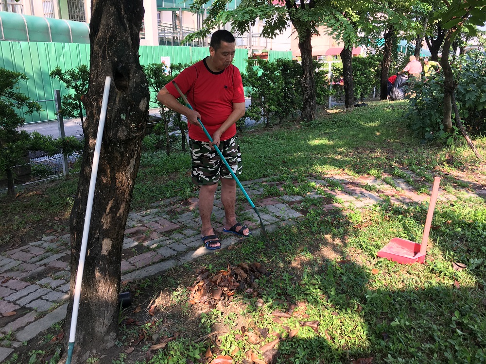 在記憶日漸流失中,往日日常生活中熟悉記憶卻能熟練施展,帶領榮伯清掃環境防治登革熱兼日光浴轉移注意力,一舉數得。榮伯認真努力的模樣最讓人稱讚。 相關照片