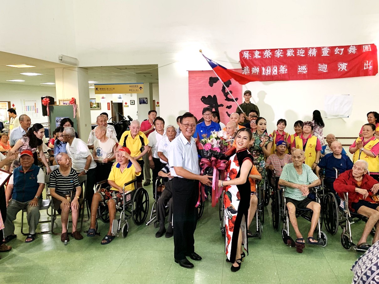 精靈幻舞舞團舉辦「回家飛永不凋零的老兵」全省榮家巡演,於108年7月10日來到屏東榮家,總監賀連華女士、團長薛喻鮮、專業舞者及工作人員,在忘我園區中堂帶來了一場精彩的表演,演出結合溫馨影片回顧,讓榮民長輩們度過了一個精彩豐富的下午。 民間歌謠搭配佛朗明哥舞蹈,以百老匯的風格讓住民們聽著熟悉的曲子看著新鮮的舞蹈,感受到活潑的西班牙佛朗明哥舞蹈帶來的熱情,從第一首音樂響起時,賀總監鼓舞每個長輩歡欣的配合節拍活動,躍動起來讓人歡樂開懷、活力十足。節目中並安排在場的長輩們一起舞動,氣氛溫馨感人。 王少谷主任特別感謝舞團成員們對本家榮民之關懷,使其感受到滿滿動力。特致贈屏東榮家雙月刊與感謝狀,感謝團長與團員們對榮民長輩的尊敬與愛。王主任表示活動相當有意義,以一曲羅大佑的「家」,前後串聯節目,非常感謝精靈幻舞團的用心,期盼精靈幻舞團下次的到訪,讓榮民長輩感受躍動的生命氛圍。 相關照片