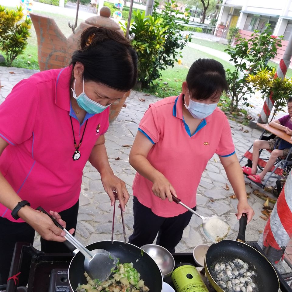 防疫期間限制家屬前來探視,顧及住民長輩的心情,今天來場蚵仔煎懷舊田園樂,長輩很開心說好久沒吃了很好吃,兩位大廚聽了很高興,初次做蚵仔煎,長輩給了滿滿的讚許,下次有信心還要做得更好。