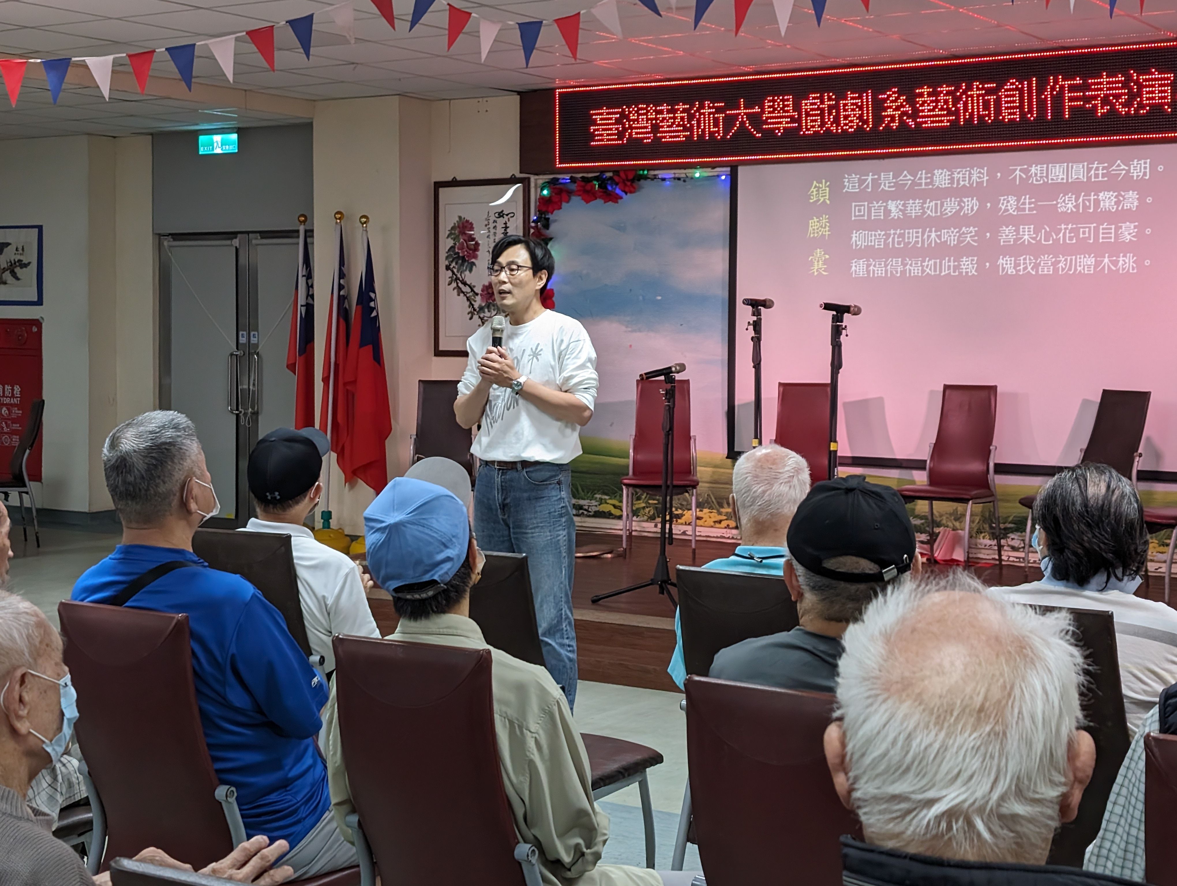 臺灣藝術大學戲劇系碩士班在張連強老師指導下,特別安排「創作表演-鎖麟囊讀劇」來慰問板橋榮家長輩們,張老師感佩榮民長輩早年為國犧牲奉獻的辛苦,也知道長輩們都喜歡京劇,希望用不同方式來呈現京劇,給長輩們有不同的戲劇體驗。