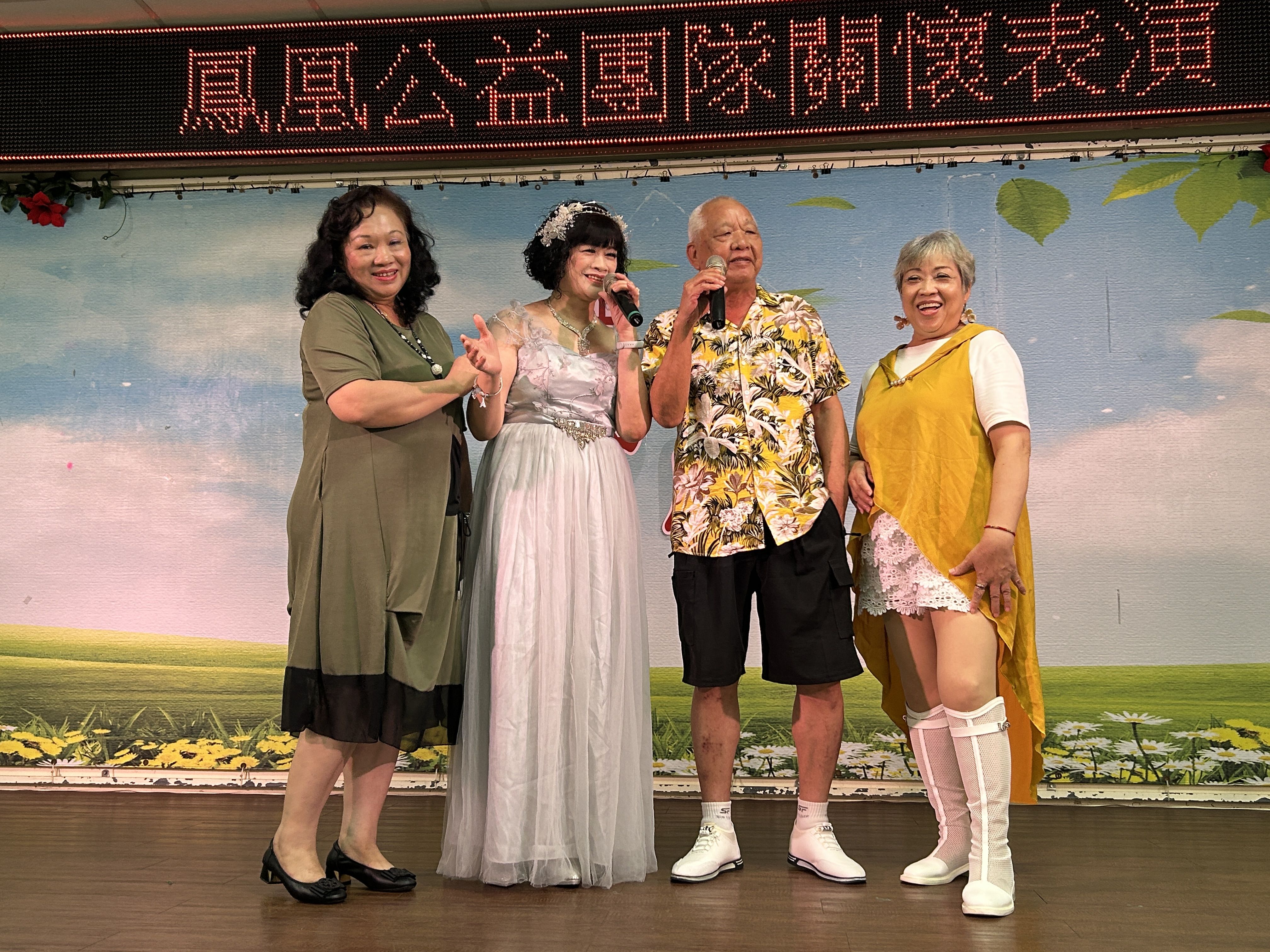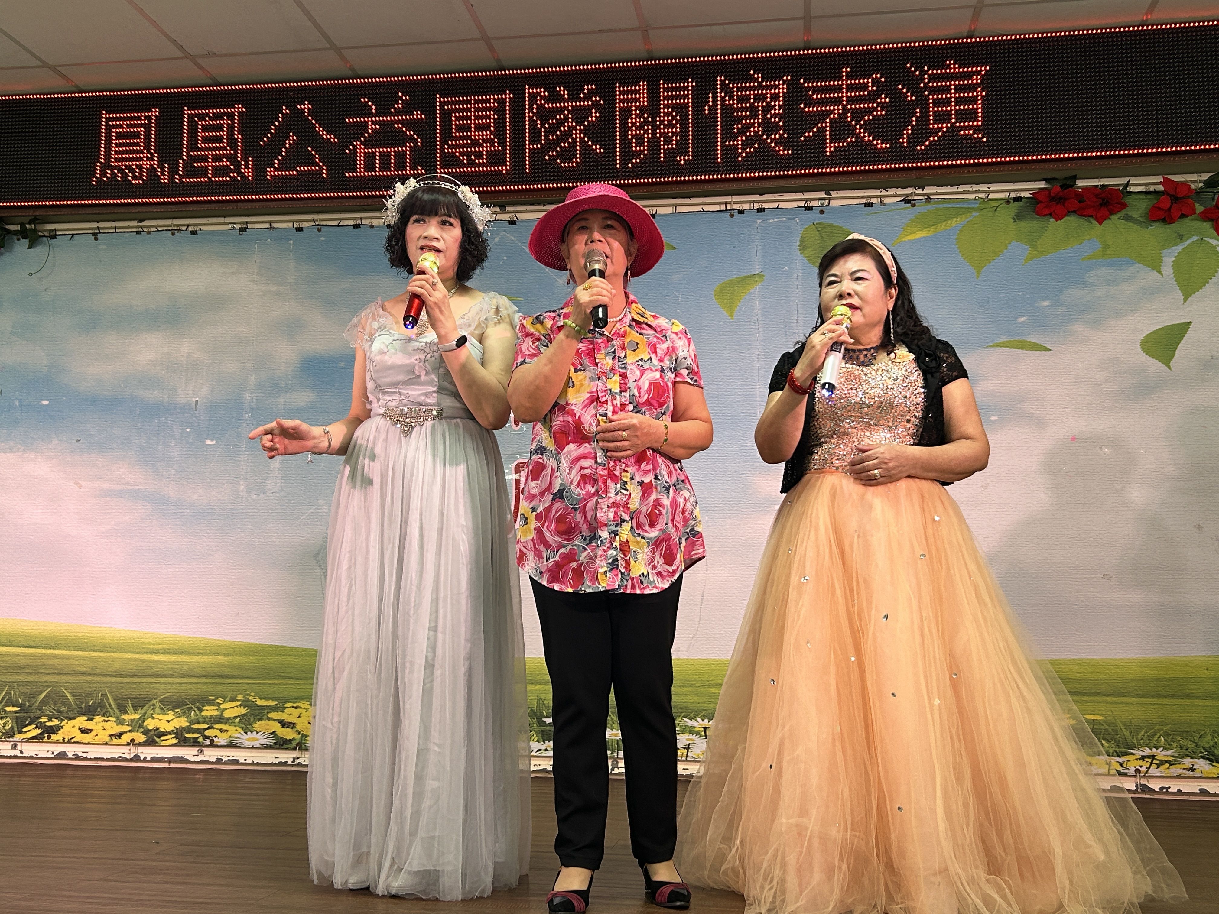 這次演出,鳳姊更邀請榮家長輩合唱,與傅大哥合唱「男人情女人心」,更與瓊娥姊帶來「掌聲響起」,隨後,佐達大哥則帶來鳳姊教唱的「你的眼角流著我的淚」,唱出真摯情感。壓軸在媚力舞團帶來動感十足的「卡拉OK Go Go+水水水」,為今天活動畫下圓滿句點。