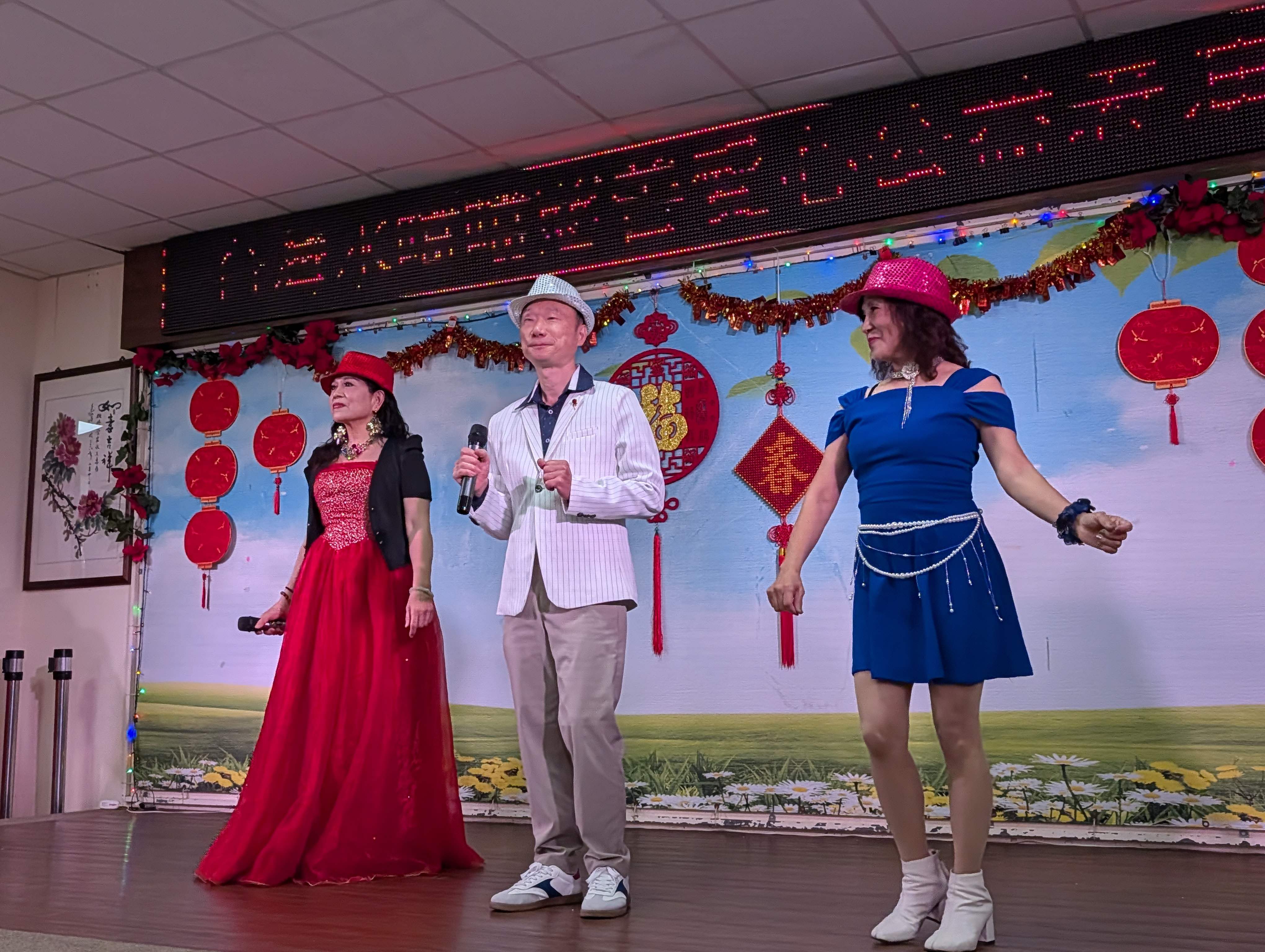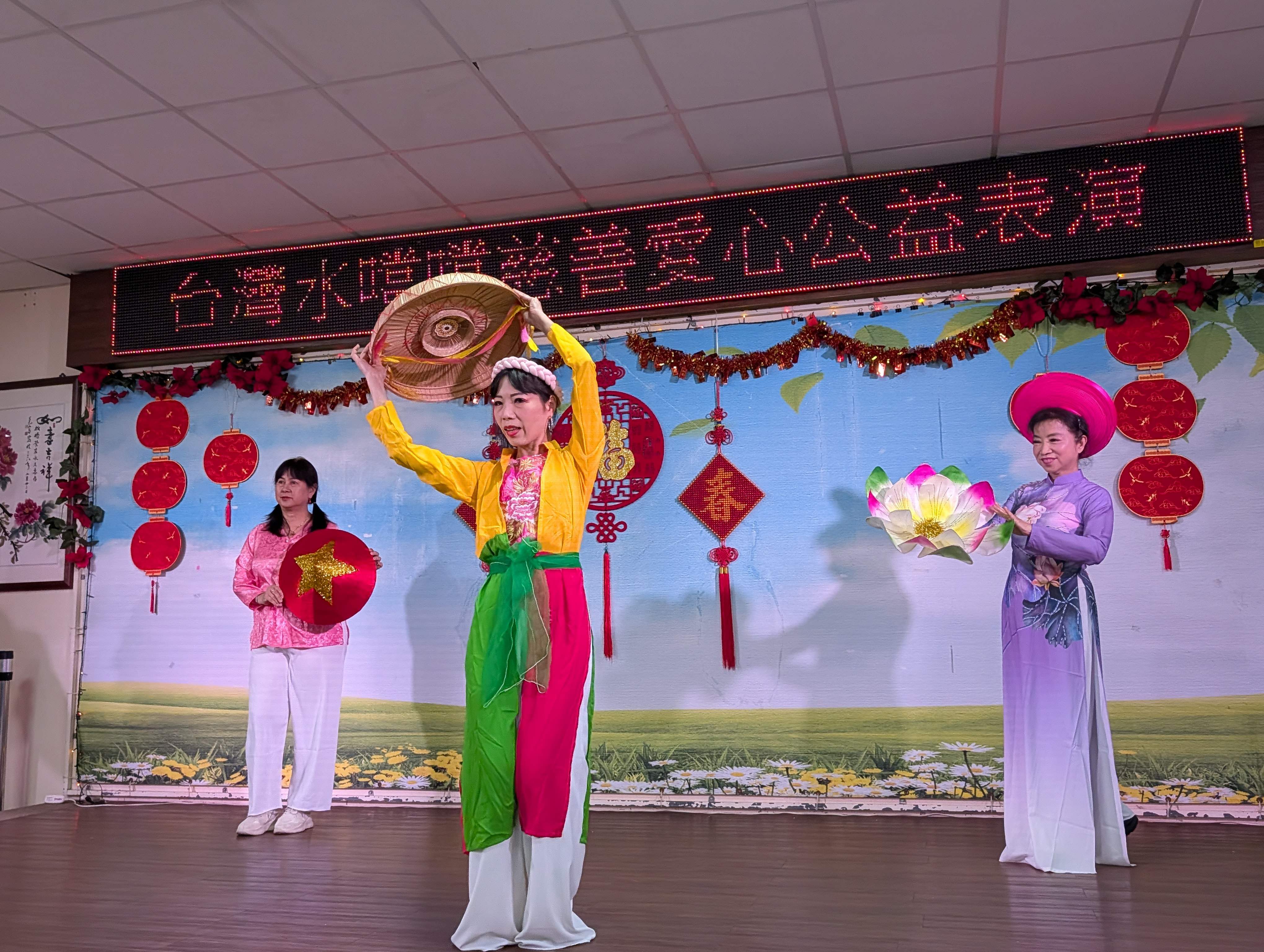 本次演出曲目安排豐富多元,涵蓋國、台、客語及越南傳統文化表演。開場由秀慧帶來鳳飛飛的名曲「真情比酒濃」暖身,隨後麗華、萬程帶來「你曾經愛過我、愛的苦酒」,熟悉的旋律讓現場長輩們聽得紛紛跟著節奏拍手合唱;還有極具底蘊的「越南三步曲」及「春之雁」舞蹈,帶來不同國家的文化風情;眞順老師精彩的佛郎明歌舞與金翅魔衣雙飄的演出,更是為現場增添視覺震撼;月生則以熱血的「客家本色」及「乾一杯」展現台灣族群文化特色與豪情,主持人謝緹雯團長以親切幽默的風格穿針引線,讓整場活動在歡笑聲中度過,活動就在所有表演人員演唱「期待再相會」的歌聲中落幕。