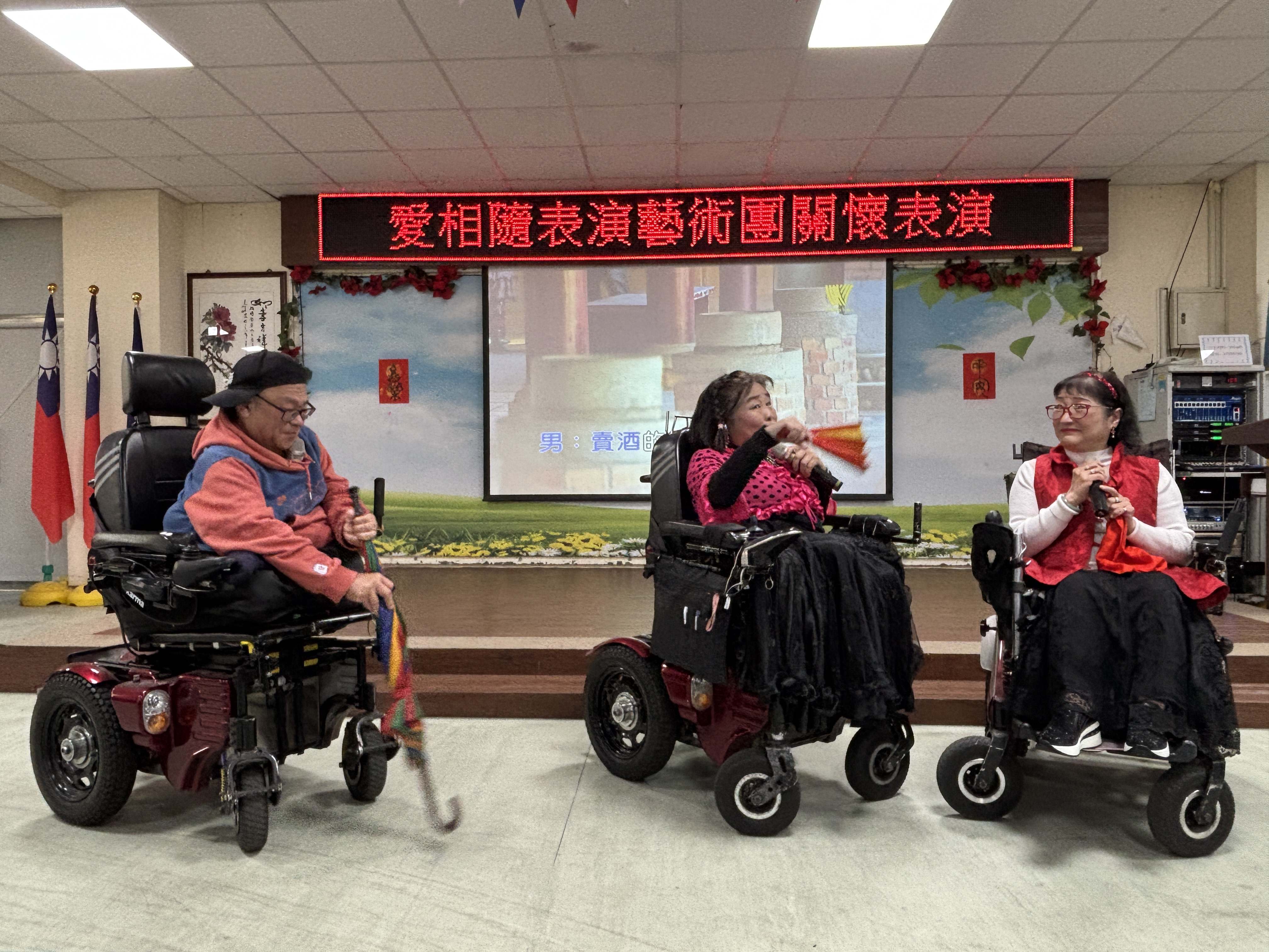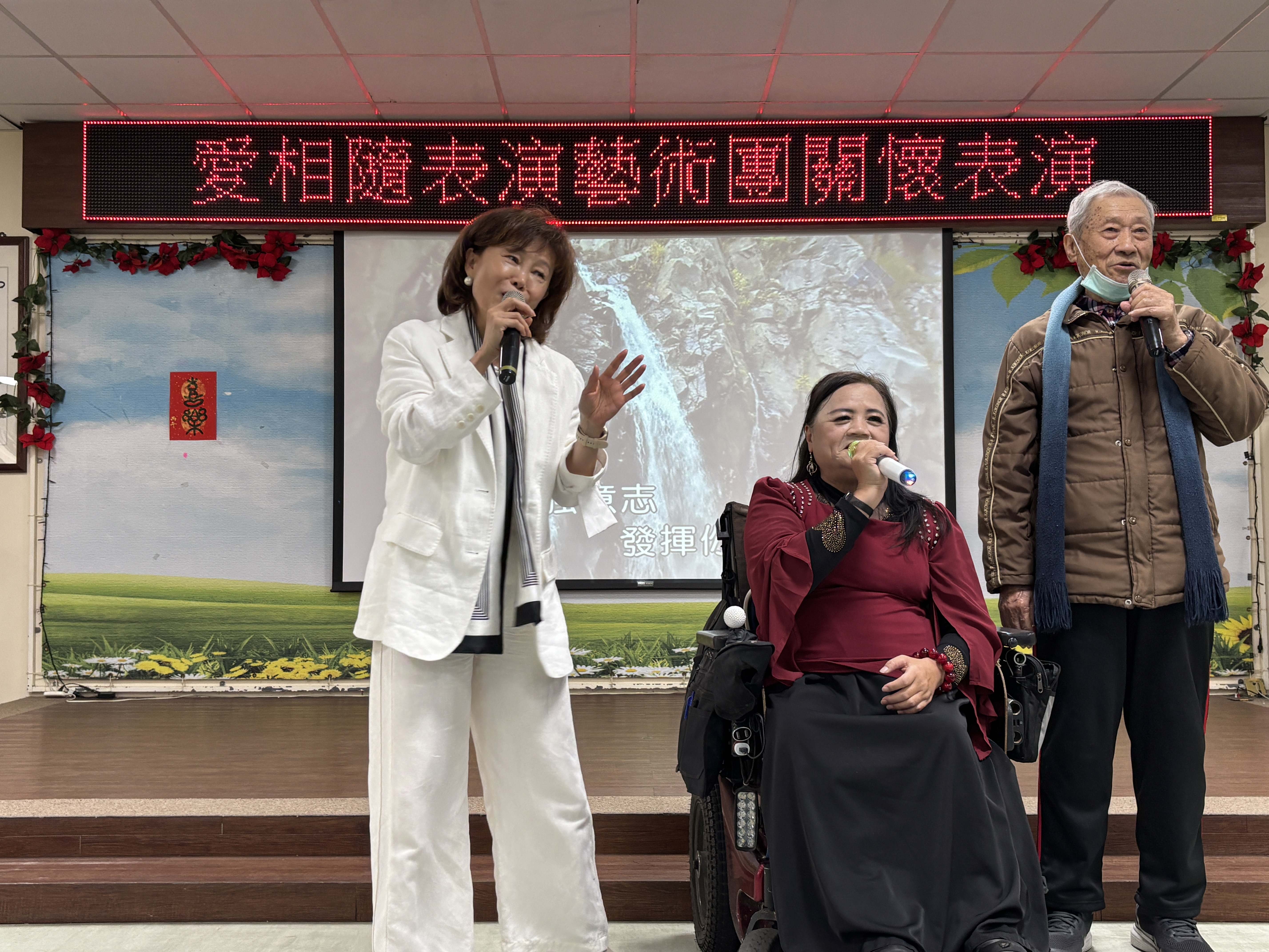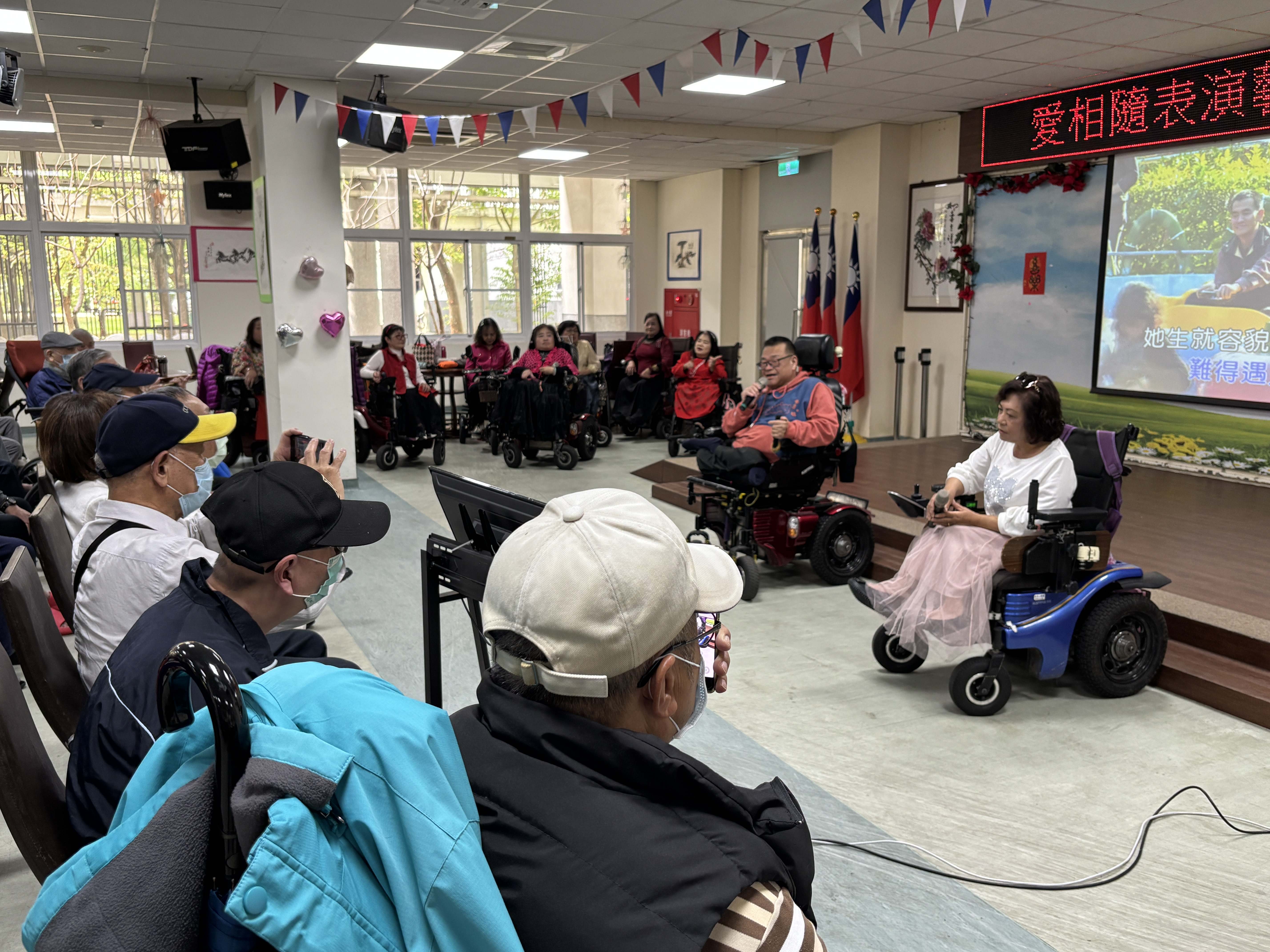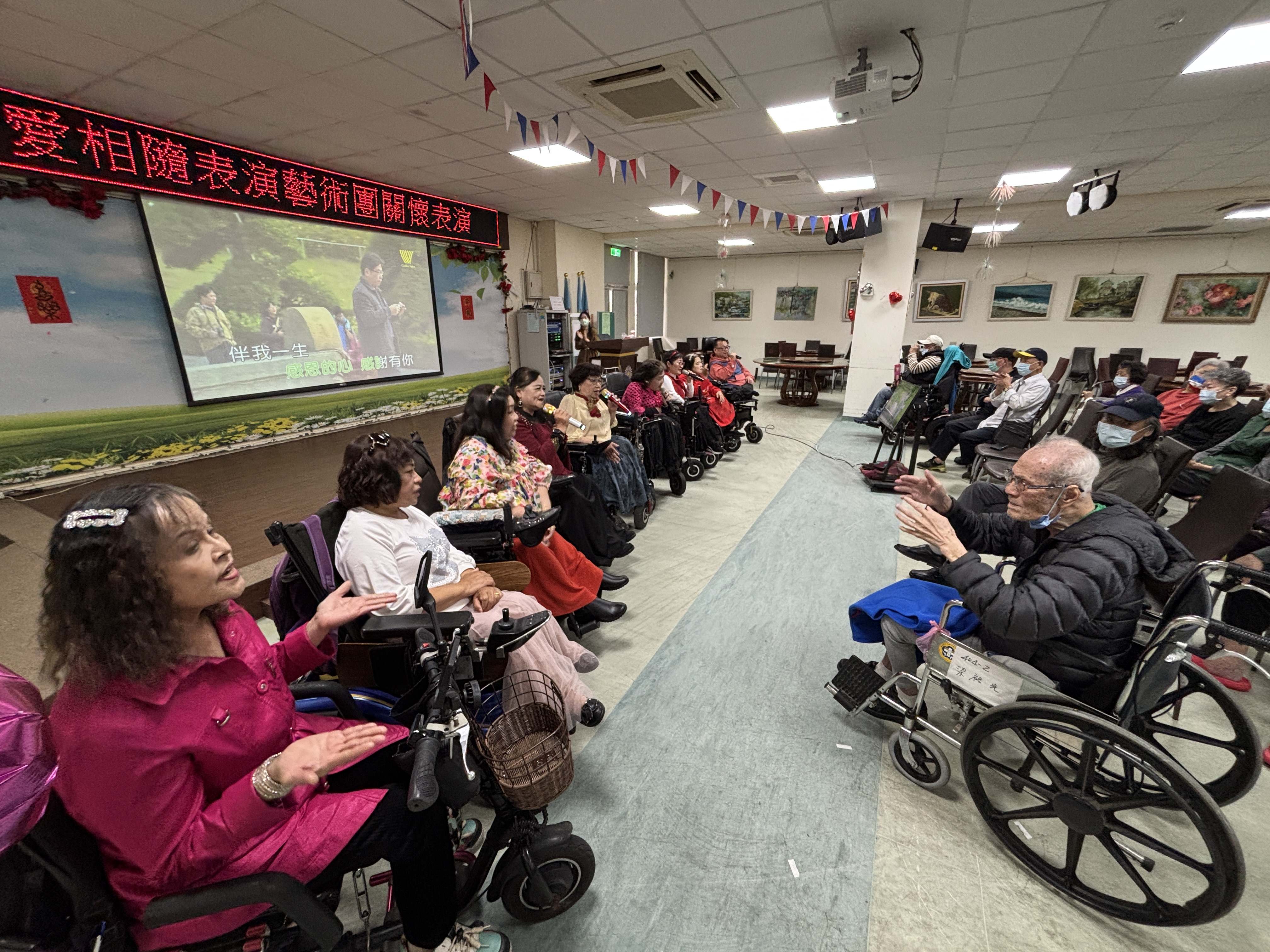 板橋榮家迎來一場充滿生命韌性的音樂饗宴,由「愛相隨表演藝術團」蘇團長帶領,他們是一群熱愛唱歌的身障人士,儘管行動不便,團員們仍克服萬難,搭乘大眾運輸工具、操控著電動輪椅來到榮家,用一首首經典老歌與榮家長輩共度溫馨午后,其「為愛出發」的精神令在場長輩深受感佩。 相關照片