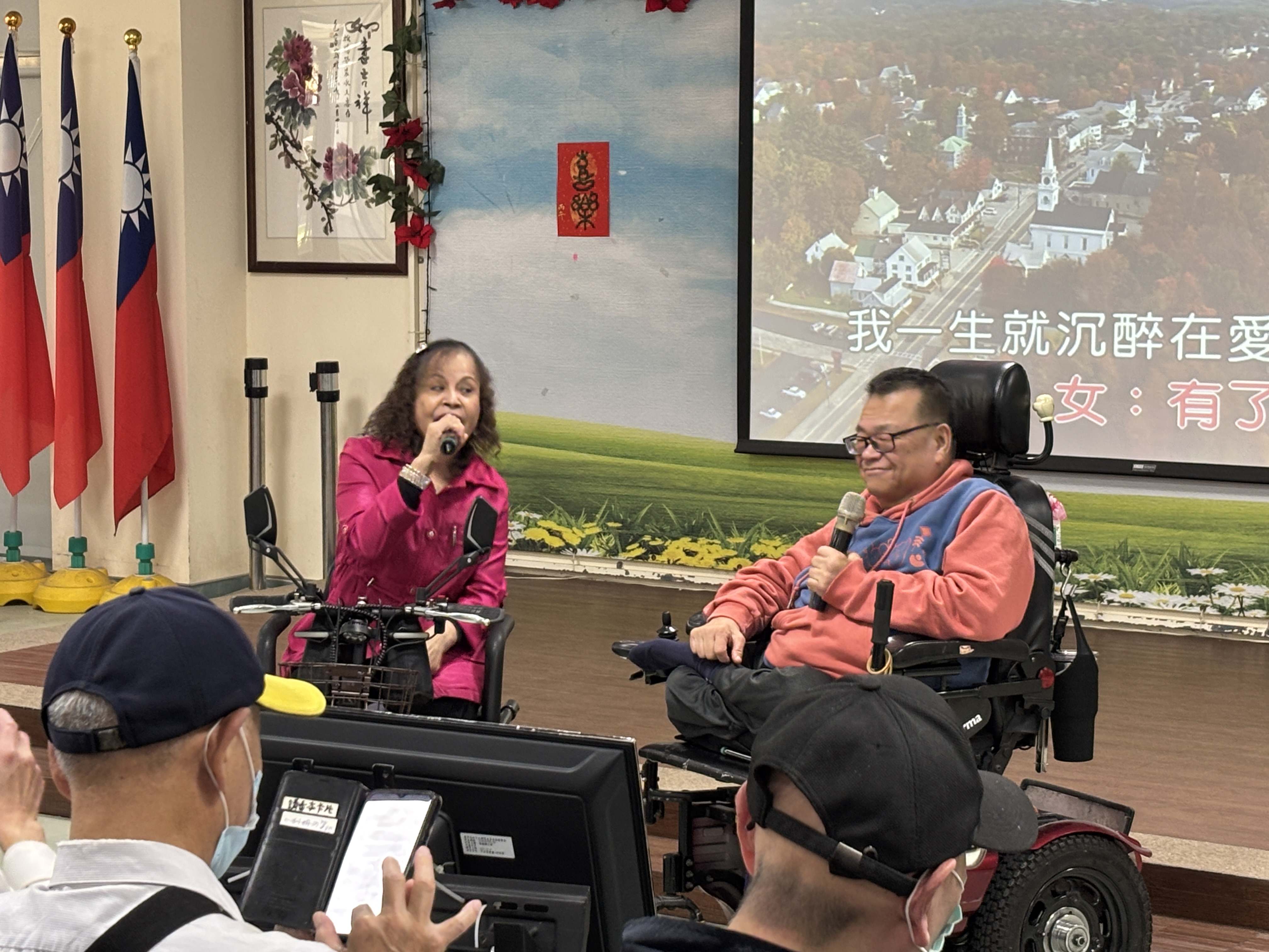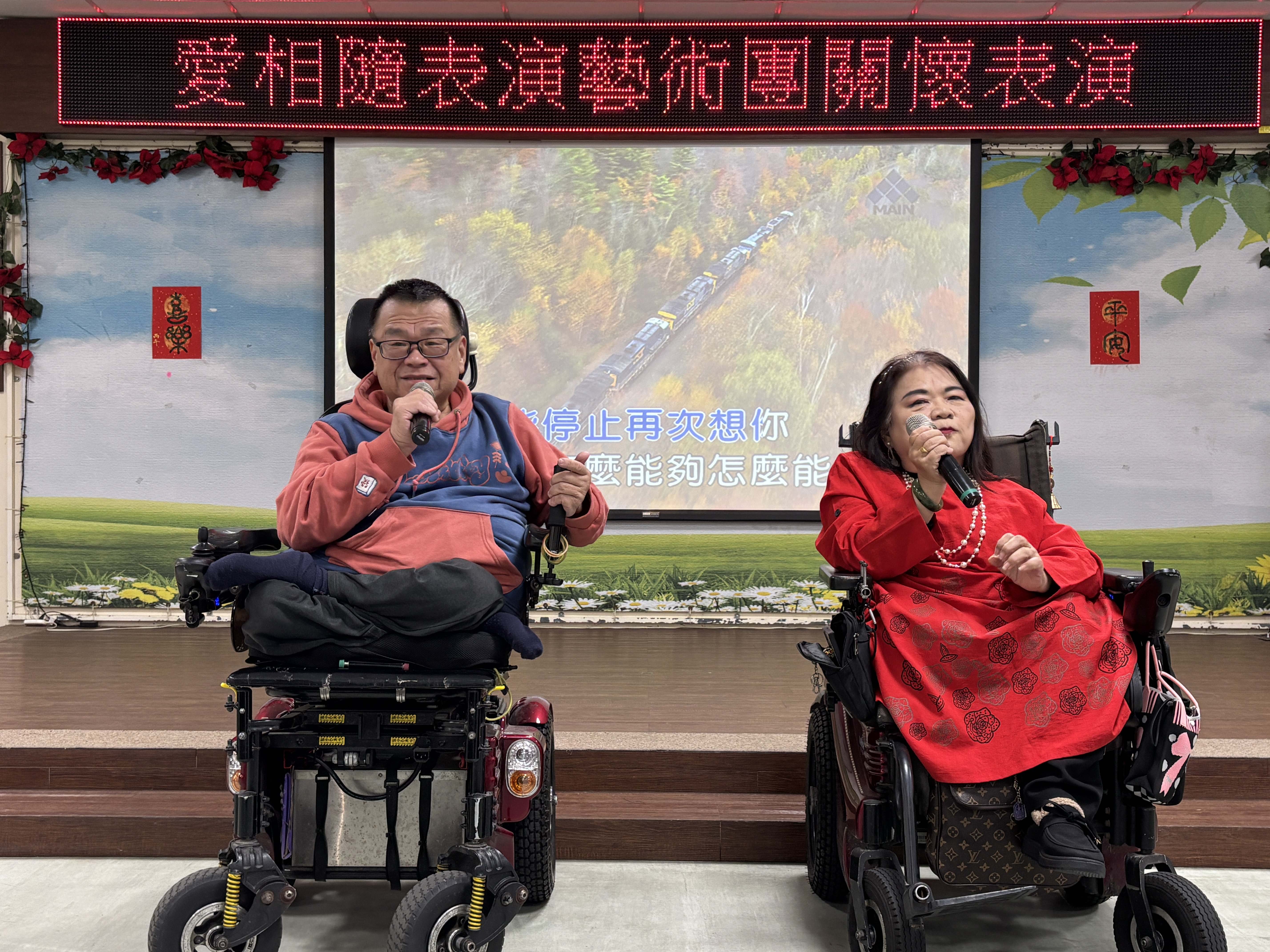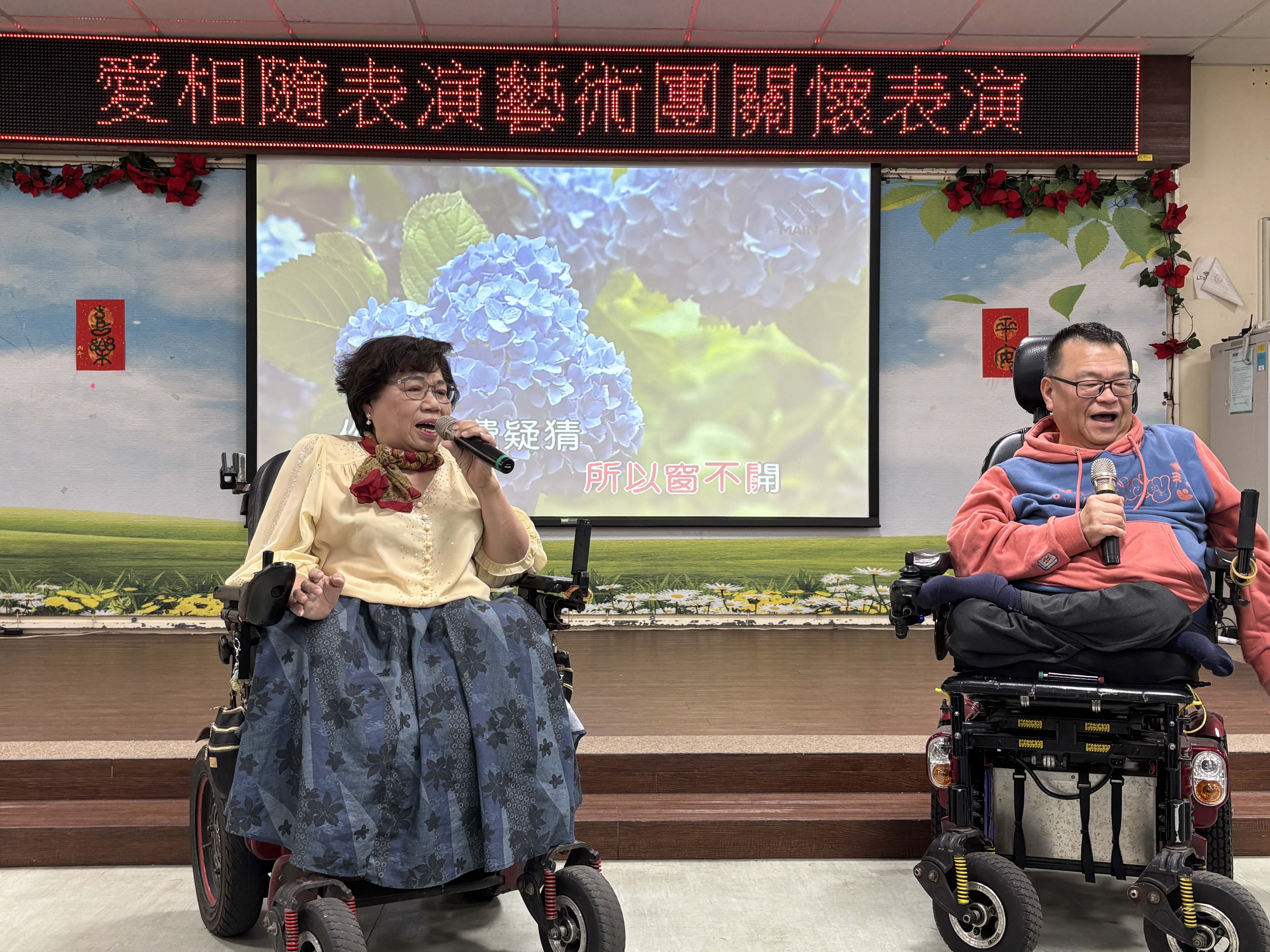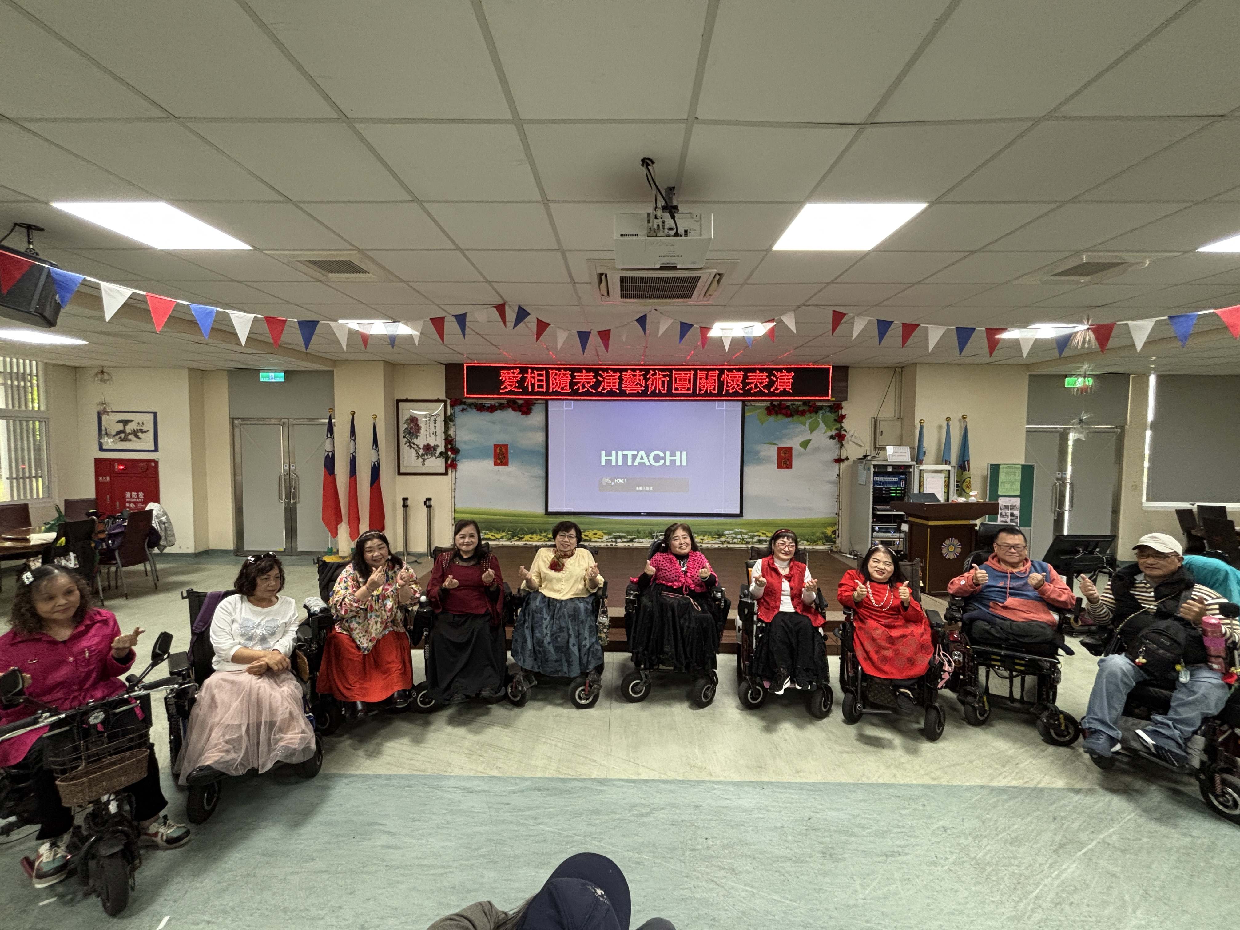 板橋榮家迎來一場充滿生命韌性的音樂饗宴,由「愛相隨表演藝術團」蘇團長帶領,他們是一群熱愛唱歌的身障人士,儘管行動不便,團員們仍克服萬難,搭乘大眾運輸工具、操控著電動輪椅來到榮家,用一首首經典老歌與榮家長輩共度溫馨午后,其「為愛出發」的精神令在場長輩深受感佩。 相關照片
