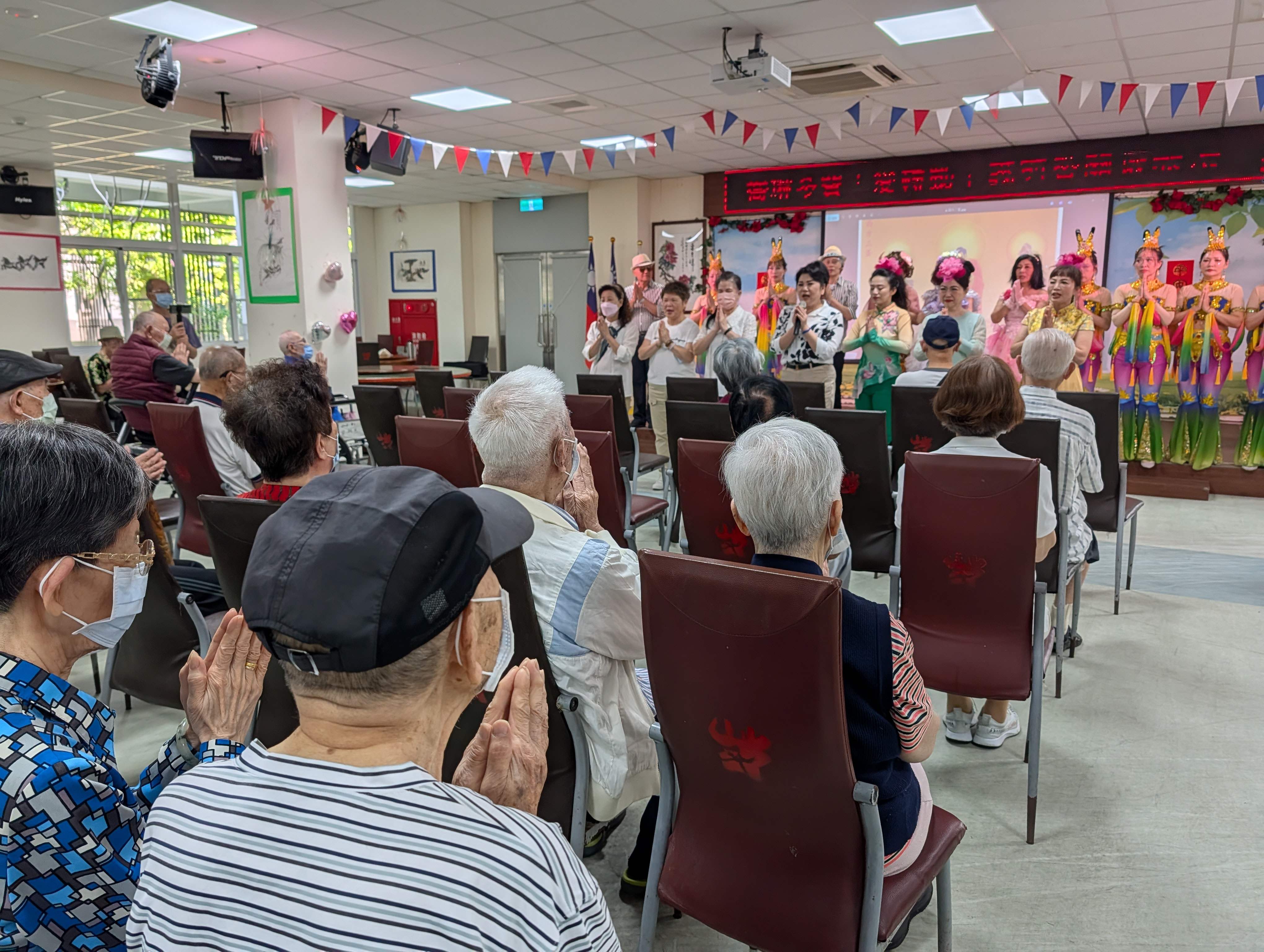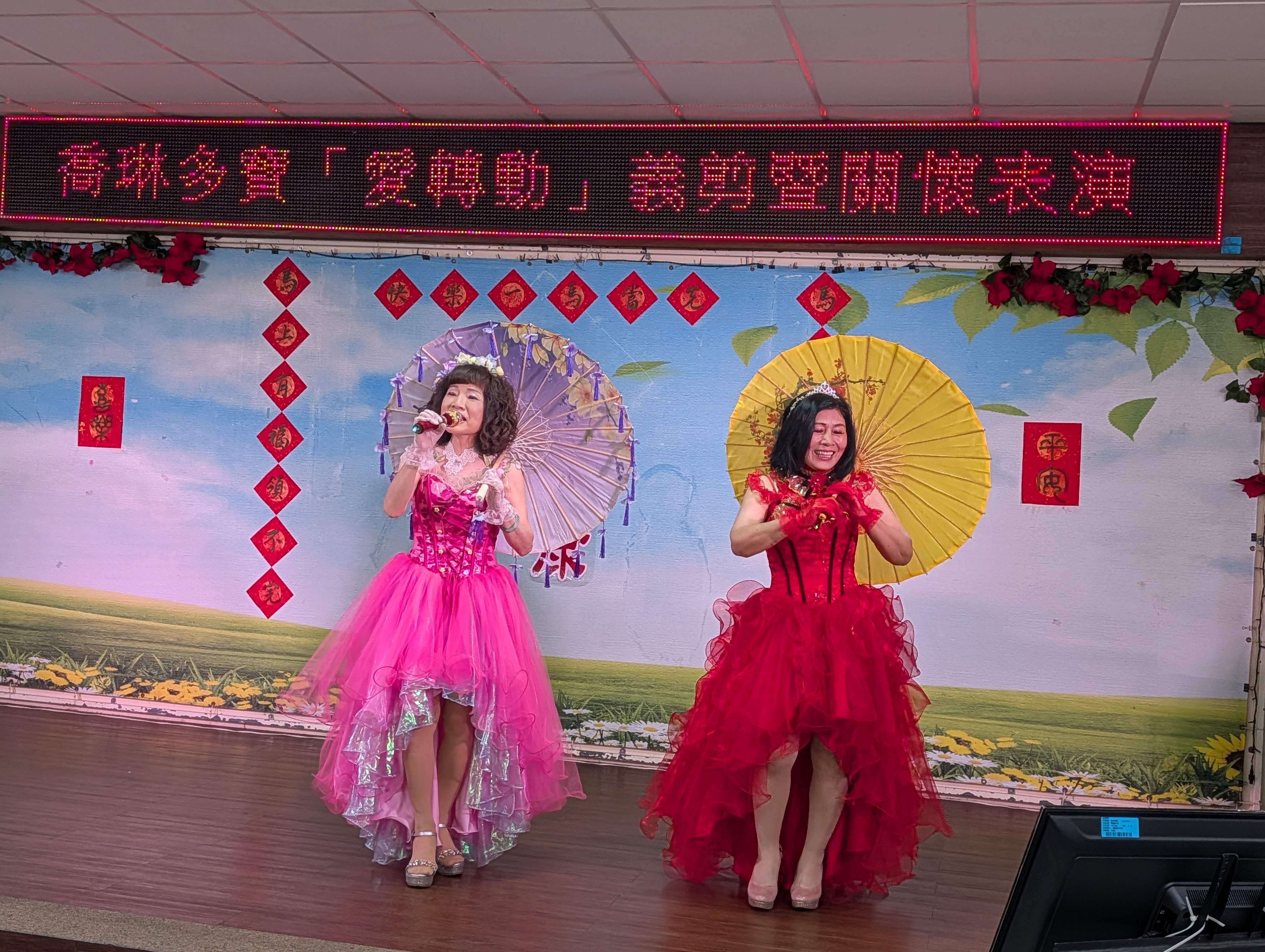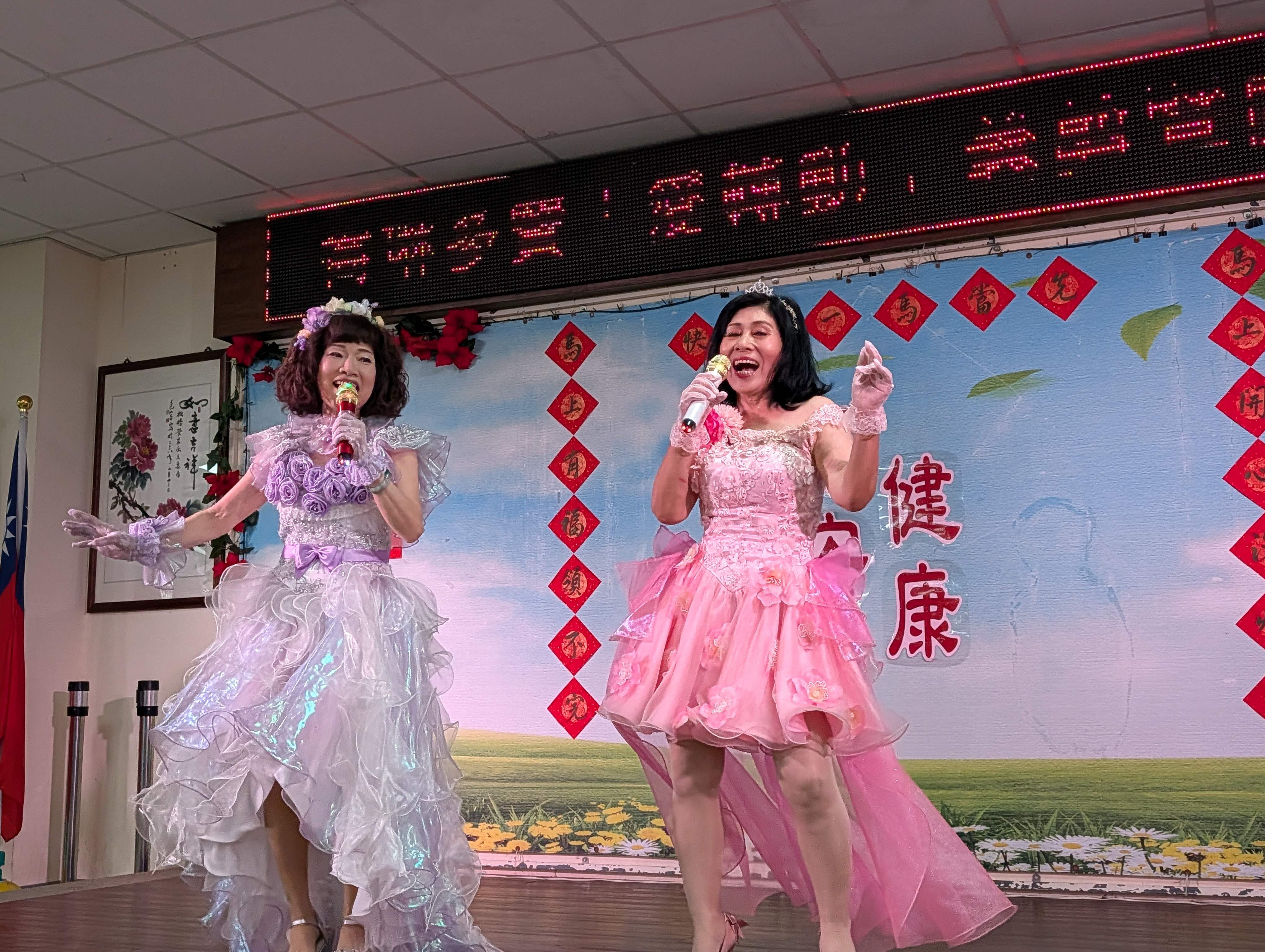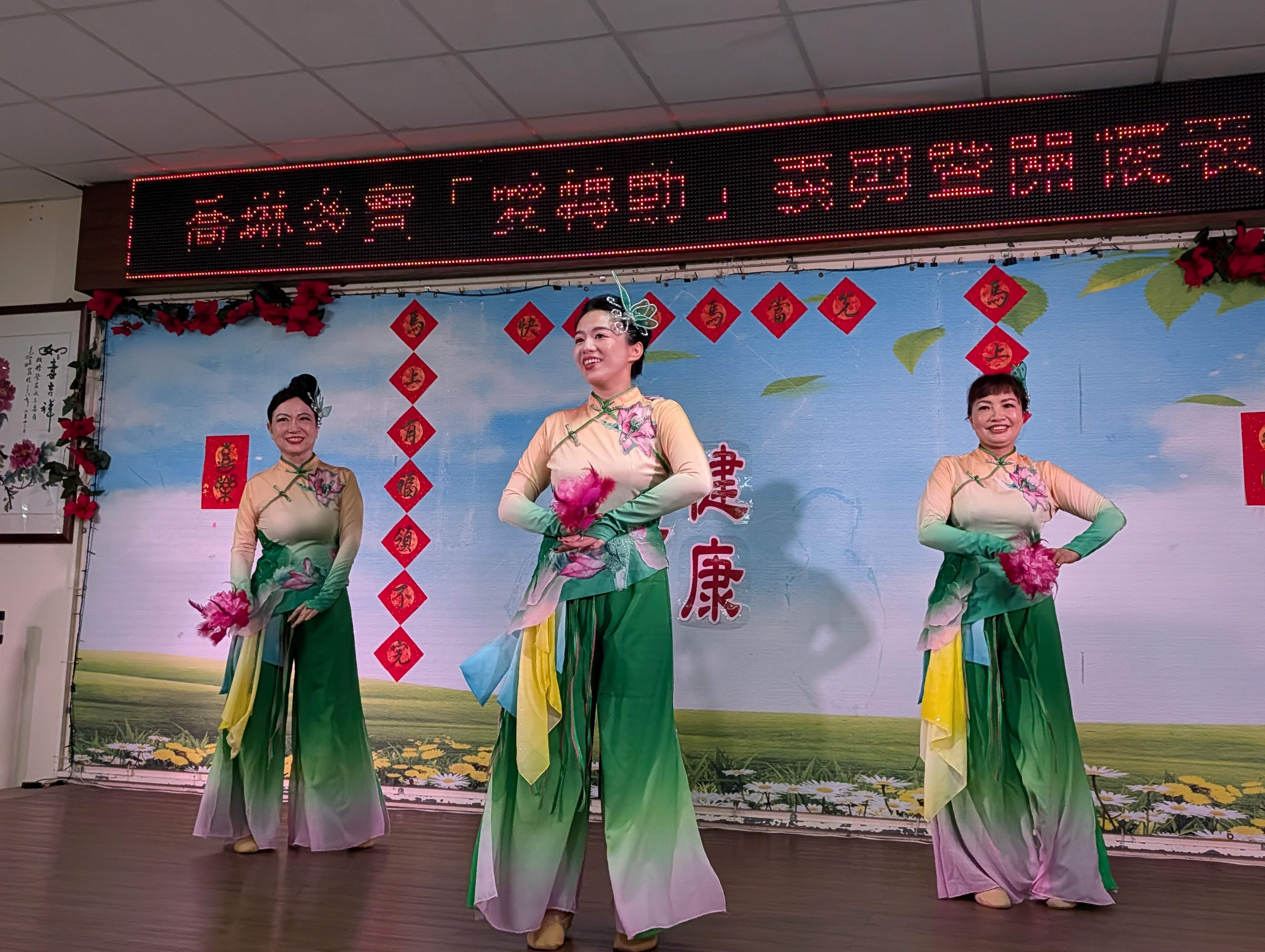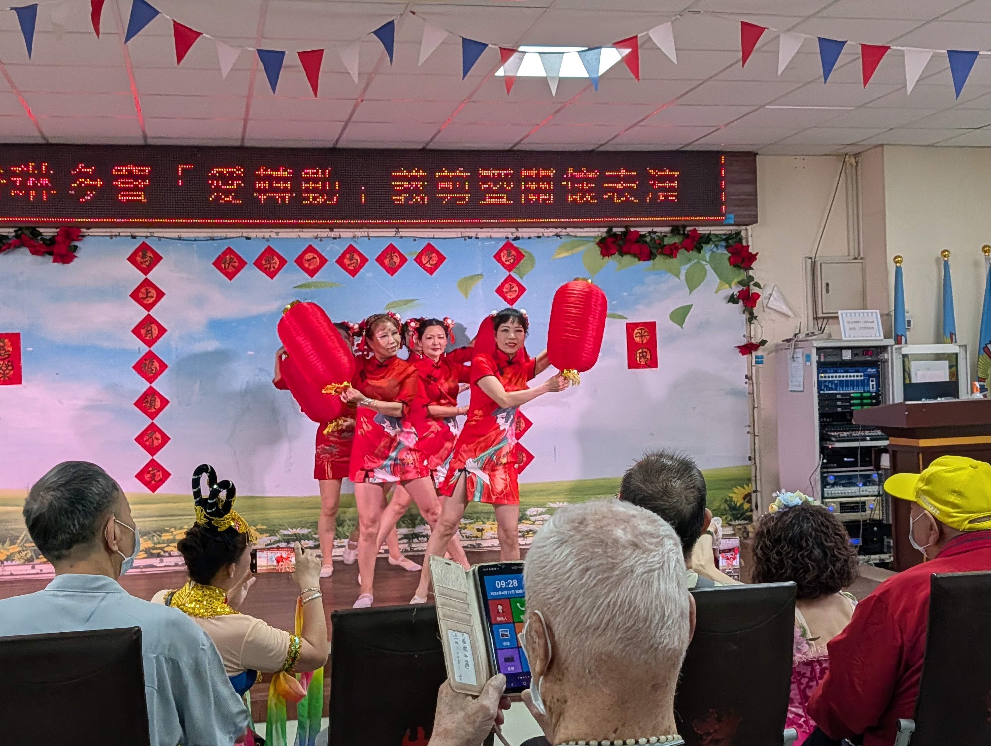 今天12位美髮師不到9點即開啟服務,長輩在他們巧手修整下,各個都精神煥發,表演緊接著由龍海薩克斯風團隊帶來「越山嶺、我的心裡沒有他」等經典曲目;歌手哲三、Y娟、曼文及鏵琍分別獻唱「幸福在這裡、一見你就笑、月亮代表我的心」等熟悉歌曲,動人歌聲引發長輩共鳴。 舞動心炫舞團由麗穎團長領軍,演出喜洋洋的「張燈結彩」與嫵媚飄逸的「舞動水鄉」;悅齡舞蹈團則以「迎春花、小酒館」展現曼妙舞姿,都讓長輩忍不住拿起手機拍下他們的美麗倩影。