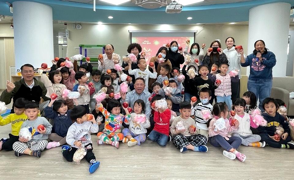 隨後,游主任及副主任一一親手將蘋果與綿羊娃娃送到每位小朋友手中,孩子們收到禮物後,臉上洋溢著開心的笑容,有的高舉禮物向家長分享喜悅,現場充滿幸福氛圍。