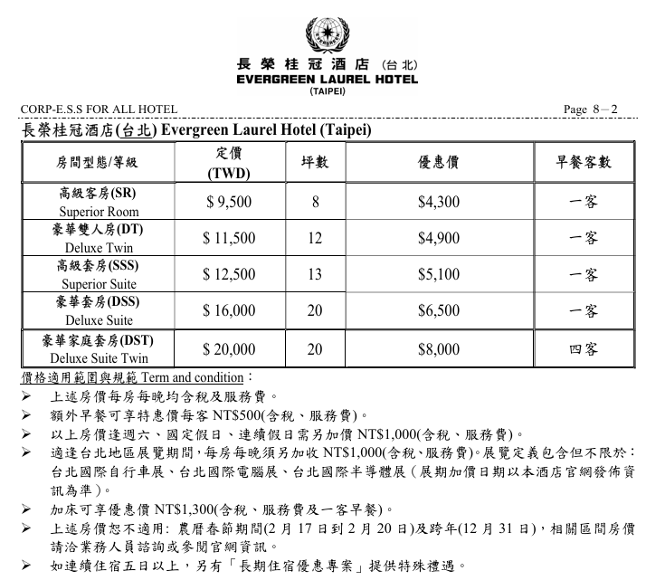 訂房時提示合約代碼,住宿時提供相關識別證件,即可享住宿優惠。 優惠房價及注意事項請見飯店提供之報價單內容。(如圖檔)。 訂房專線電話:(02) 2501-9988 電子郵件信箱:elhtpe@evergreen-hotels.com |