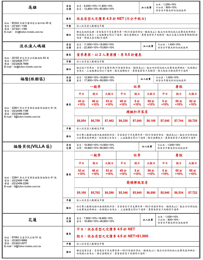 | 福容大飯店(福隆旅館區) | (02)2499-1188 | 新北市貢寮區福隆里福隆街41號