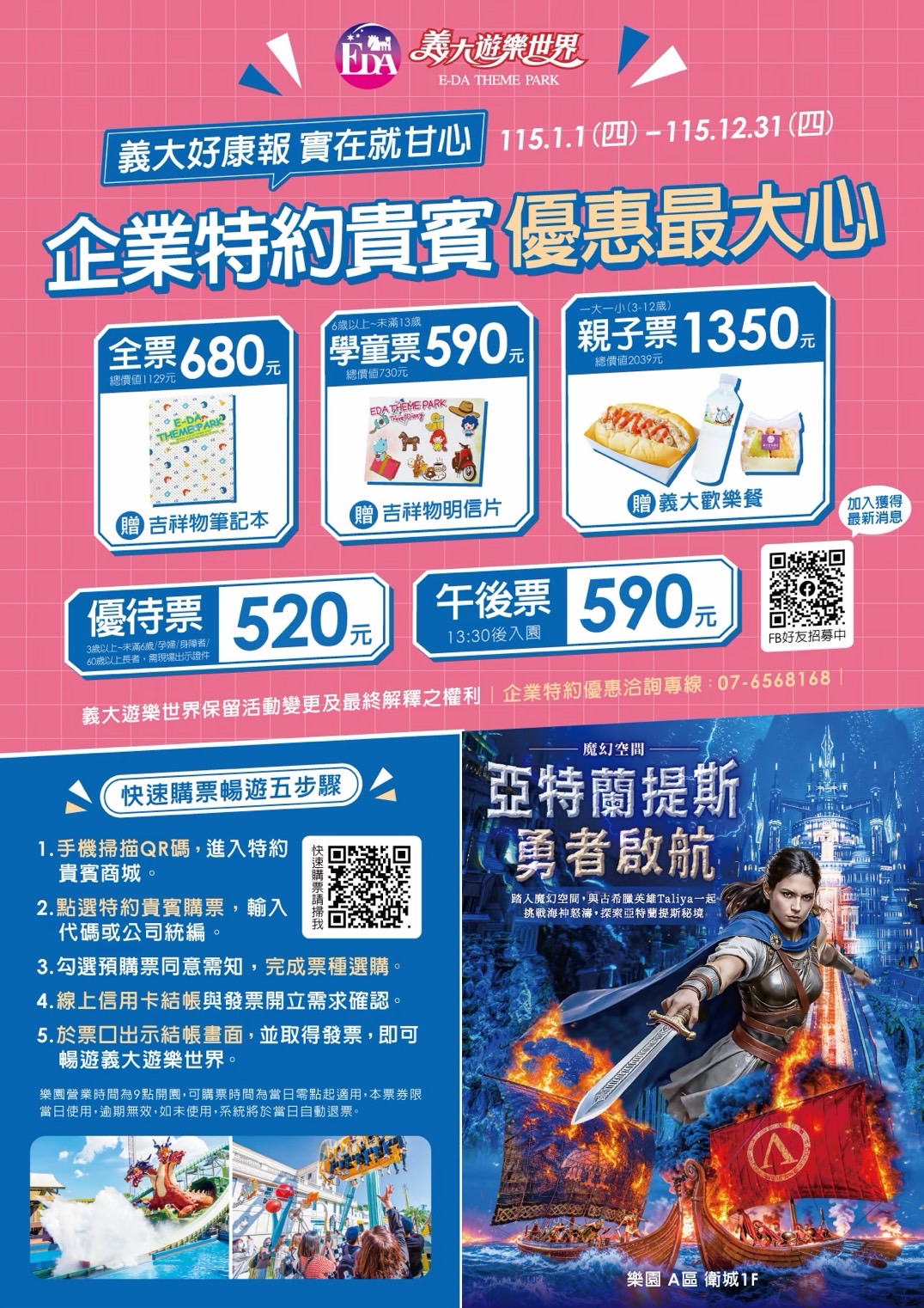 義大遊樂世界企業特約優惠資訊專區 (edathemepark.com.tw) 優惠票價請參考附件(優惠代碼:2729533),購票連結請參考下方網址。 https://shop.edathemepark.com.tw/PurchaseTickets/Partner.aspx 輸入企業識別碼(76001520或高雄榮服處)~豐富多元優惠資訊等著您!! 電洽:行銷業務專員饒先生:076568080轉3614 |