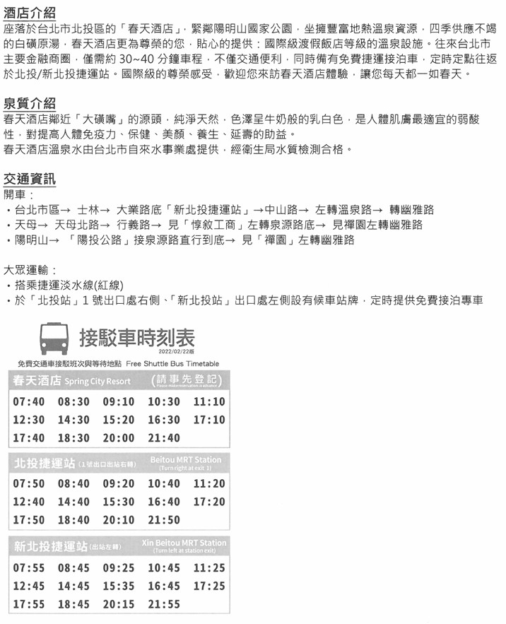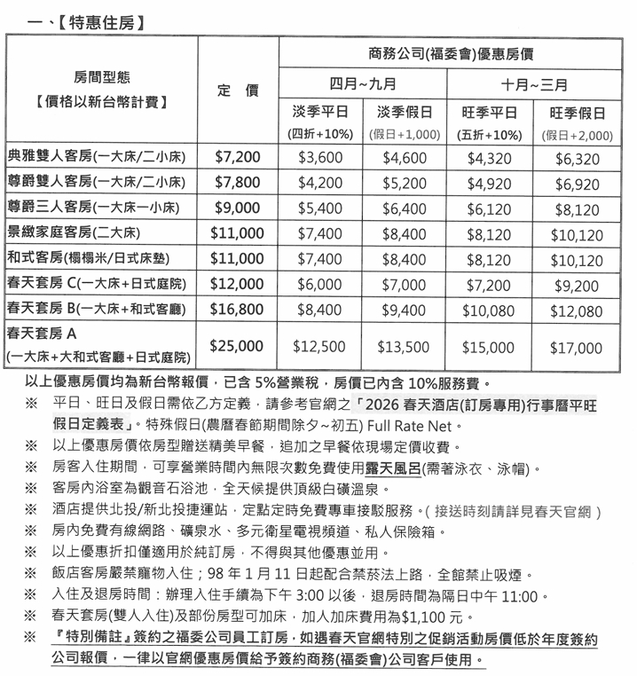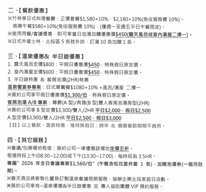 訂房時提示合約代碼或名稱,住宿時提供相關識別證件,即可享住宿、餐飲、溫泉、半日遊及會議場地租借優惠。 優惠房價及訂房注意事項請見飯店提供之報價單內容。(如下方相關照片檔)。 |