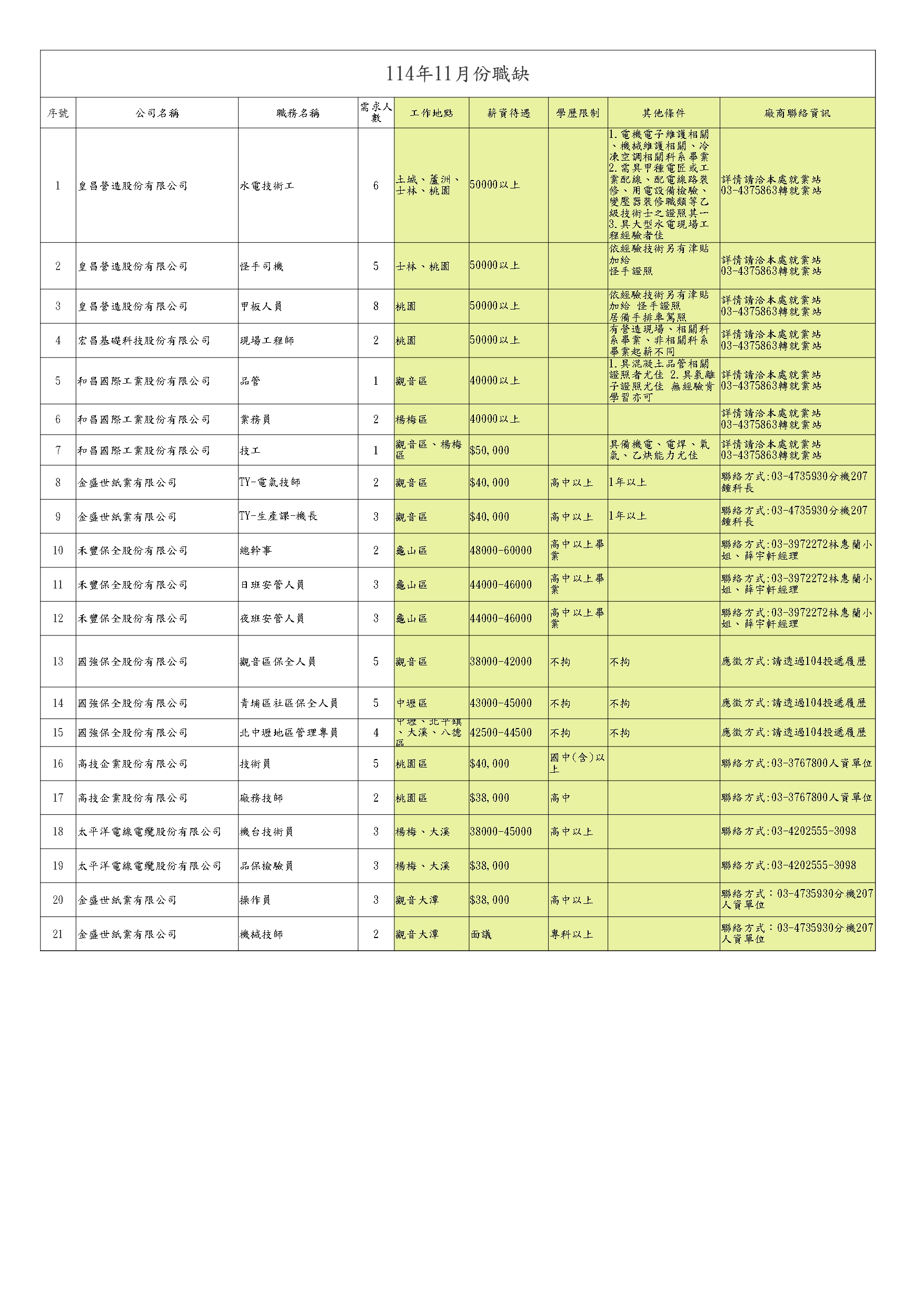 【桃園市榮服處】廠商職缺表(114.11.1)