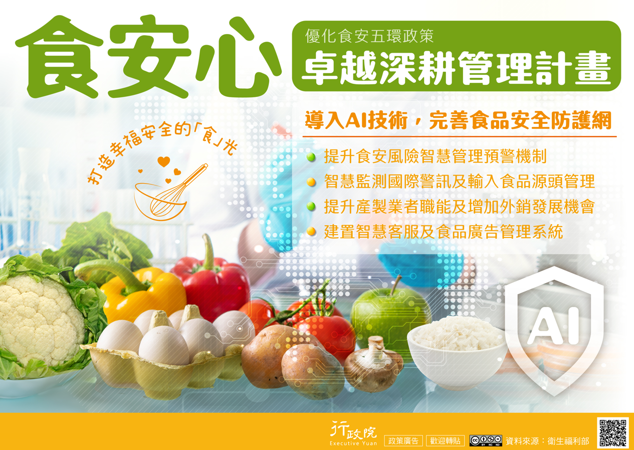 為持續精進食安管理、守護國人飲食安全,優化食安五環政策;政府核定「食安心-卓越深耕管理計畫」,導入AI技術,以完善食品安全防護網。