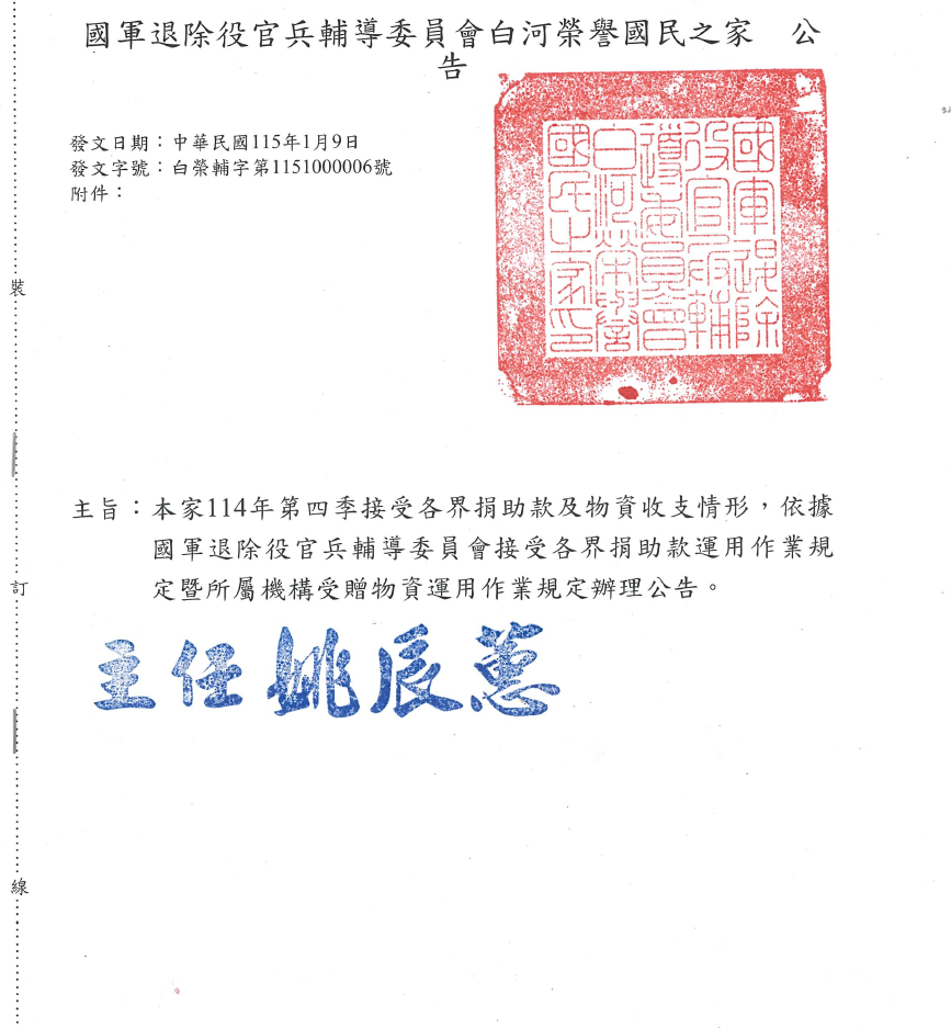白河榮家114年第四季接受各界捐助款及物資收支情形