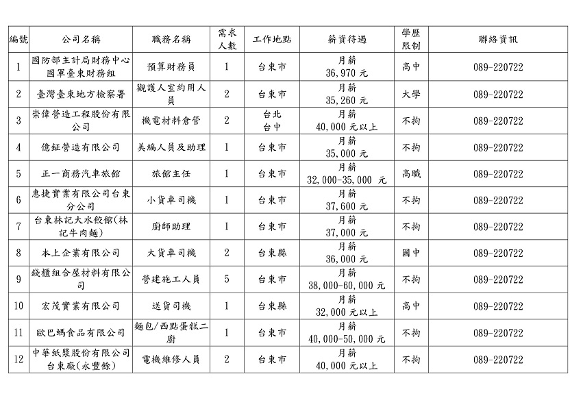 發布日期:114-12-09 資料來源:臺東縣榮民服務處 【臺東榮服處】廠商職缺表_114.12.09 附件下載 檔案名稱 更新日期 下載次數 【臺東榮服處】廠商職缺表_114.12.09.pdf 114-12-09 5