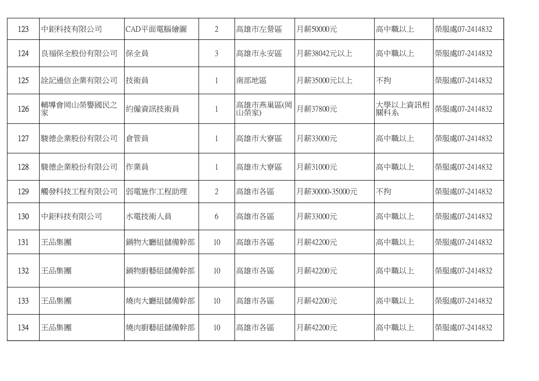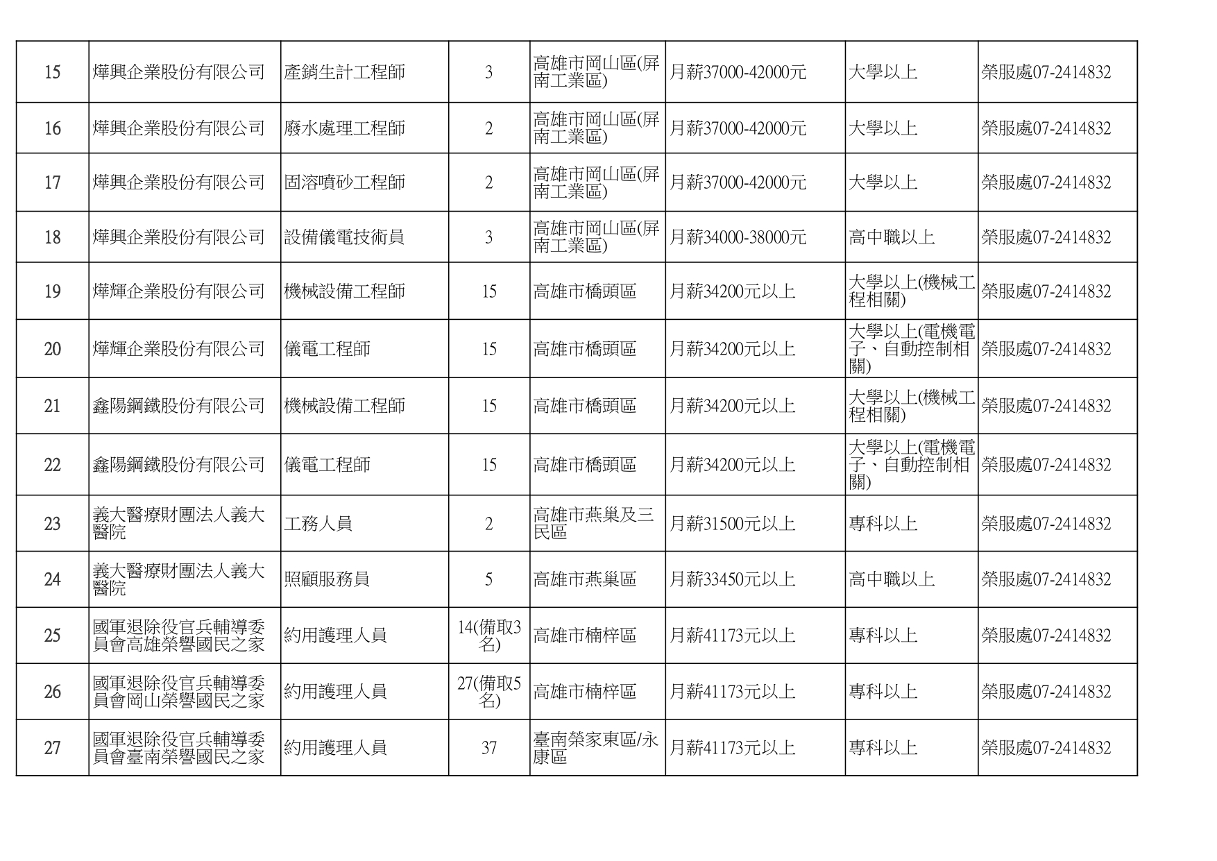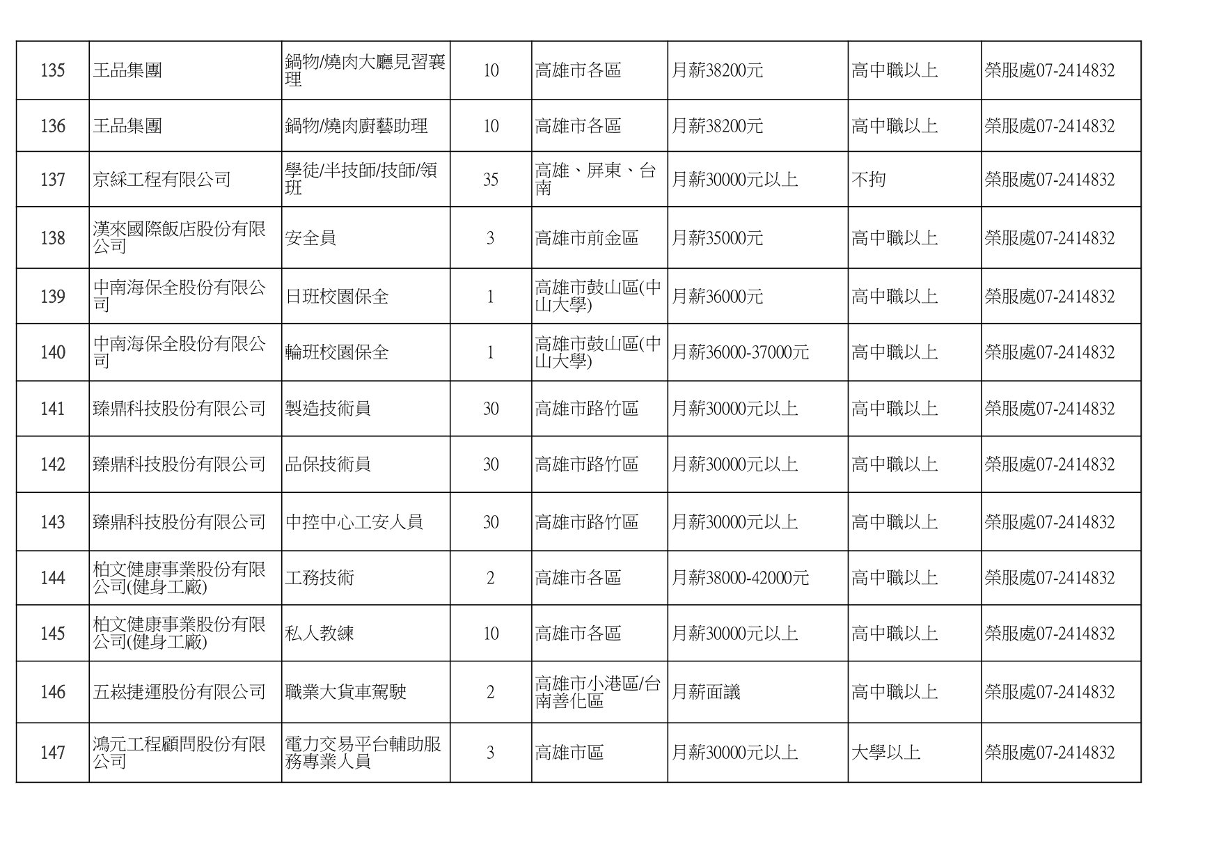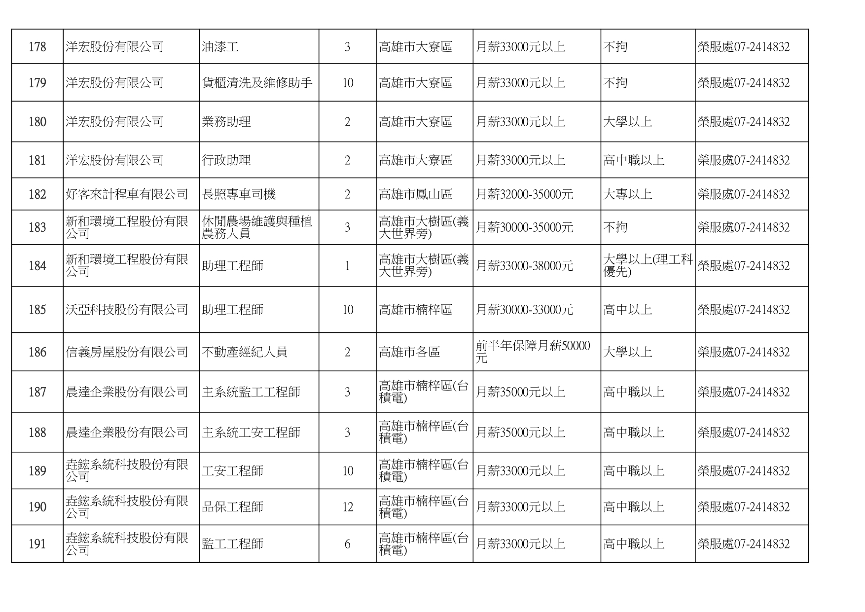 發布日期:114-12-10 資料來源:高雄市榮民服務處 高雄榮服處-廠商職缺列表114.12.10_page-0001有就業需求之退除役官兵,請把握機會! 如有就(轉)業需求,歡迎洽詢本處就業站(07-2414832) 相關照片 高雄榮服處-廠商職缺列表114.12.10_page-0002 高雄榮服處-廠商職缺列表114.12.10_page-0003 高雄榮服處-廠商職缺列表114.12.10_page-0004 高雄榮服處-廠商職缺列表114.12.10_page-0005 高雄榮服處-廠商職缺列表114.12.10_page-0006 高雄榮服處-廠商職缺列表114.12.10_page-0007 高雄榮服處-廠商職缺列表114.12.10_page-0008 高雄榮服處-廠商職缺列表114.12.10_page-0009 高雄榮服處-廠商職缺列表114.12.10_page-0010 高雄榮服處-廠商職缺列表114.12.10_page-0011 高雄榮服處-廠商職缺列表114.12.10_page-0012 高雄榮服處-廠商職缺列表114.12.10_page-0013 高雄榮服處-廠商職缺列表114.12.10_page-0014 高雄榮服處-廠商職缺列表114.12.10_page-0015 高雄榮服處-廠商職缺列表114.12.10_page-0016 高雄榮服處-廠商職缺列表114.12.10_page-0017 高雄榮服處-廠商職缺列表114.12.10_page-0018 高雄榮服處-廠商職缺列表114.12.10_page-0019 高雄榮服處-廠商職缺列表114.12.10_page-0020 高雄榮服處-廠商職缺列表114.12.10_page-0021 附件下載 檔案名稱 更新日期 下載次數 高雄榮服處-廠商職缺列表114.12.10.pdf 114-12-10 0
