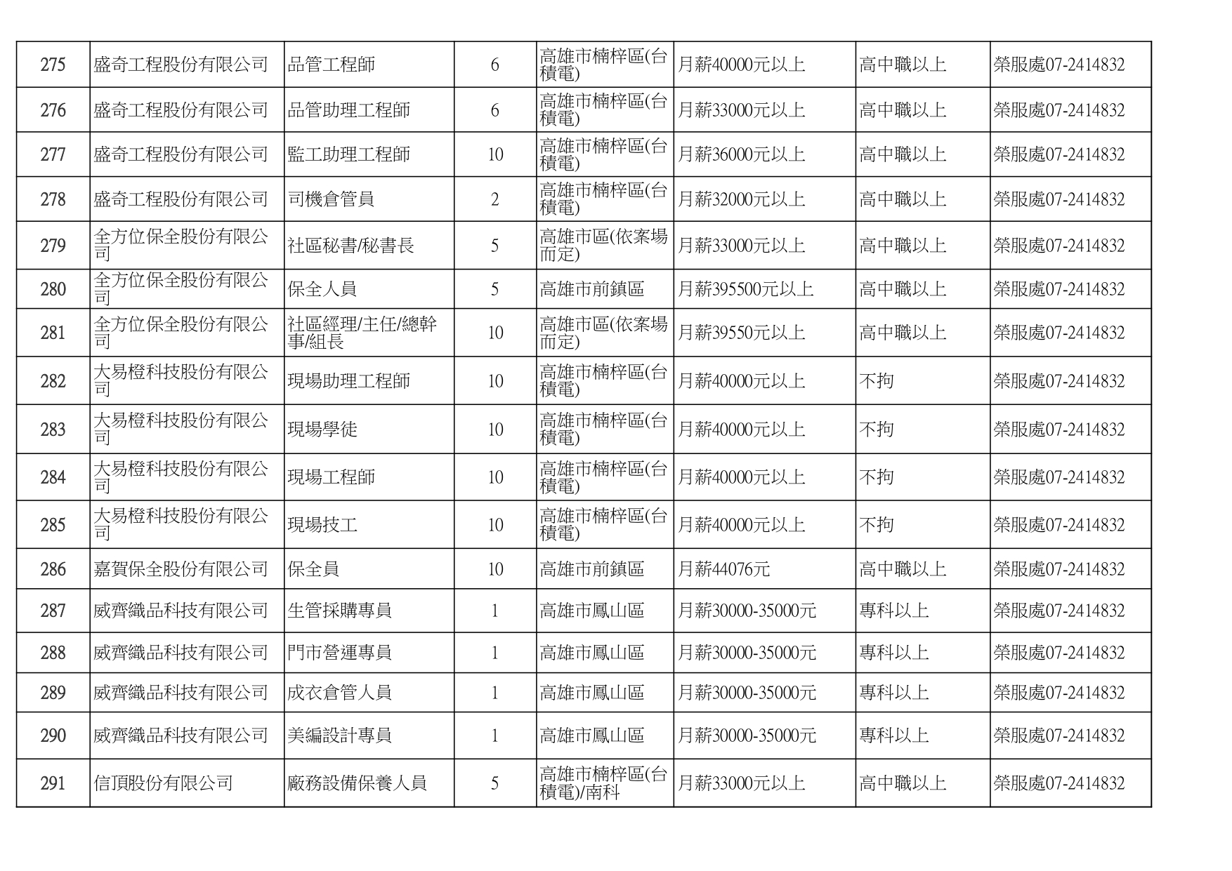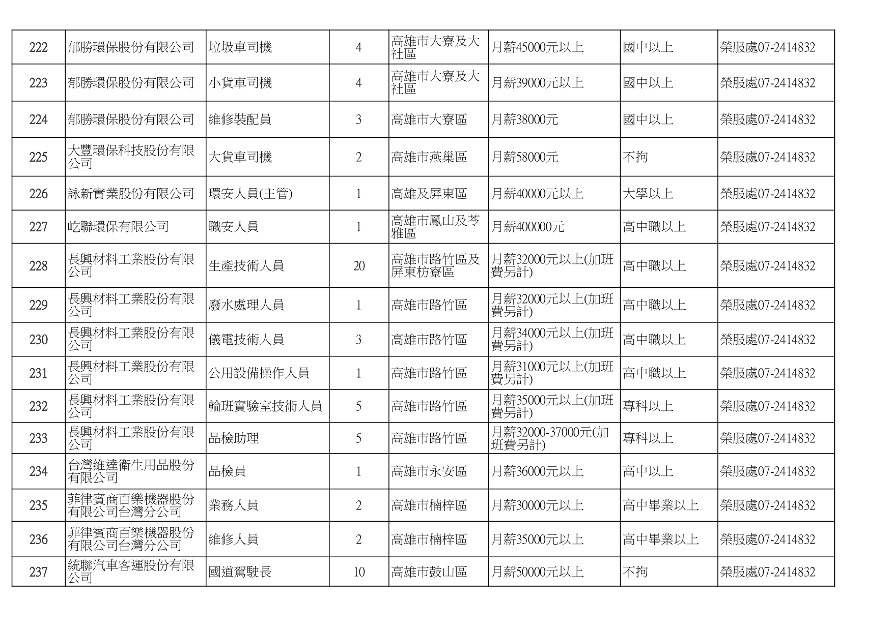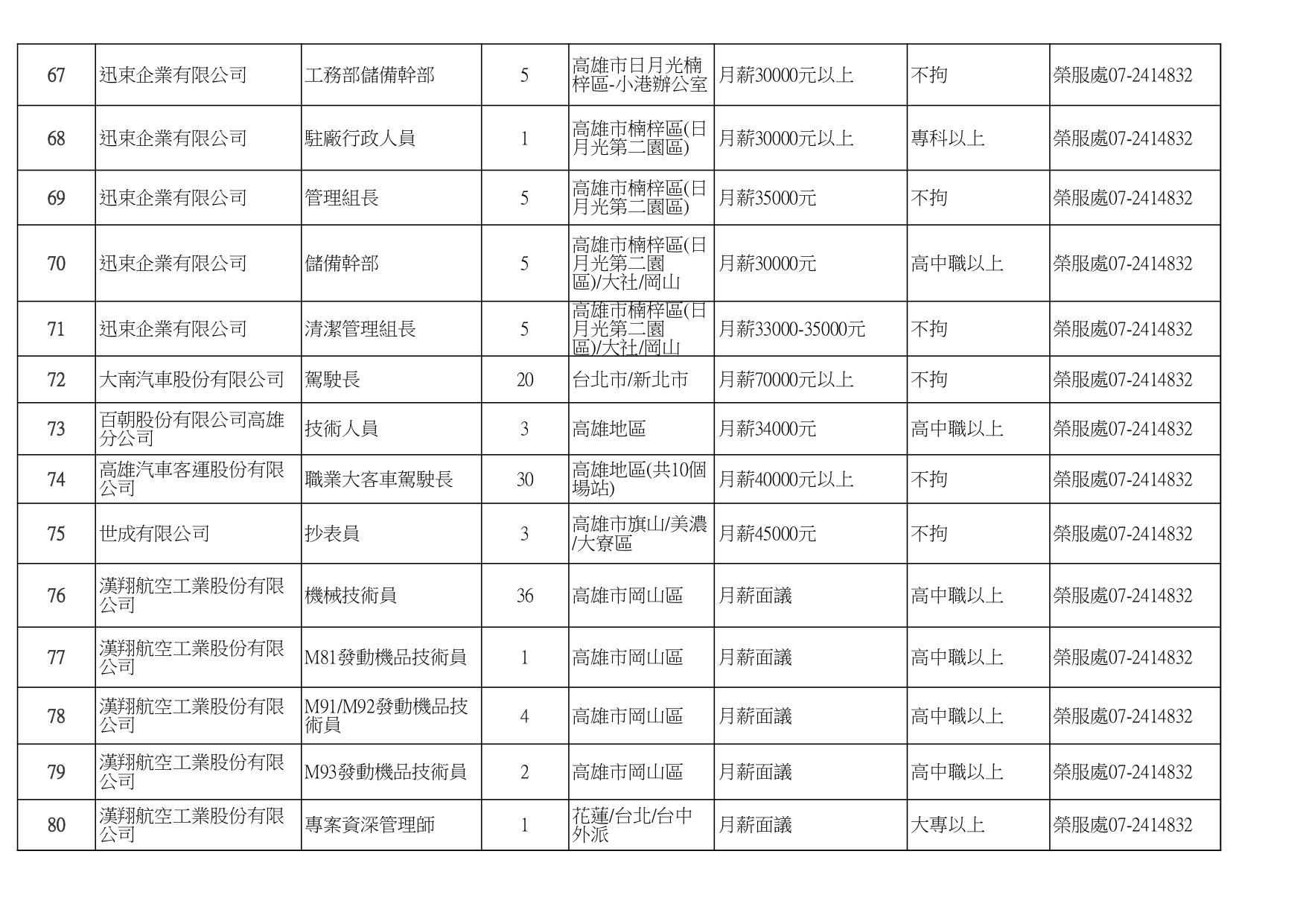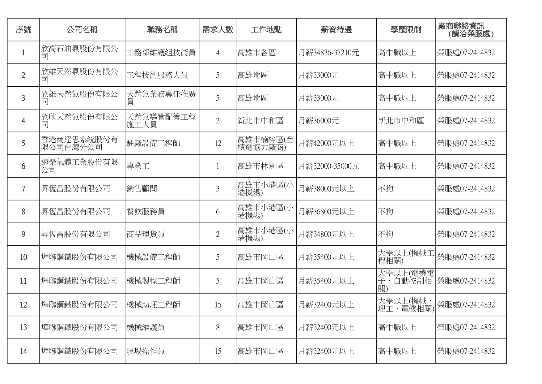 發布日期:114-12-10 資料來源:高雄市榮民服務處 高雄榮服處-廠商職缺列表114.12.10_page-0001有就業需求之退除役官兵,請把握機會! 如有就(轉)業需求,歡迎洽詢本處就業站(07-2414832) 相關照片 高雄榮服處-廠商職缺列表114.12.10_page-0002 高雄榮服處-廠商職缺列表114.12.10_page-0003 高雄榮服處-廠商職缺列表114.12.10_page-0004 高雄榮服處-廠商職缺列表114.12.10_page-0005 高雄榮服處-廠商職缺列表114.12.10_page-0006 高雄榮服處-廠商職缺列表114.12.10_page-0007 高雄榮服處-廠商職缺列表114.12.10_page-0008 高雄榮服處-廠商職缺列表114.12.10_page-0009 高雄榮服處-廠商職缺列表114.12.10_page-0010 高雄榮服處-廠商職缺列表114.12.10_page-0011 高雄榮服處-廠商職缺列表114.12.10_page-0012 高雄榮服處-廠商職缺列表114.12.10_page-0013 高雄榮服處-廠商職缺列表114.12.10_page-0014 高雄榮服處-廠商職缺列表114.12.10_page-0015 高雄榮服處-廠商職缺列表114.12.10_page-0016 高雄榮服處-廠商職缺列表114.12.10_page-0017 高雄榮服處-廠商職缺列表114.12.10_page-0018 高雄榮服處-廠商職缺列表114.12.10_page-0019 高雄榮服處-廠商職缺列表114.12.10_page-0020 高雄榮服處-廠商職缺列表114.12.10_page-0021 附件下載 檔案名稱 更新日期 下載次數 高雄榮服處-廠商職缺列表114.12.10.pdf 114-12-10 0