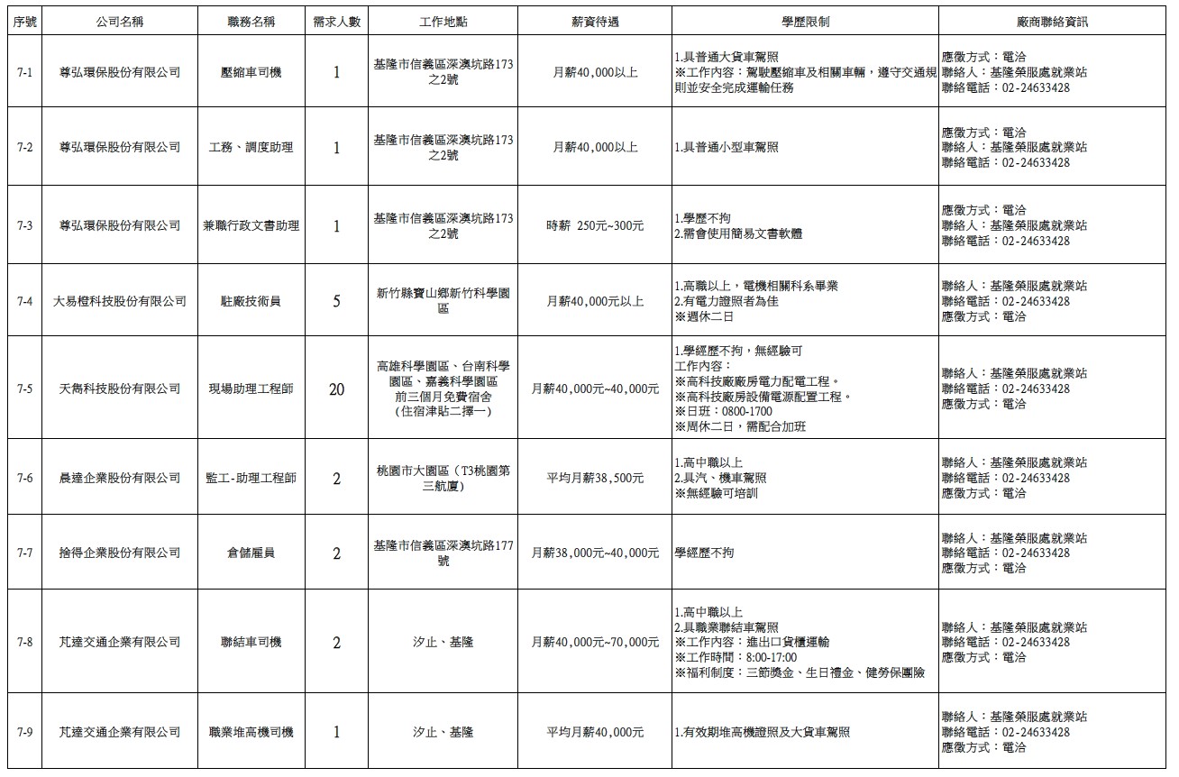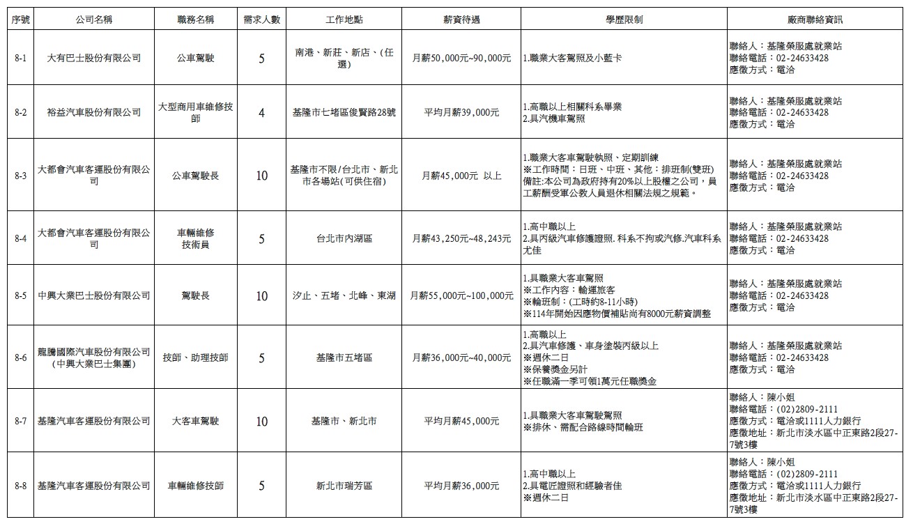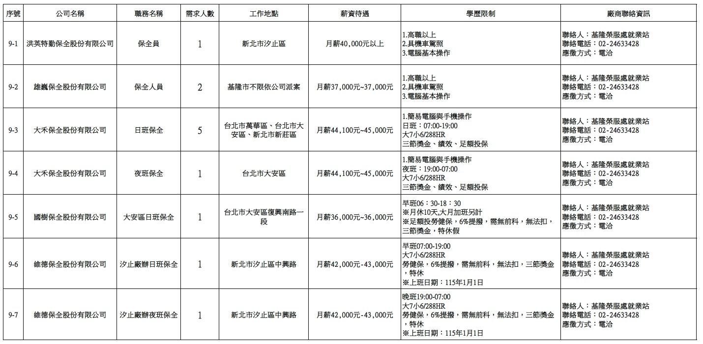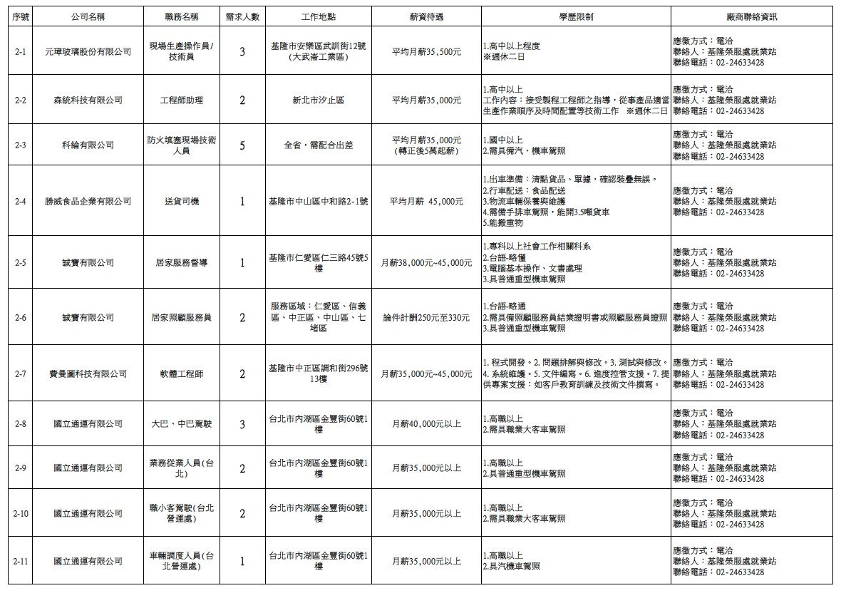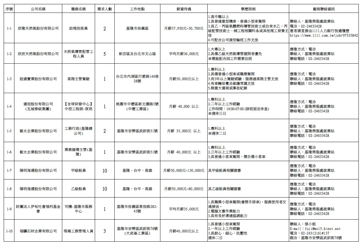 發布日期:115-03-31 資料來源:基隆市榮民服務處 【基隆市榮服處】廠商職缺表(115.03.31)-1 相關照片 【基隆市榮服處】廠商職缺表(115.03.31)-2 【基隆市榮服處】廠商職缺表(115.03.31)-3 【基隆市榮服處】廠商職缺表(115.03.31)-4 【基隆市榮服處】廠商職缺表(115.03.31)-5 【基隆市榮服處】廠商職缺表(115.03.31)-6 【基隆市榮服處】廠商職缺表(115.03.31)-7 【基隆市榮服處】廠商職缺表(115.03.31)-8 【基隆市榮服處】廠商職缺表(115.03.31)-9 【基隆市榮服處】廠商職缺表(115.03.31)-10 附件下載 檔案名稱 更新日期 下載次數 【基隆市榮服處】廠商職缺表(115.03.31).pdf 115-03-31 2