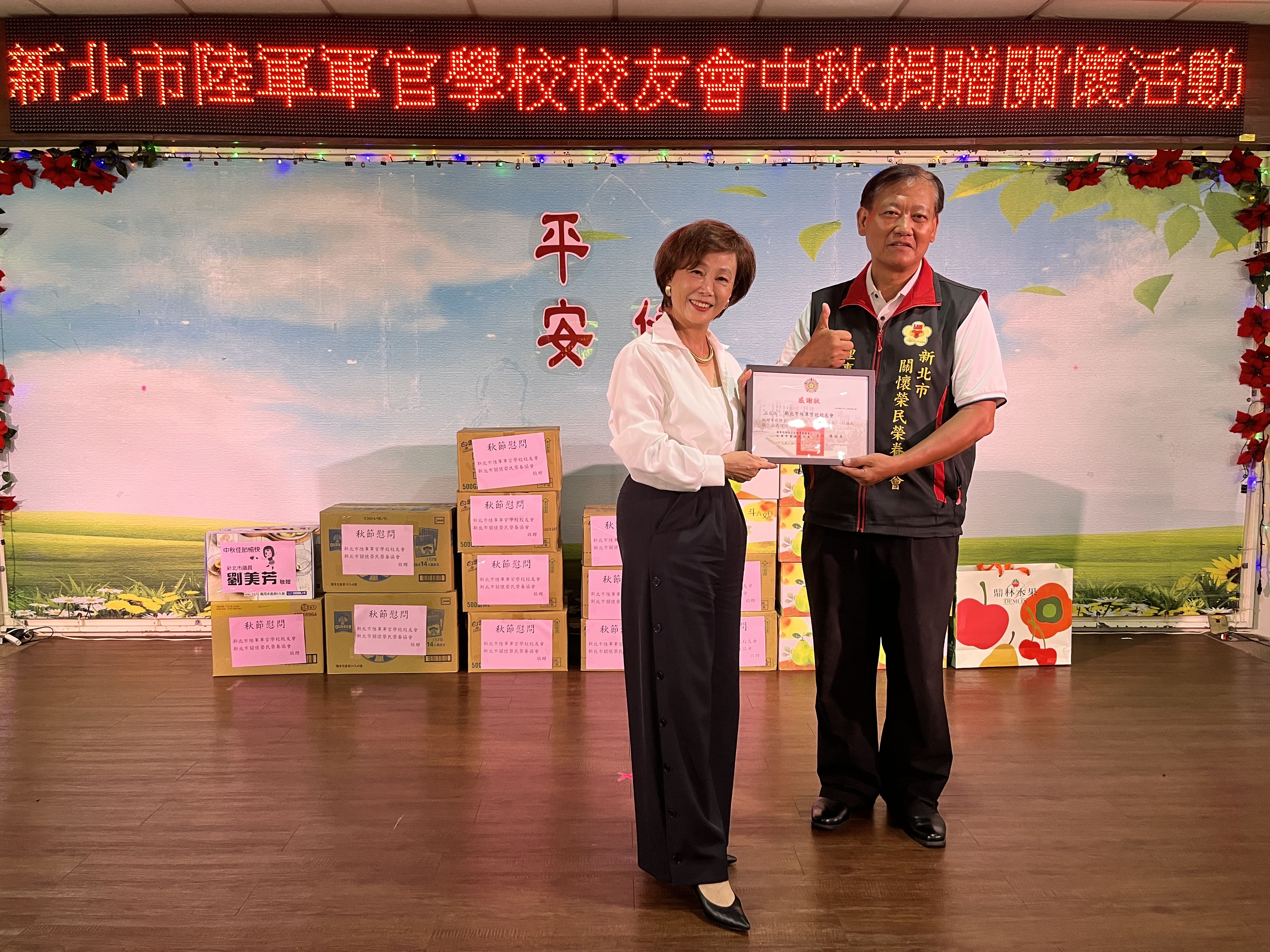 協會、校友會及議員們準備了奶粉、大燕麥隨身包、洗碗精、冷洗精、柚子、水果等物品,來祝賀長輩們過節,並一一逐桌向長輩們問候、話家常,彼此祝福身體健康及中秋節快樂。