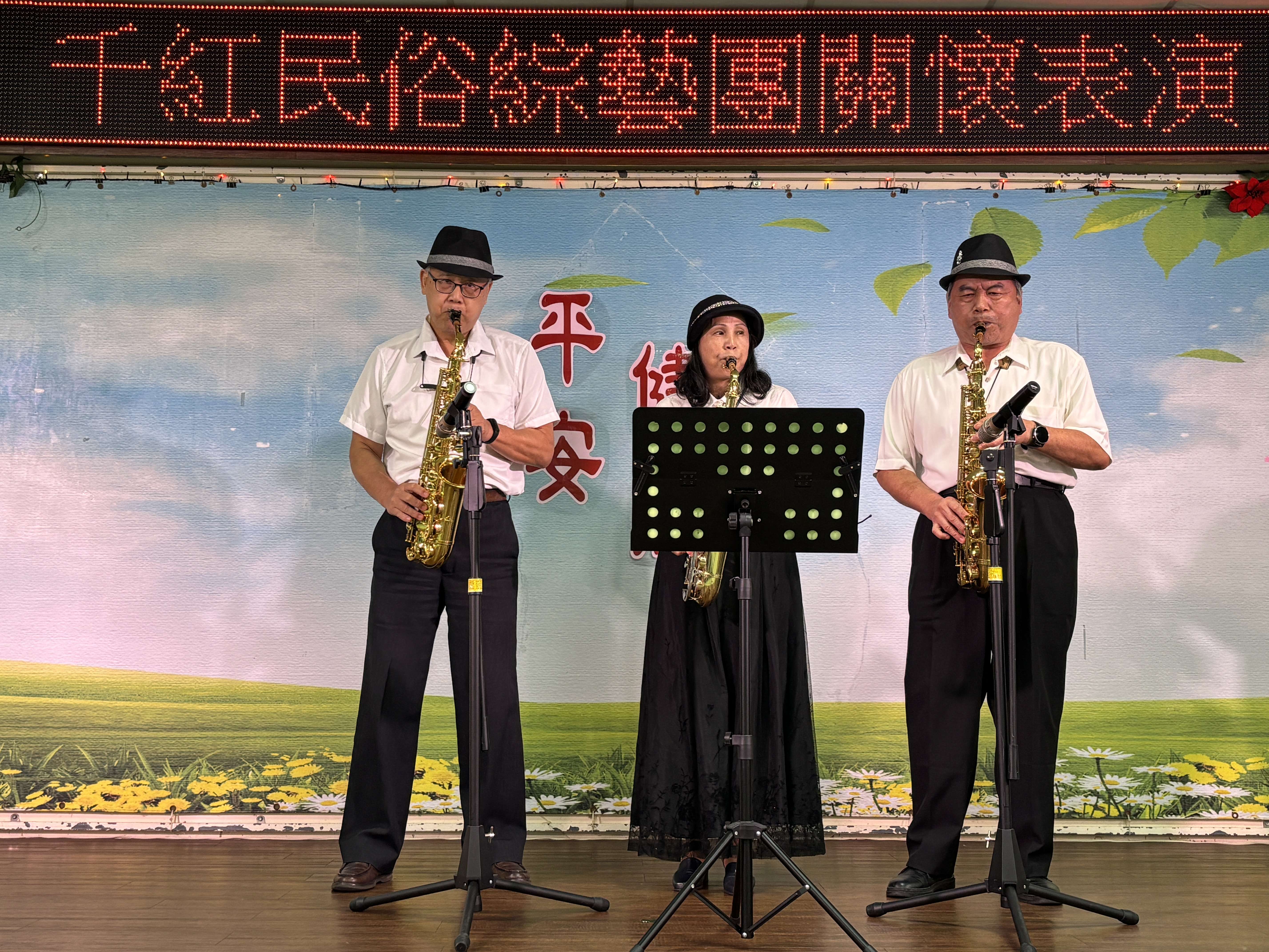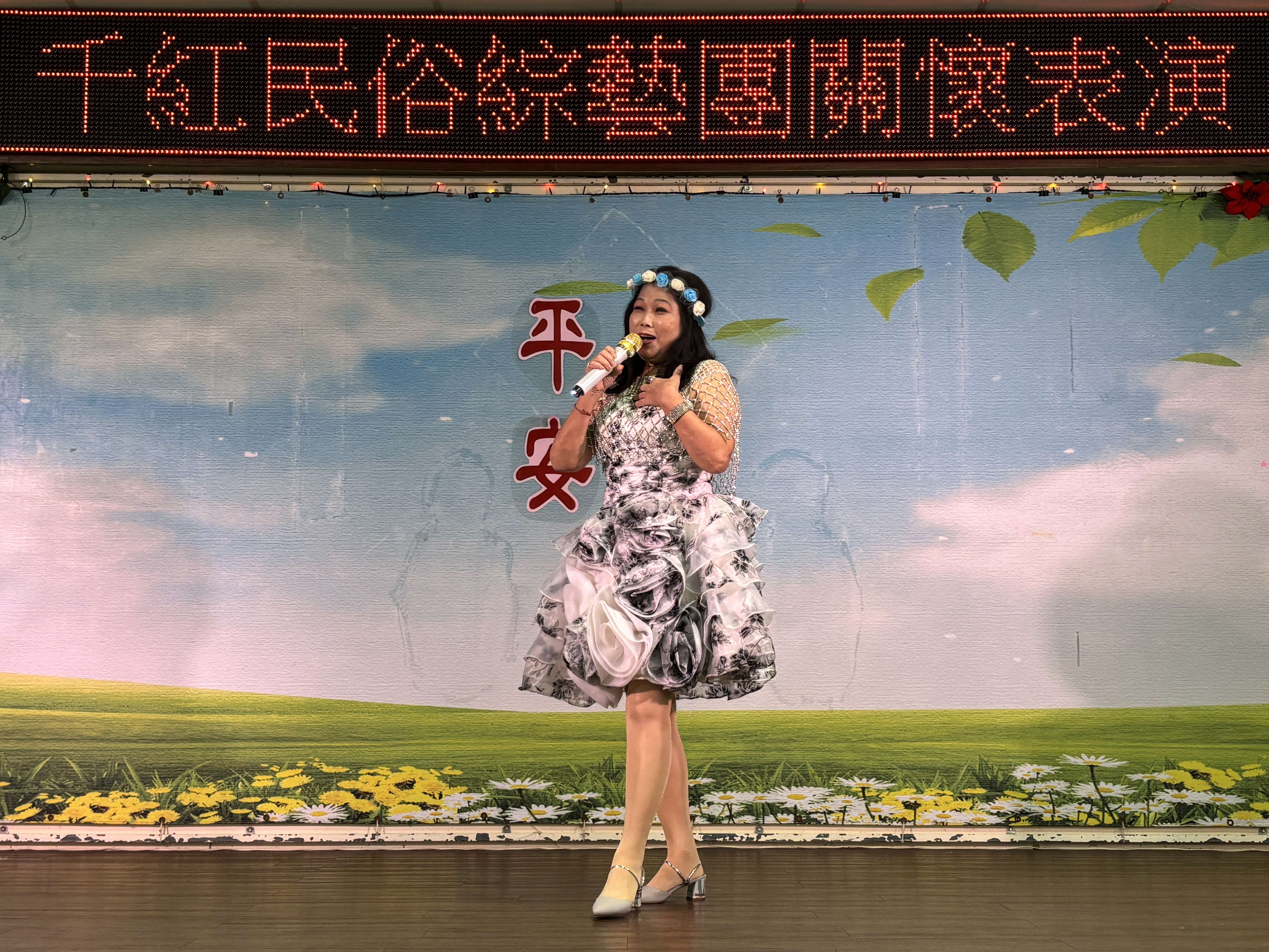 本次演出節目精彩紛呈,由芳馨舞蹈團率先登場,帶來輕盈曼妙的「花舞蝶影」,中間呈現充滿古典雅韻的古典舞「荷塘月色」,最後則以充滿陽剛氣概的「我是男子漢」,展現了不同舞蹈風貌予長輩欣賞。穿插舞蹈間的是多位表演者的深情演唱,有森成團長演唱「誓言、兩相依」;充滿真摯情感,麗紅一曲「為青春歡唱」鼓勵人心;容容帶來懷舊的「寄情、台北的天空」,勾起長輩美好回憶;沛琳演唱「訪英台、情人橋」,展現其細膩的聲線;偵鈺則獻唱「又是細雨、你曾經愛過我」,歌聲打動人心,此外,還有欽憲、壽林、美玲組成的薩克斯風吹奏,帶來「往事只能回味、女兒圈」兩首經典老歌,悠揚的樂音讓長輩現場氣氛溫馨。