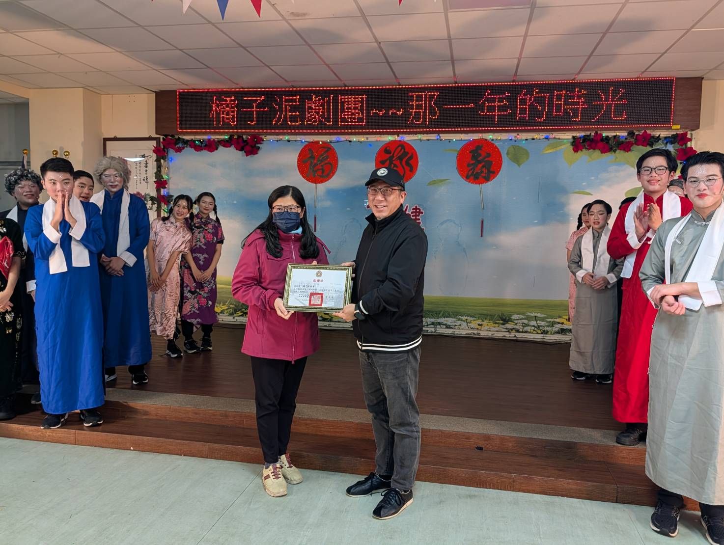 橘子泥劇團擅長以音樂帶動情感,此次演出的「那一年的時光」,精選多首橫跨數十年的傳唱經典,勾起台下長輩們年輕時的意氣風發與浪漫情懷。 當「山頂的黑狗兄」輕快的音樂響起,長輩們不由自主地跟著拍手,隨後「愛神、可愛的玫瑰花、少年的我」等名曲接力演出,隨著演員們生動的詮釋,長輩們彷彿穿越時空,回到了屬於自己的金色年代,許多長輩們都聽得如癡如醉,跟著音樂開心擺動,跟著演員神情一起微笑。 劇團不僅帶來聽覺饗宴,更提醒長輩生活中要「好好愛自己」,與其他同住的長輩們一起「開開心心、打打鬧鬧」地過日子,幽默看待生活、珍惜當下情誼,長輩們都十分認同,並跟著有趣台詞莞爾一笑。 板橋榮家非常感謝橘子泥劇團帶來這麼精彩且深具意義的演出,音樂與戲劇是最好的心靈良藥,讓長輩透過這些熟悉的旋律,情感得以抒發,生活也找到動力與熱情,更讓榮家充滿歡樂。