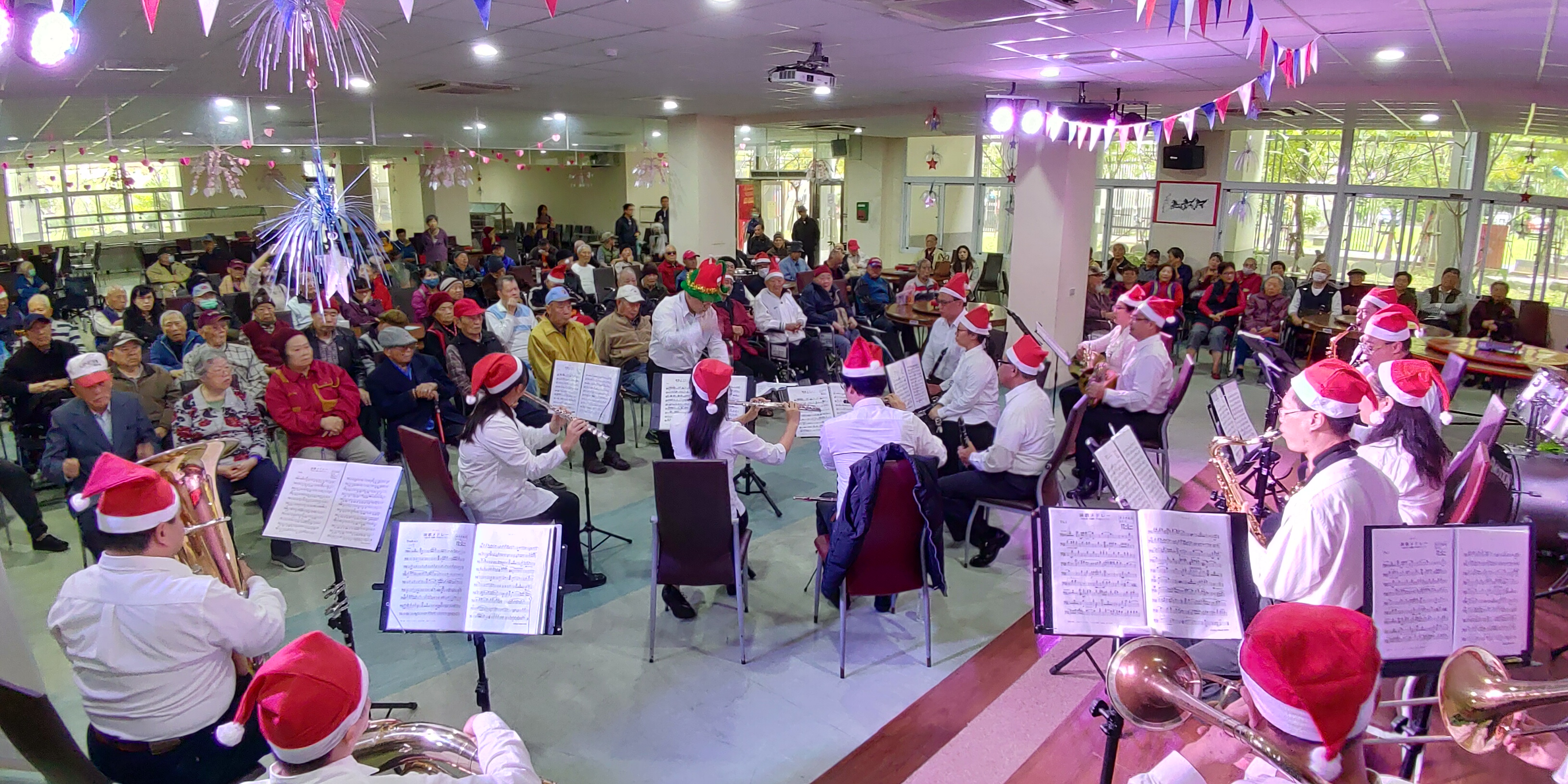 樂團為了長輩們特別演奏多首鄧麗君的成名曲及國語老歌,讓長輩們忍不住就跟著音樂哼唱起來,表演中穿插介紹不同的樂器,也讓長輩們聽不同樂器的聲音,長輩們笑說今天真的是長知識了。樂團中有許多成員都是從南部上來表演,有些是夫妻、父女及父子的組合,大家都是利用空餘時間來作公益,關懷長輩們,讓長輩們這個假日午後特別不一樣,就像來到國家音樂廳般的規格饗宴,最後,樂團也透過<感恩的心>來感謝榮家長輩們以前為國家的付出。