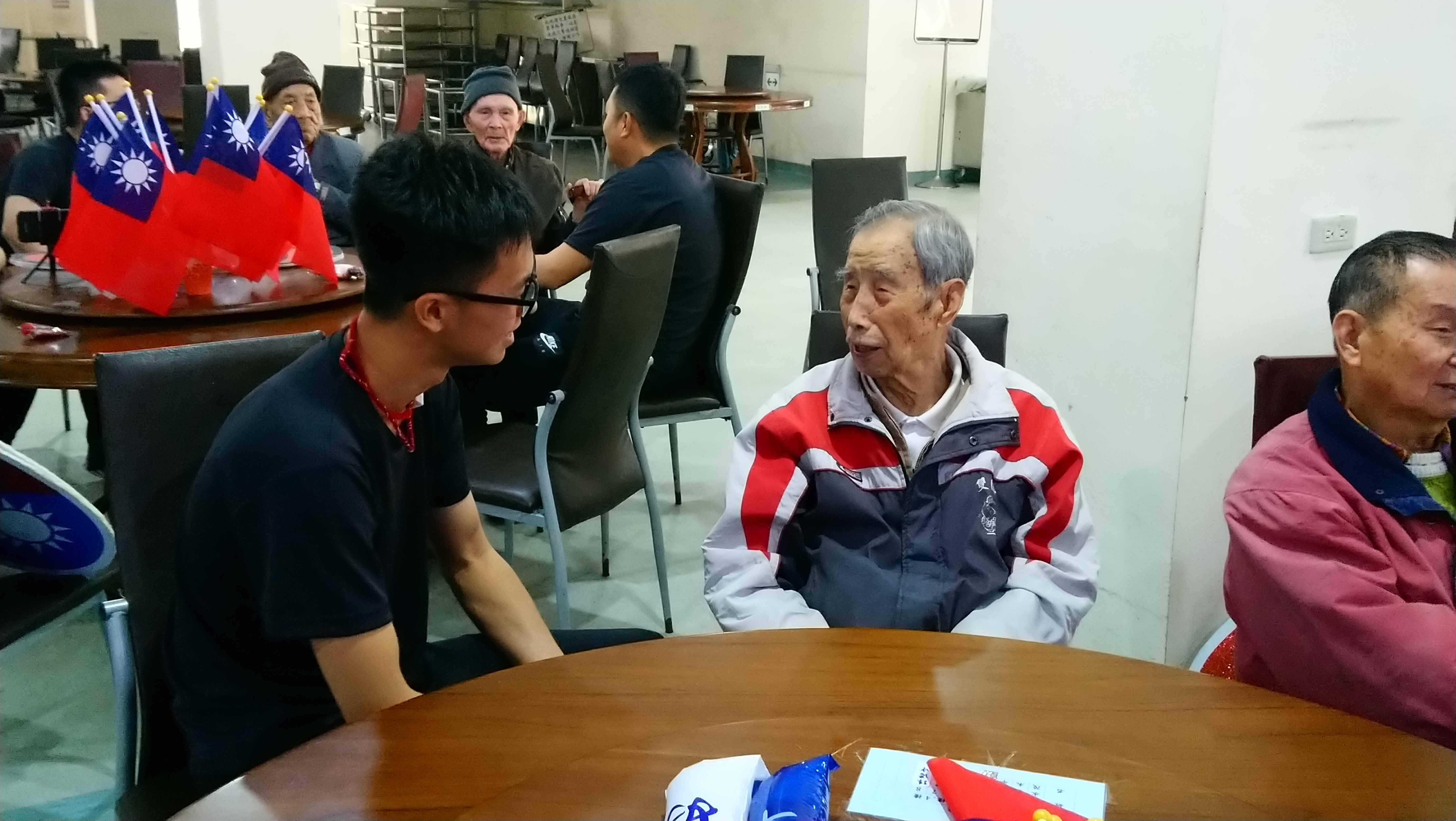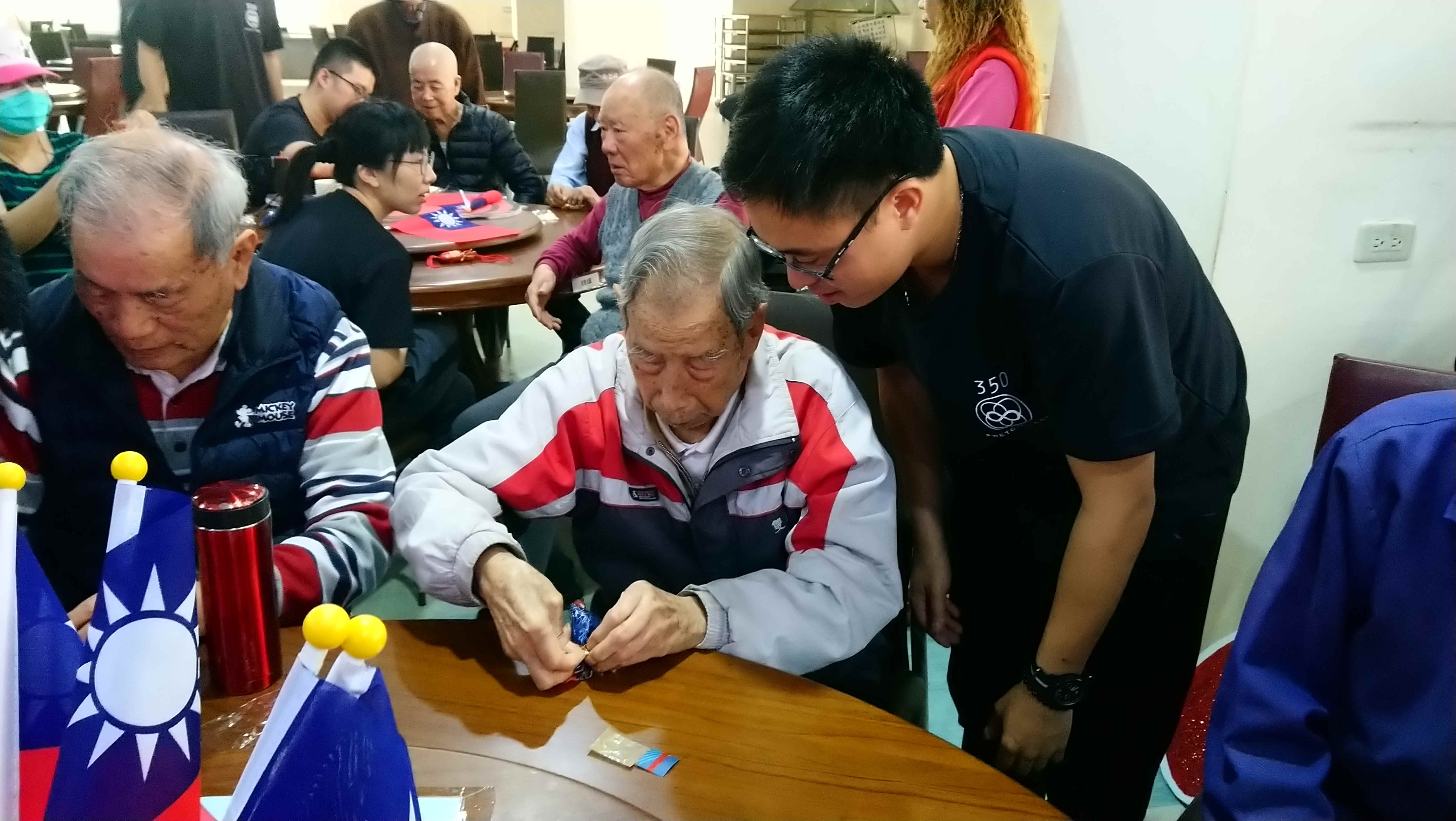 來的同學們都很熱情,讓活動場地瞬間熱鬧起來,一開場帶來健康操跟流行的<學貓叫>,希望陪伴長輩們一起活動,一起健康,接著製作手工香包,長輩們都很認真的聽著學生講解,不會做的時候學生們馬上提供協助,讓伯伯阿姨們都很開心,直說下次要多安排他們來,大家還玩團康遊戲<剪刀、石頭、布>跟<杯子遊戲>,雖然遊戲都很簡單,重點就是大家一起玩得樂趣,長輩們都被學生逗得笑呵呵,最後大家在<月亮代表我的心、老兵>的歌聲中,搖曳著手中的國旗歡樂結束。