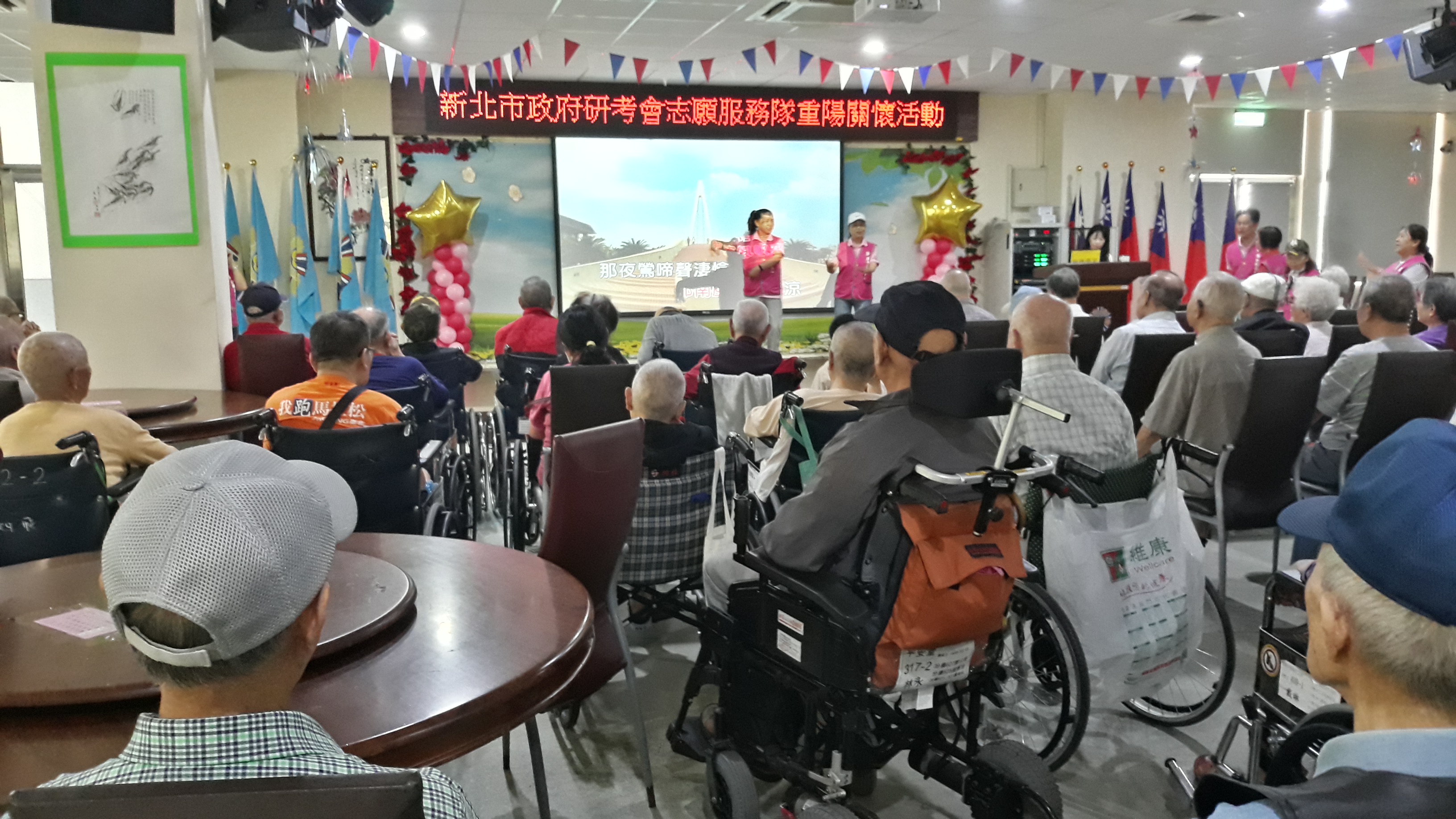 新北市政府研考會志願服務隊樂於服務,平日在市政府服務民眾之外,更號召大家一起來到榮家跟長輩同樂,提早預祝長輩們重陽節快樂。