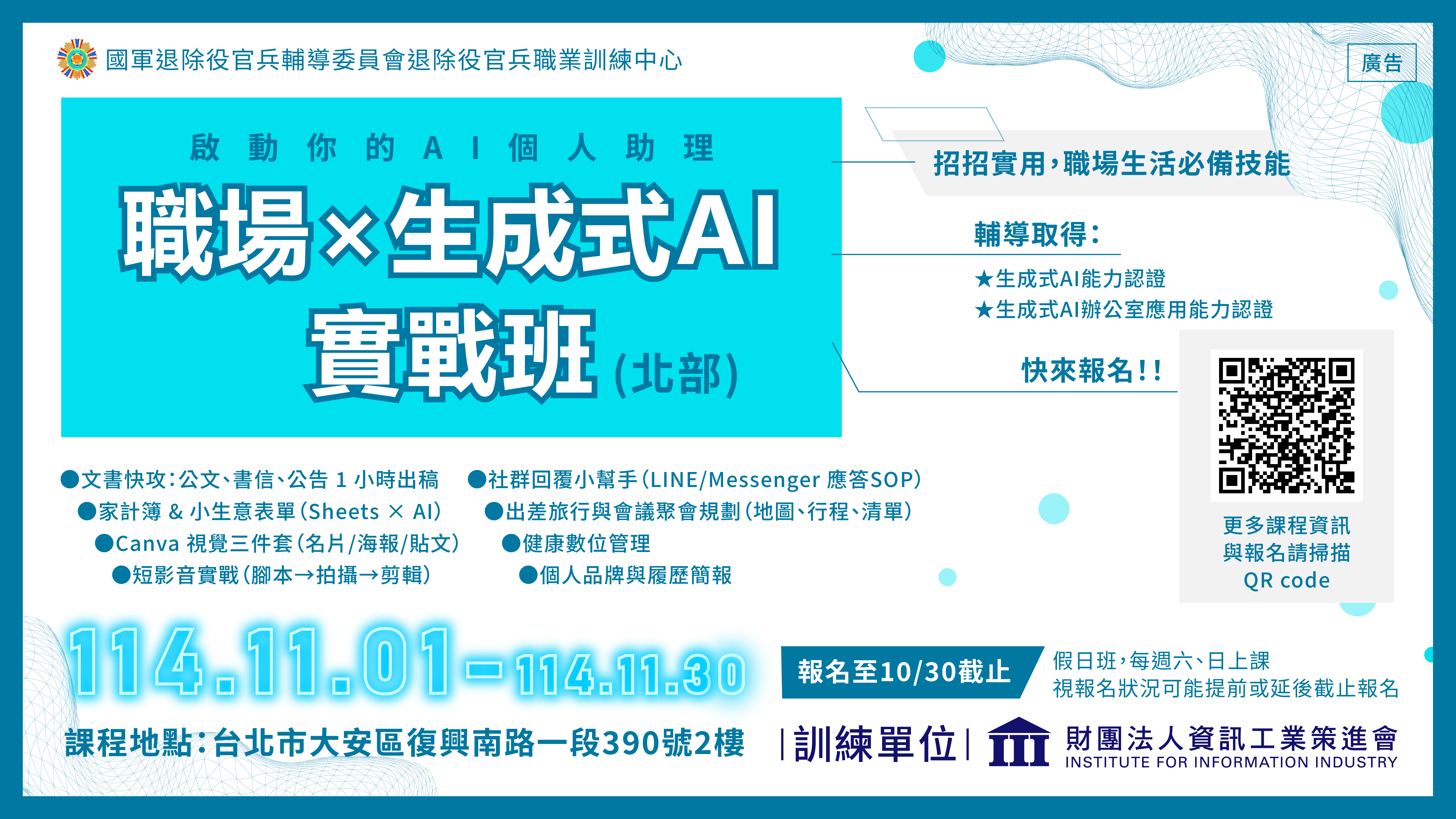 【退輔會職訓中心課程宣導-職場×生成式AI實戰班(北部)開始報名】
