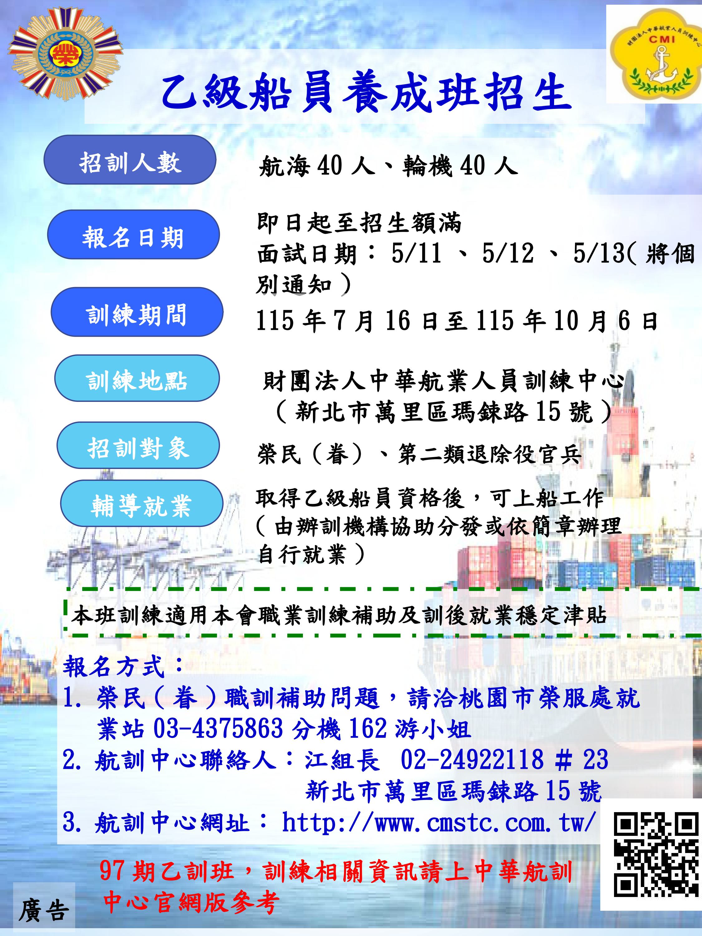 訓練單位:財團法人中華航業人員訓練中心(地址:新北市萬里區瑪鋉路15號)