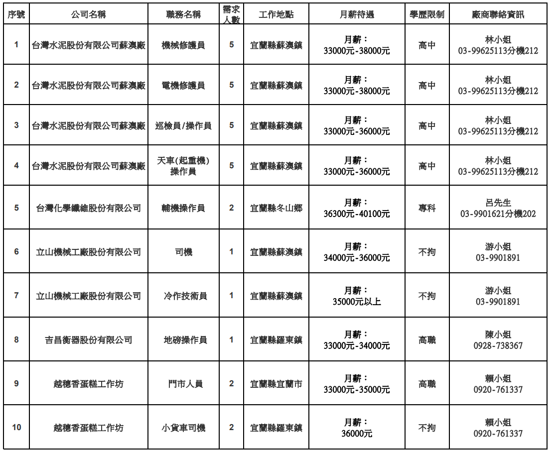 發布日期:114-10-28 資料來源:宜蘭縣榮民服務處 【宜蘭縣榮服處】廠商職缺表(114.11.03) 附件下載 檔案名稱 更新日期 下載次數 【宜蘭縣榮服處】廠商職缺表(114.11.03).pdf 114-10-28 1
