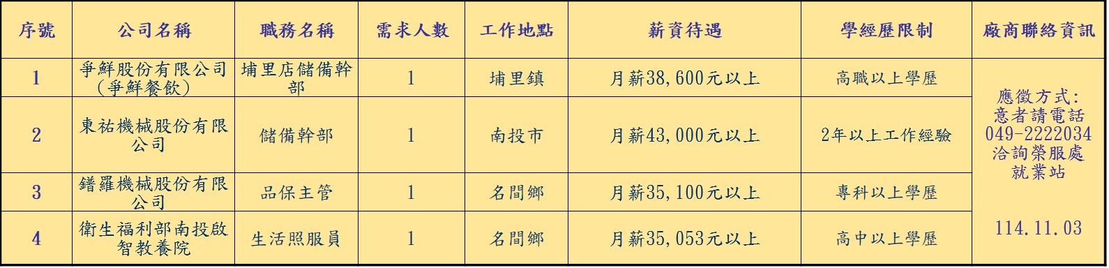 發布日期:114-11-03 資料來源:南投縣榮民服務處 【南投榮服處】廠商職缺表(114.11.03) 附件下載 檔案名稱 更新日期 下載次數 【南投榮服處】廠商職缺表(114.11.03).pdf 114-11-03 0