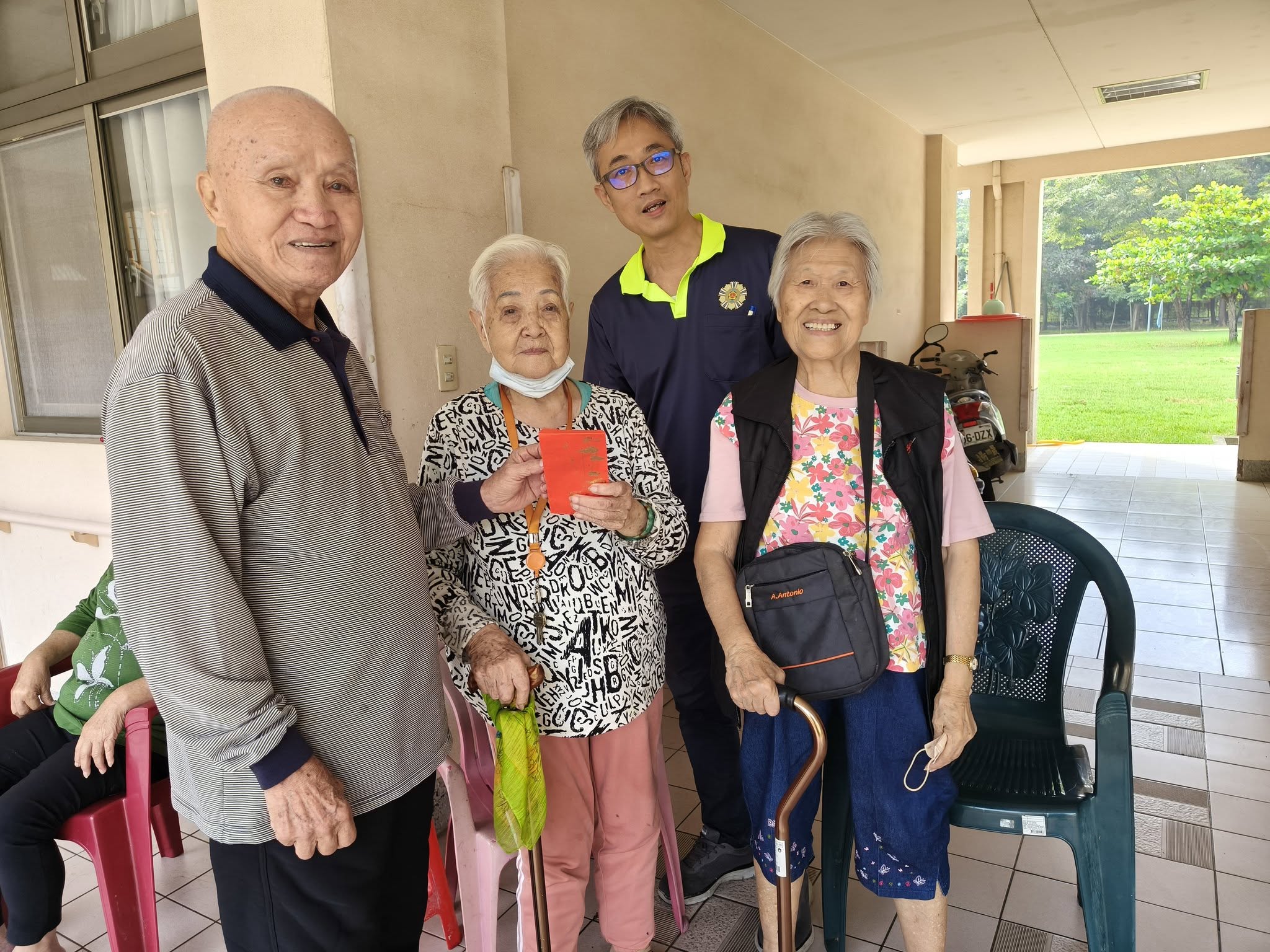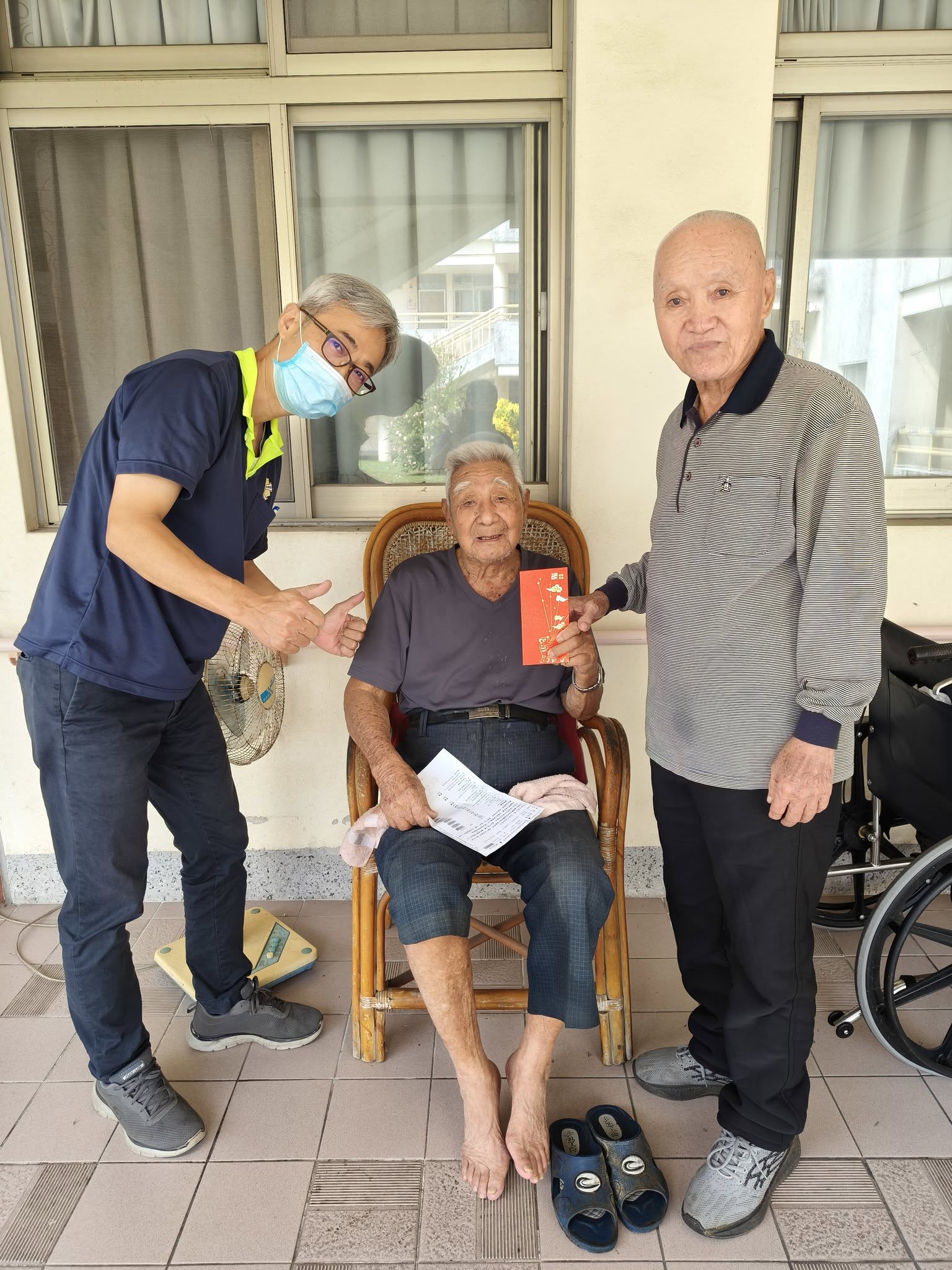 114.10.29育樂堂莊明雄長輩於重陽節特贈兩位百歲人瑞紅包致敬,表達敬老尊賢之意。兩位人瑞笑顏盈盈,莊堂長與長輩們一同合影,場面溫馨祥和,洋溢敬意與祝福