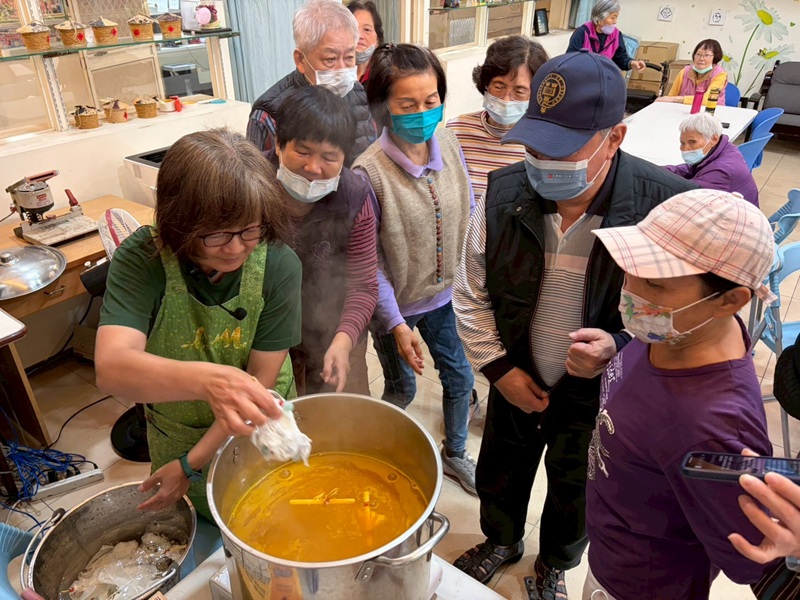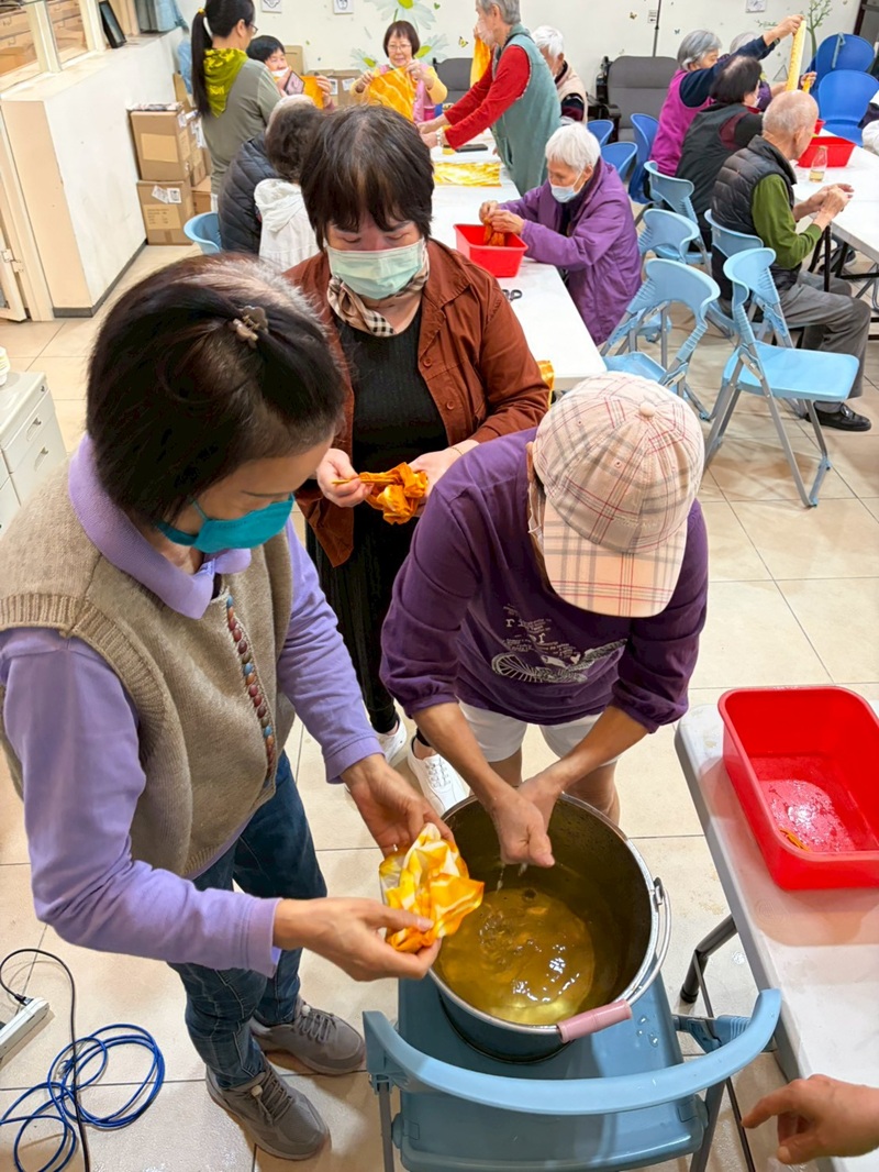 立冬時節,寒意漸濃,新竹榮家特別邀請施麗明老師,為安養堂的長輩們帶來一場溫暖又實用的「冬季薑黃好養生」課程!活動主軸圍繞著「薑黃染布暖身」與「薑黃雞湯暖胃」,陪伴大家用天然素材度過充滿暖意的午後。 老師在活動開始親切問候長輩近況,隨即引領大家體驗薑黃的雙重魅力。在創作區,鮮明柔和的薑黃色在布面上緩緩展開,長輩們在老師的指導下,專注體驗染色的每一個步驟,彼此分享心得與靈感。 另一邊的雞湯逐漸飄散出濃郁的香氣,老師與長輩們一同備料、攪拌,耐心等待湯汁滲透出薑黃的天然暖度。當熱騰騰的薑黃雞湯完成端上桌時,大家臉上都露出期待又滿足的笑容。 這個午後,長輩們不僅親手製作了溫暖的染布作品,也品嚐了暖胃的雞湯,身心皆獲得溫馨的滋養。新竹榮家期望在每一個季節,都能以陪伴與活動,為長輩們帶來一份生活中的小確幸與踏實的暖意。 相關照片
