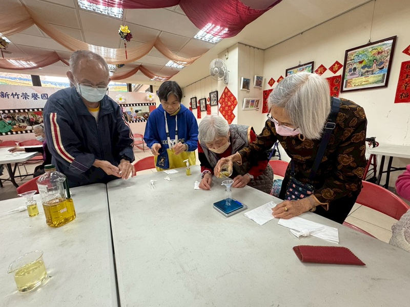 新竹榮家「樂智學堂」傳來陣陣清新香氣!為長輩們舉辦一場專屬的「樂齡芳療:保濕清潔乳DIY」課程,讓大家在暖冬時節,透過親手製作清潔用品,守護細嫩的肌膚。 基礎清潔從認識成分開始,活動中老師耐心引導長輩認識保濕與清潔的基礎知識。從比例拿捏到攪拌力道,長輩們戴上老花眼鏡,專注地盯著量杯,神情宛如嚴謹的化學實驗師。大家小心翼翼地加入保濕精華,期待著液體轉化為滋潤乳液的奇妙過程。 溫馨手作使職人精神的展現,爺爺奶奶們手拿攪拌棒,一下一下規律地劃著圈,臉上掛著知足且平靜的笑容。這不只是在製作乳液,更是在動手做的過程中,訓練手部靈活度與專注力。完成後,大家迫不及待地試擦,感受那份專屬於「手作」的觸感與天然芳香。 這份帶有溫度的保濕清潔乳,盛裝了長輩們的巧思與榮家的關懷。期待透過更多感官體驗課程,讓愛與健康在樂智學堂持續綻放!