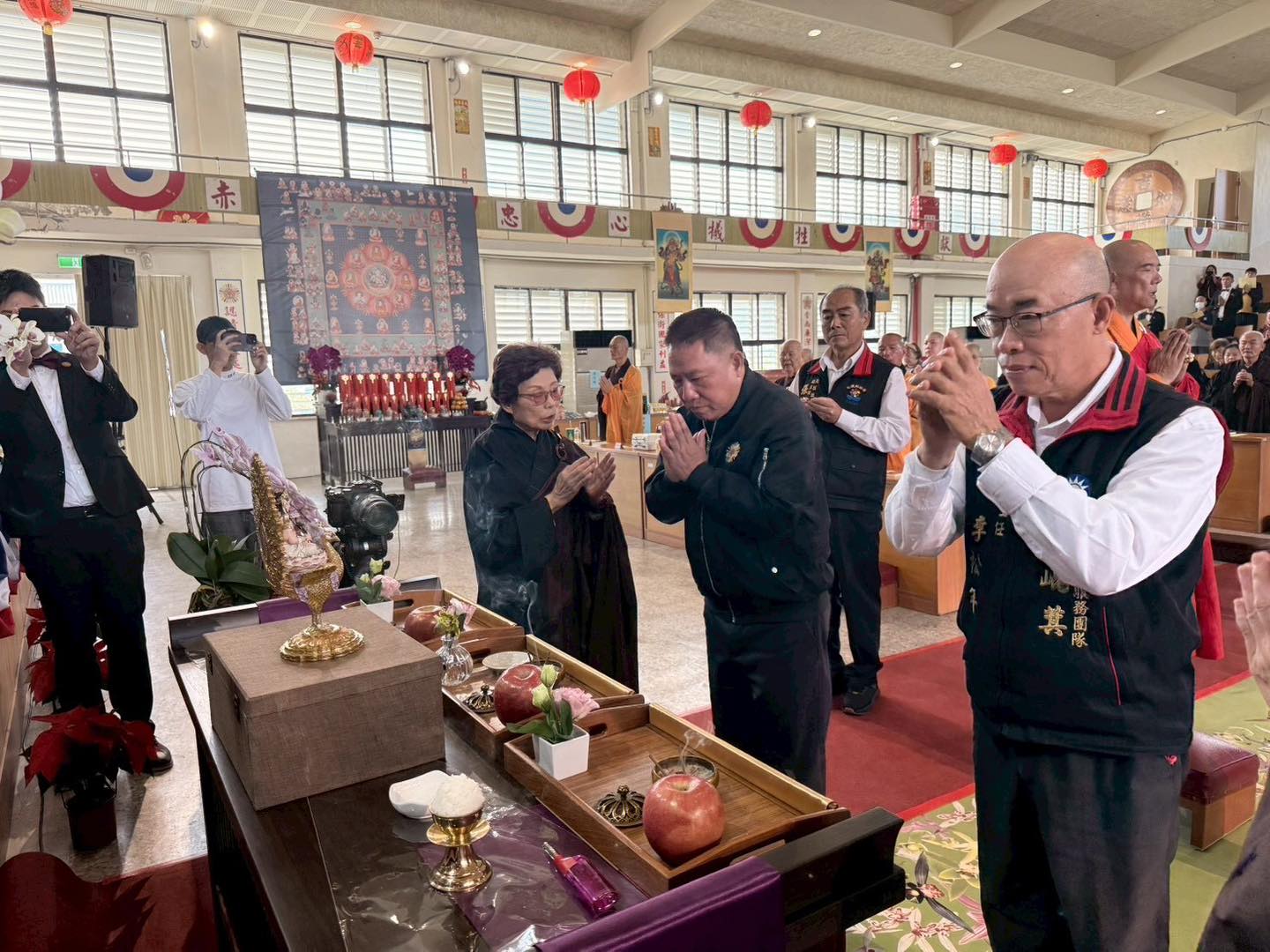 在法會正式登場前,一段溫馨的插曲早已感動眾人。12日下午,孔雀明王寺住持慈傑和尚便先行抵達榮家「榮靈堂」。慈傑和尚心繫歷年亡故的榮民英靈,特地舉辦了一場莊嚴的「煙供」儀式。在裊裊香煙中,和尚虔誠祝禱,將這份來自佛門的溫暖與功德,第一時間迴向並超薦長眠於此的先烈前輩,祈願亡者離苦得樂、往生淨土,展現了僧團對生者與亡者無微不至的關懷。