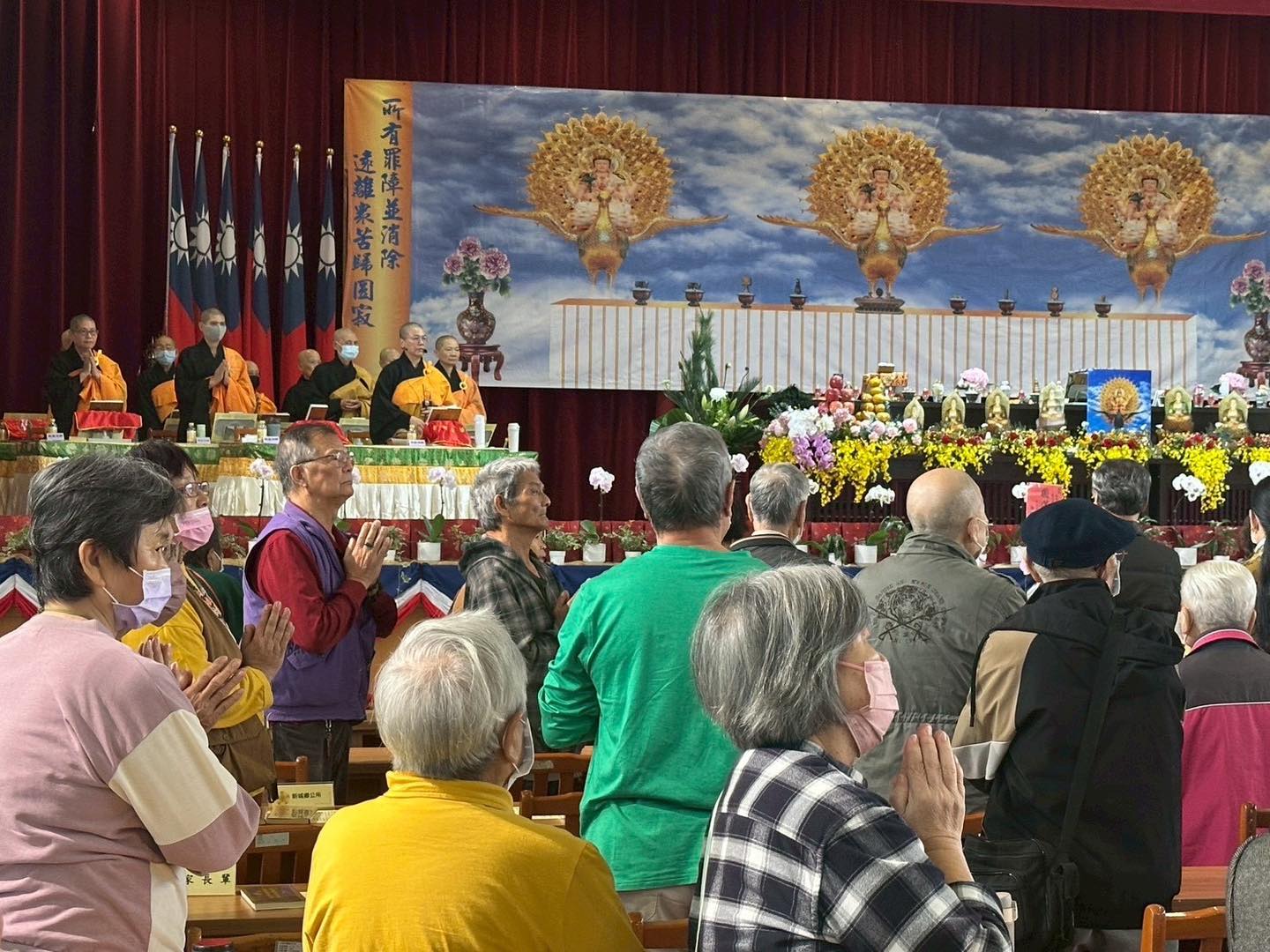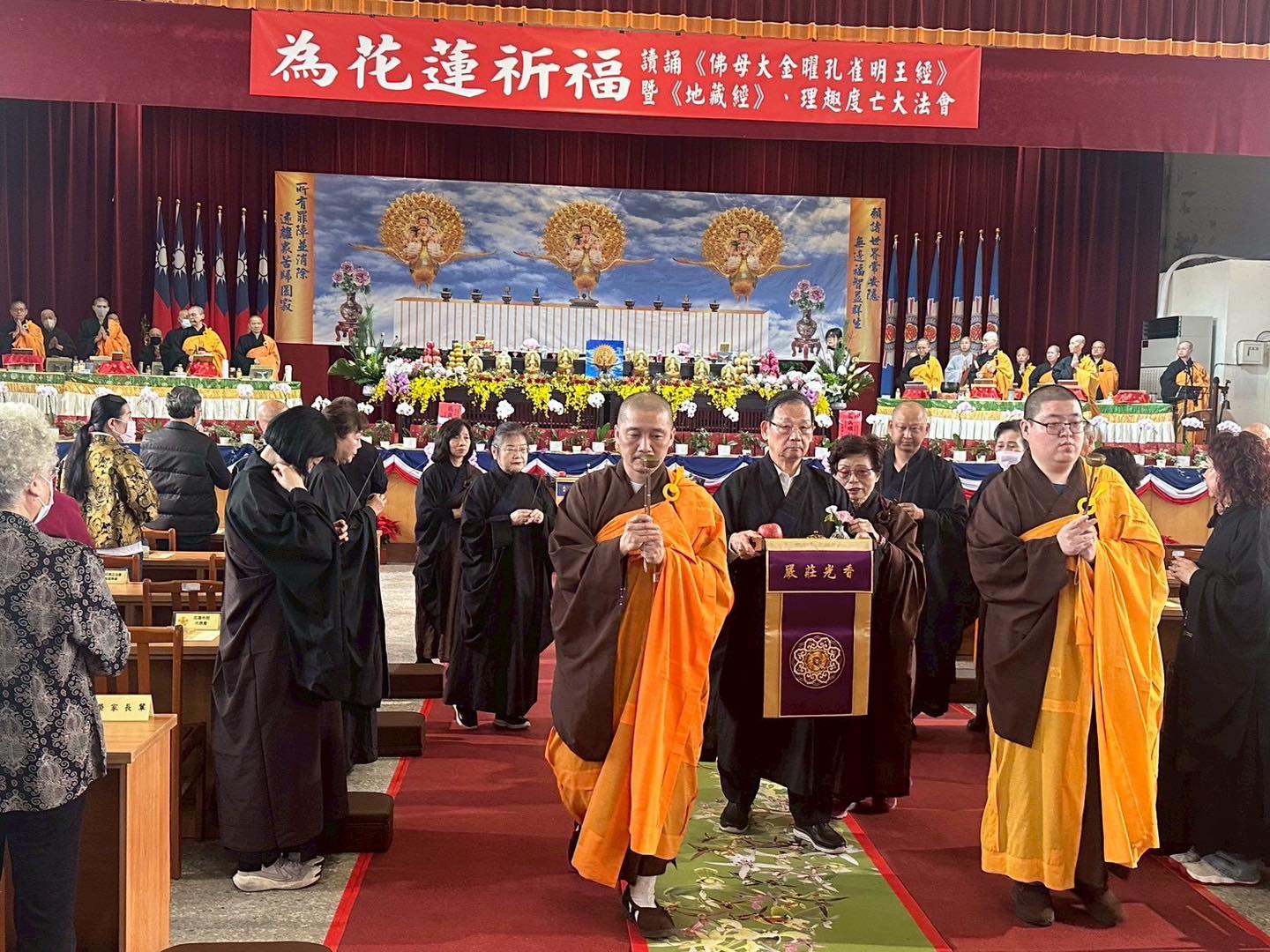 花蓮榮譽國民之家於12月13日至14日與孔雀山僧團聯合舉辦「為花蓮祈福讀誦《佛母大金曜孔雀明王經》暨《地藏經》、理趣度亡大法會」。本次法會因緣殊勝,匯集多位高僧大德共襄盛舉。首日活動現場嘉賓雲集,包括傅崐萁立法委員服務處主任李松年、林憶君立法委員服務處特助江躍辰、花蓮縣政府北區服務中心副主任張治華、花蓮市公所秘書陳瑱旻、花蓮市民代表會副主席黃達祥,以及新城鄉公所專員李紳旭等多位貴賓均親臨致意,與現場兩百多位住民及信眾共同雙手合十,祈求花蓮風調雨順、長輩身心安康。